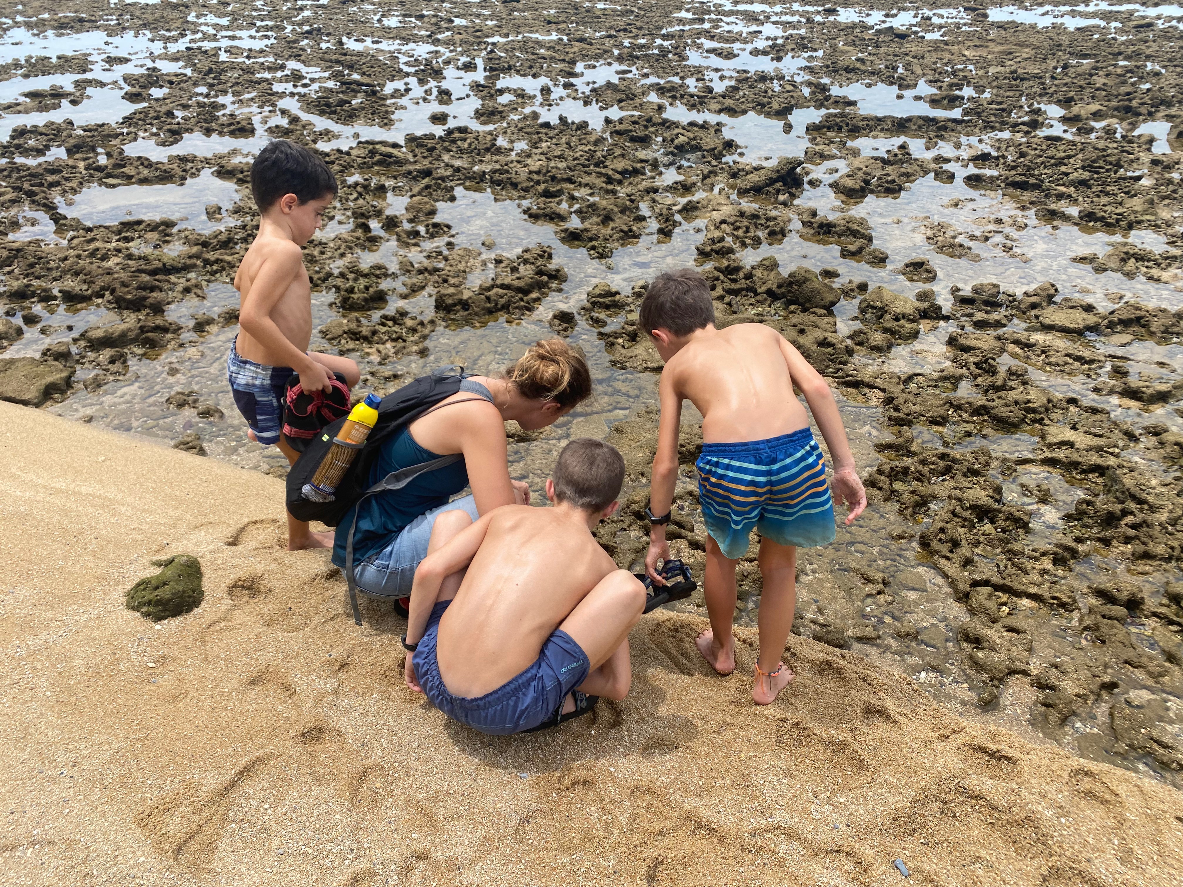 טוב, יומן מסע אמרנו.. אני משתדלת לכתוב כל שלושה ימים, בינתיים זה טווח זמנים שעובד לי טוב.. מצד אחד זה מרגיש מזמן, אבל מצד שאני כשאני מתחילה לשחזר זורם סבבה. אז שלשום :)… שלשום החלטנו ללכת לאיבוד! שכרנו רכב אז אפשר, וזה לגמרי נשמע לנו כיף ומשהו ללמד את הילדים שאפשר בעולם של גוגל-מפות ו-וויז. בסוף זה לא ממש היה ׳ללכת לאיבוד׳ אלא יותר משהו כמו ללכת לאיבוד אבל בכיוון של להסתכל על החופים הדרומיים אלינו. כל השבוע וקצת שאנחנו פה, היינו רק באיזור שלנו וצפונית לו ועכשיו מאוד התחשק לנו לראות את מה שדרומית לנו.. וככה היה, נסענו, טיפסנו על הרים, וירדנו בחזרה לגובה הים, מצאנו חוף ׳סודי׳ שהיה בשפל והים רחש חיים, סוגים של חלזונות זחלו להם במים ודגיגים כחולים וירוקים קטנטנים ועוד כל מיני קטנטנים, והסרטנים פה.. אין להם סוף. ומלא שרידי אלמוגים (עופר רוצה למצוא אחד אדום..). היה מקסים. חוץ מזה היו סלעים גדולים בקצה החוף שעידו רצה לטפס עליהם. שניה לפני שטיפס על אחד, עופר אמר לנו באגביות שדווקא כדאי שהוא לא יטפס לשם, כי יש שם תנין.. זה היה נשמע קצת תלוש, אבל הסתכלנו יותר טוב, וגילינו לטאת כח ענקית מנמנמת בין הסלעים, ממש איפה שעידו תכנן להתחיל ממנו.. ירדנו מעניין הטיפוס, והלכנו שניה לצל, לקרוא על לטאות כח..