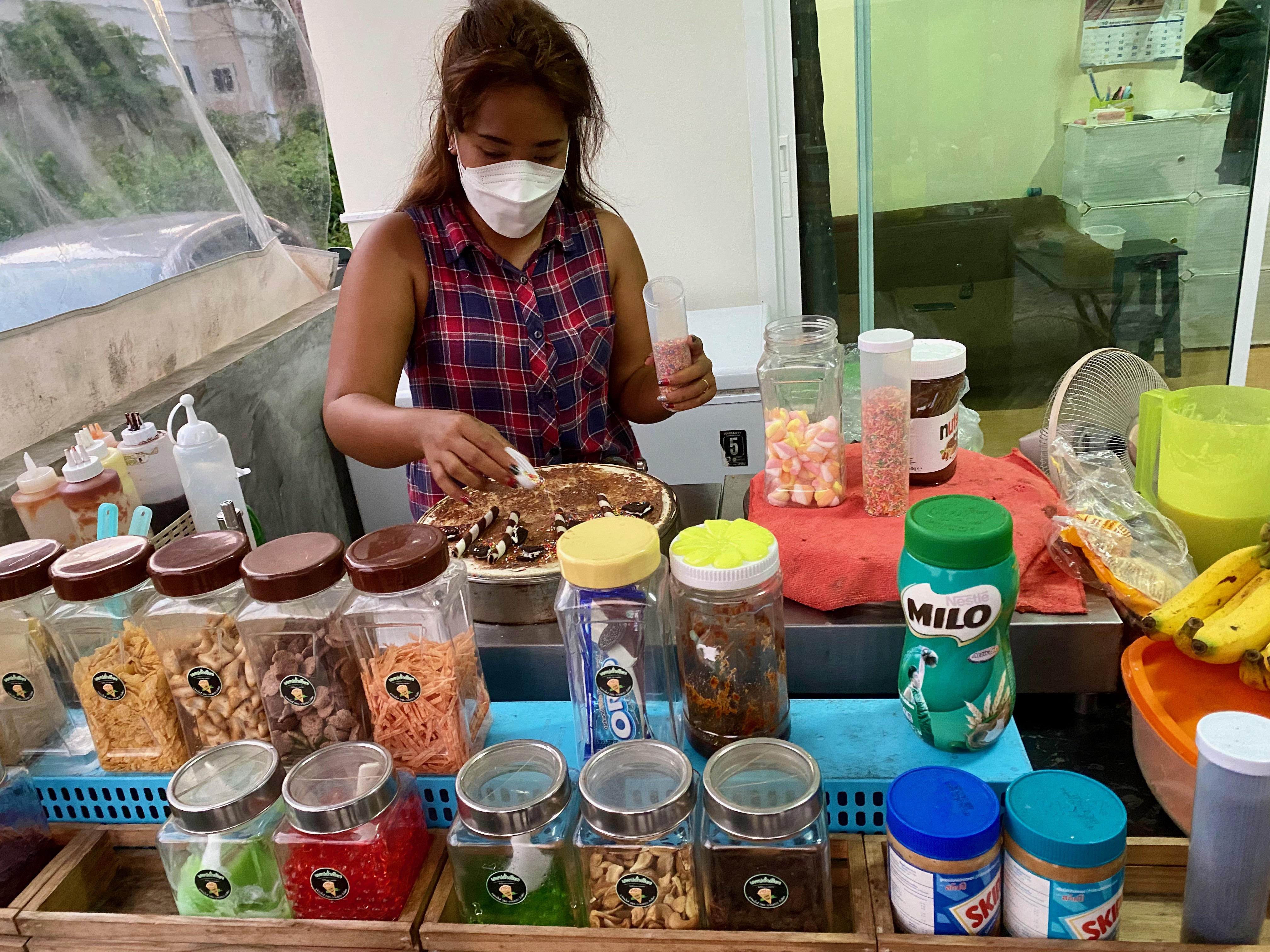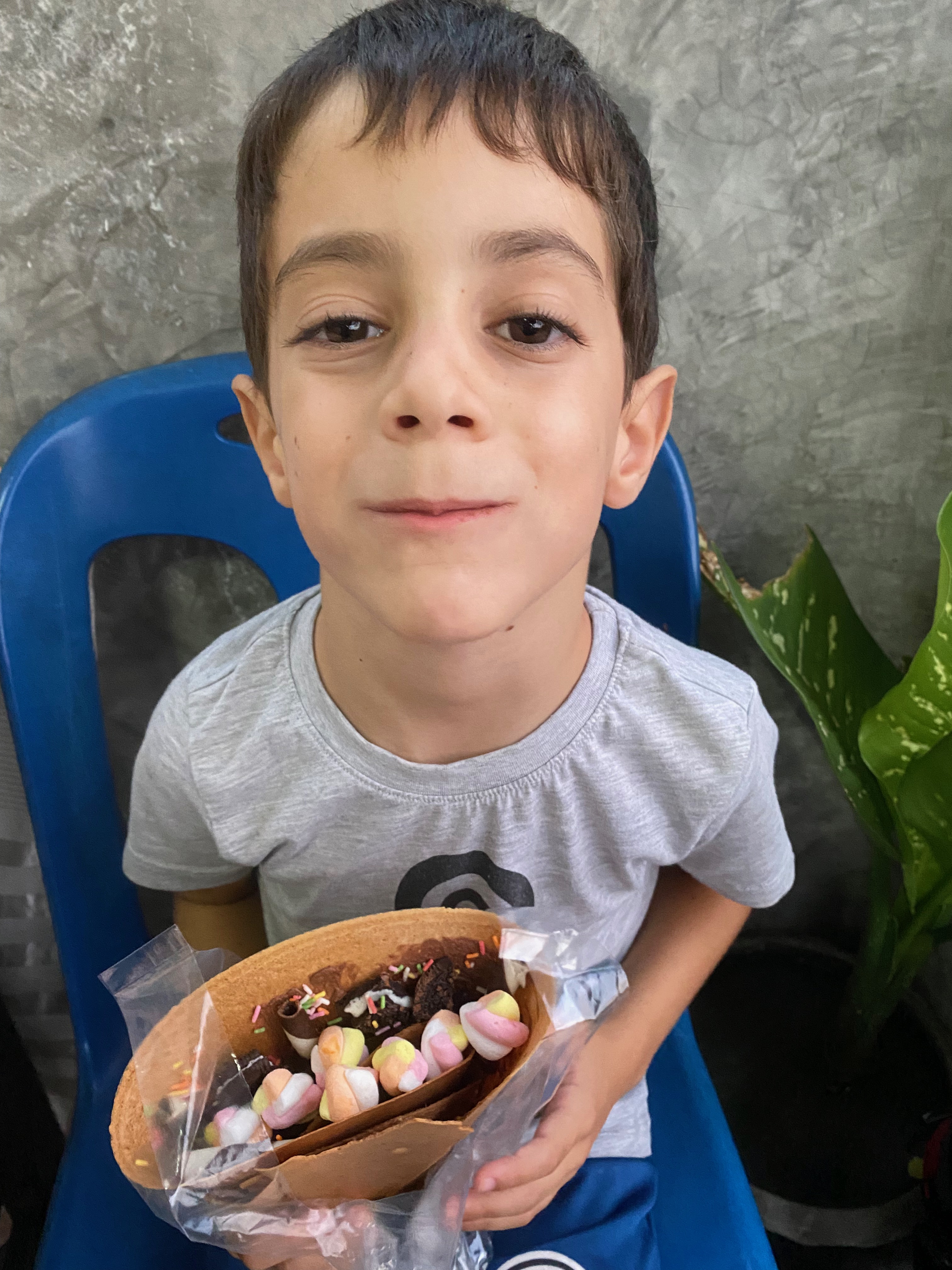 כשהגענו לפה, קודם התרשמנו מהמלון, חקרנו אותו קצת, הילדים עפו על ההליכונים בחדר כושר, ואחר כך יצאנו לרחוב ליד. היו כמה מקומות סגורים משום מה כי יום שני היום, אבל מצאנו מישהי שיש לה דוכן קרפים מחוץ לבית, ועשינו ארוחת ערב מפנקת ומלאה בסוכר..
