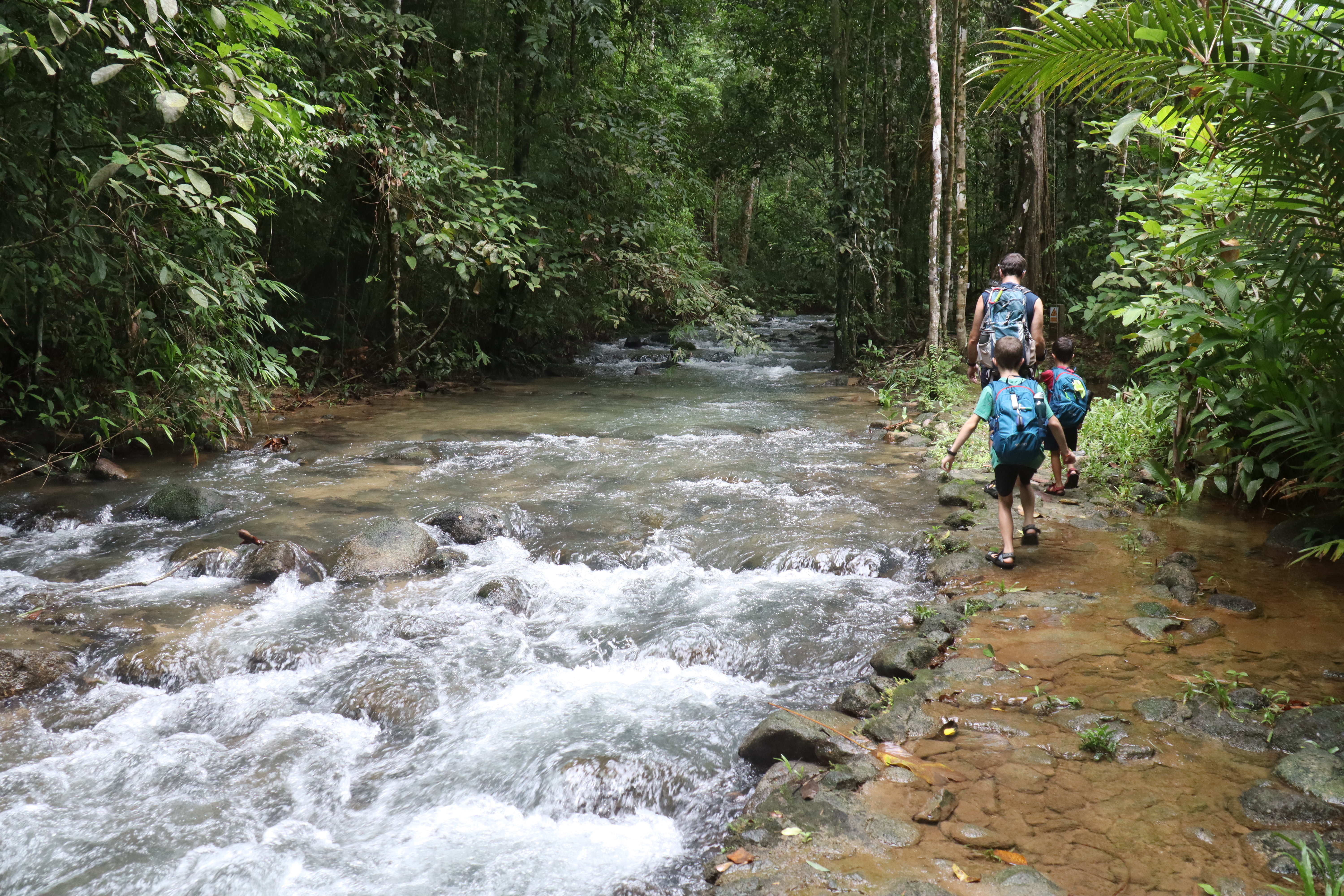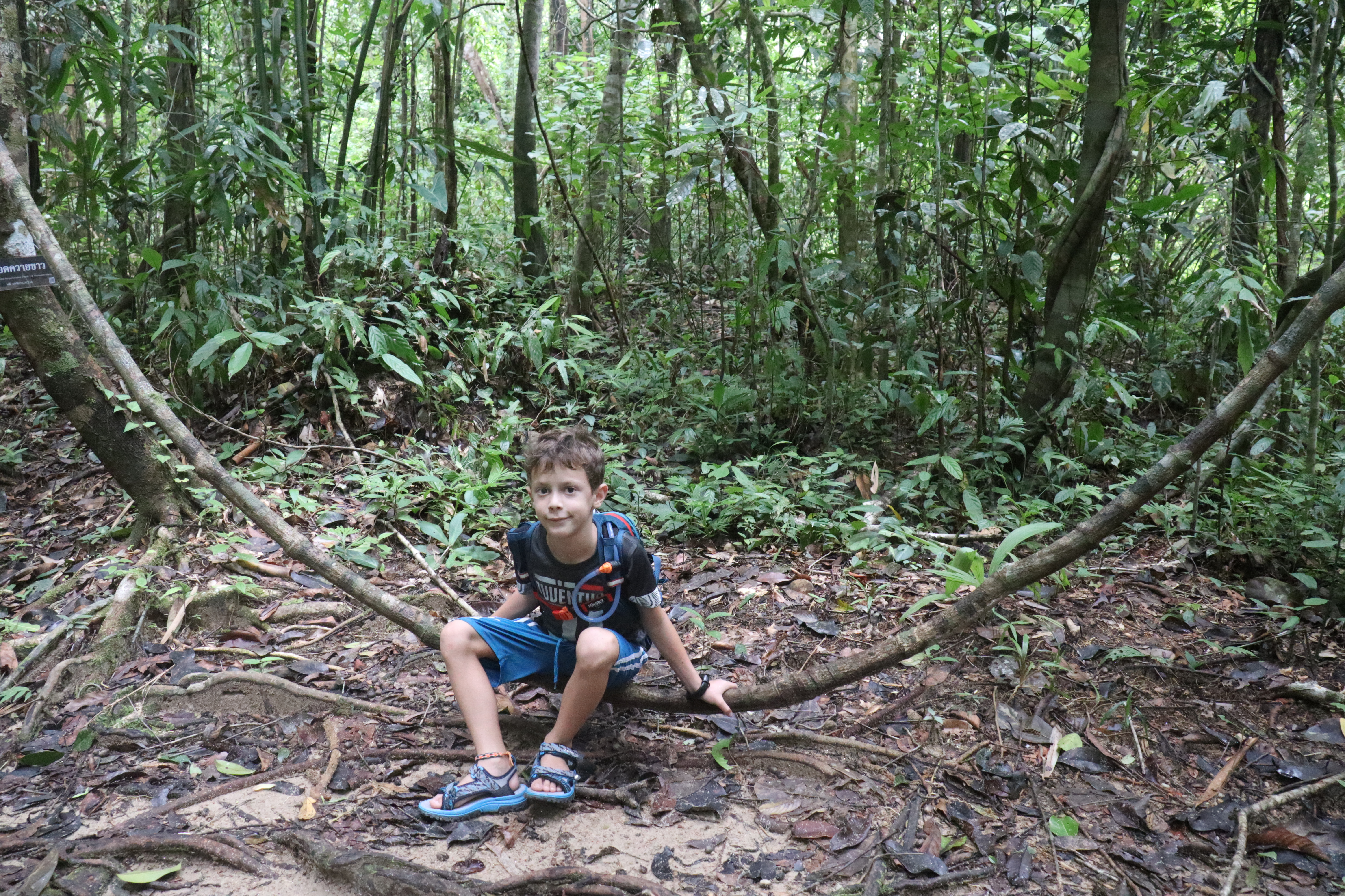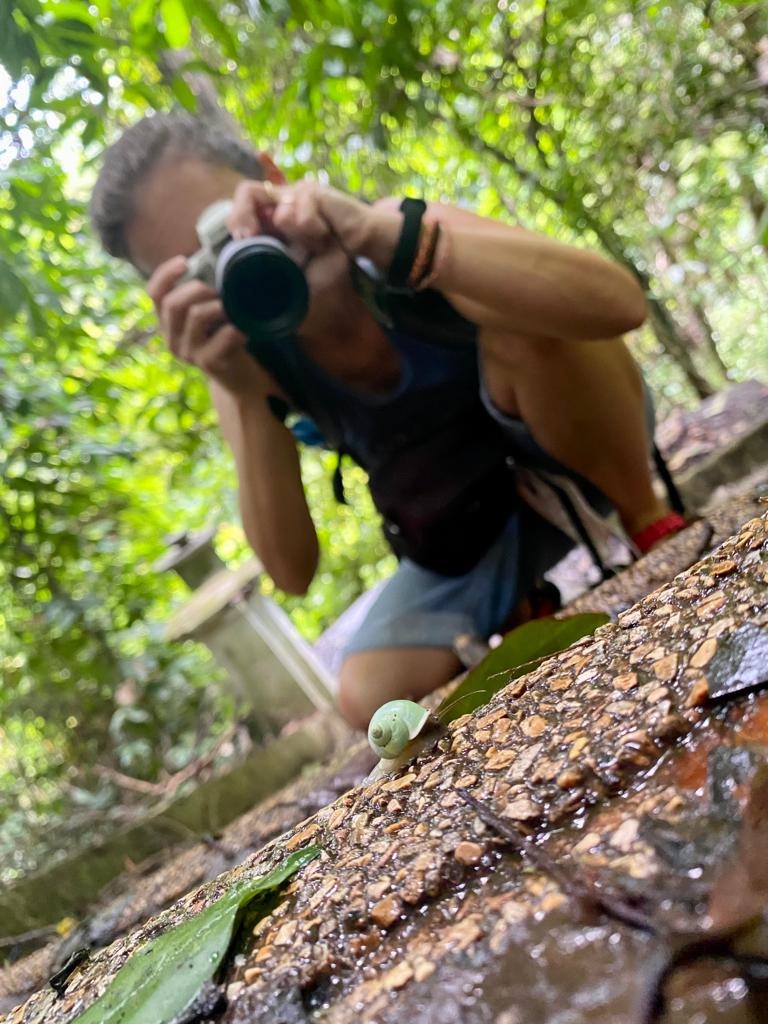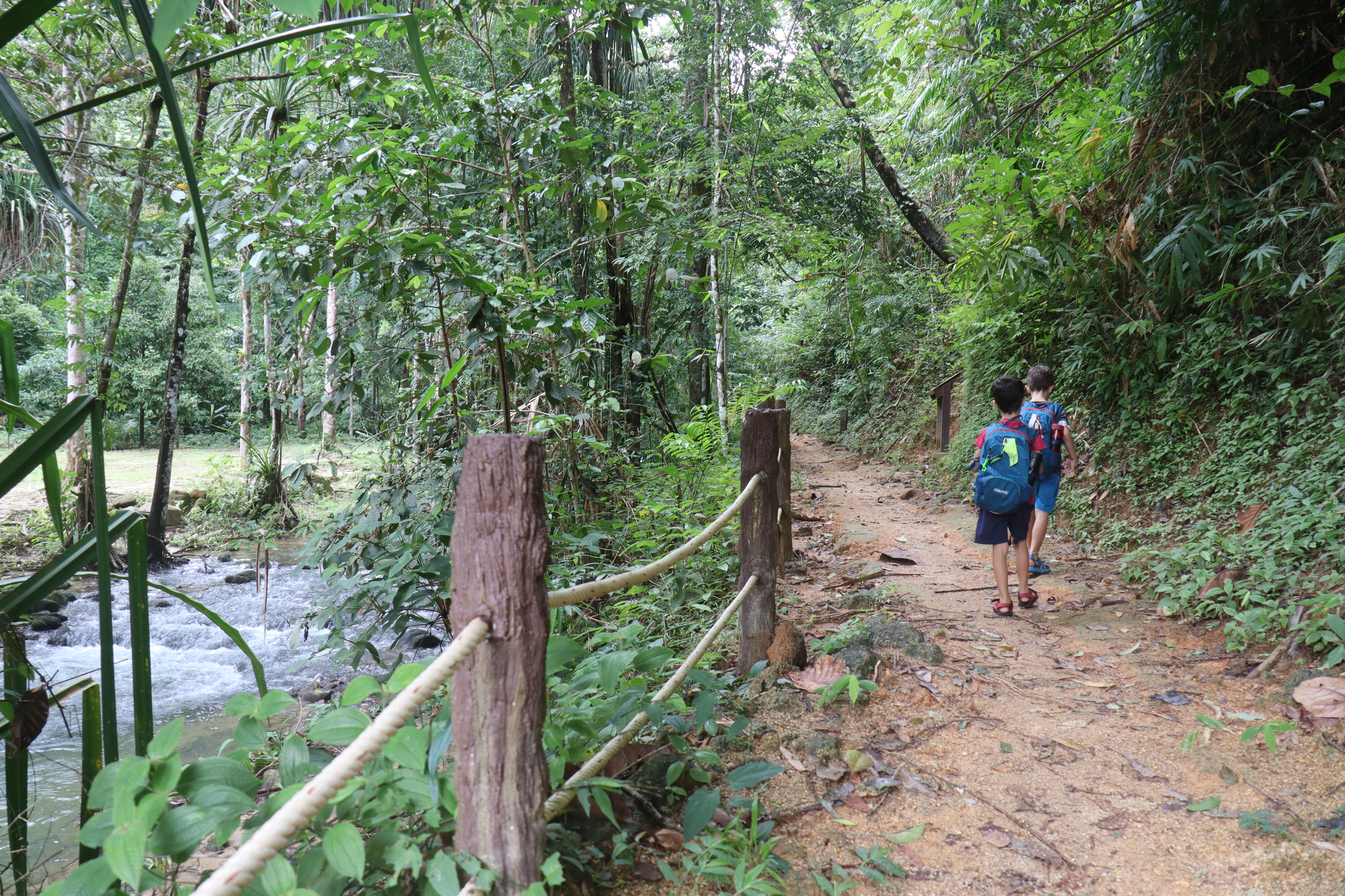 ג׳ונגל מדהים, שורשים של עצים בכל מקום, ליאנות שנראות כמו שורשים שנופלים מעצים אבל מסתבר שזה עץ בפני עצמו שמטפס למעלה בצורה מסולסלת, במבוקים.. הנחל זורם יפה והכל מהמם. בערך אחרי 450 מטר, עופר אמר שהוא מצא ייצור מגניב ממש.. על עמוד של הגדר שתוחמת את השביל המסודר יש ייצור שהולך בצורה מאוד מצחיקה.. מצמיד את הזנב לראש, ואז מרחיק את הראש וכך מתקדם.. הסתכלתי עליו וניסיתי לשמור על קור רוח כשאמרתי באגביות שנראה לי שזו עלוקה.. עוד המשכנו בטיול ממש טיפה כשראינו עוד כמה יצורים מגניבים כאלה.. ואז הכל נהיה לא מגניב.. בדיוק בזמן שכבר מתחיל להיבנות לחץ וחושבים על לחזור אחורה, עופר זיהה יצור מגניב מטפס על הסנדל שלו, ובזאת נהיו לנו 3 ילדים בהיסטריה קופצים וצורחים שהם רוצים לחזור בריצה חזרה לאוטו. עכשיו גם אני לא ממש רגועה כשאני רואה עלוקות.. אבל הצלחתי לשמור על איזו ארשת רגועה, כשגל מסביר להם שאם נרוץ עכשיו למטה בהיסטריה, הסיכוי שמישהו יחליק בשביל החלקלק מהגשם הרבה יותר גדול מאיזהשהו נזק שיכול להגרם מעלוקה.. אחרי שהצלחנו לגרום לכולם לנשום בקצב סדיר, חזרנו על עקבינו (בהליכה מתוחה). הילדים חזרו לשחק עם הדגים ולהרגע.. ואנחנו התחלנו לחשוב על המשך צעדינו, כי היעד שאחרי הקרוב שלנו אמור להיות קאו סוק, ושם ידעתי שיש עלוקות..