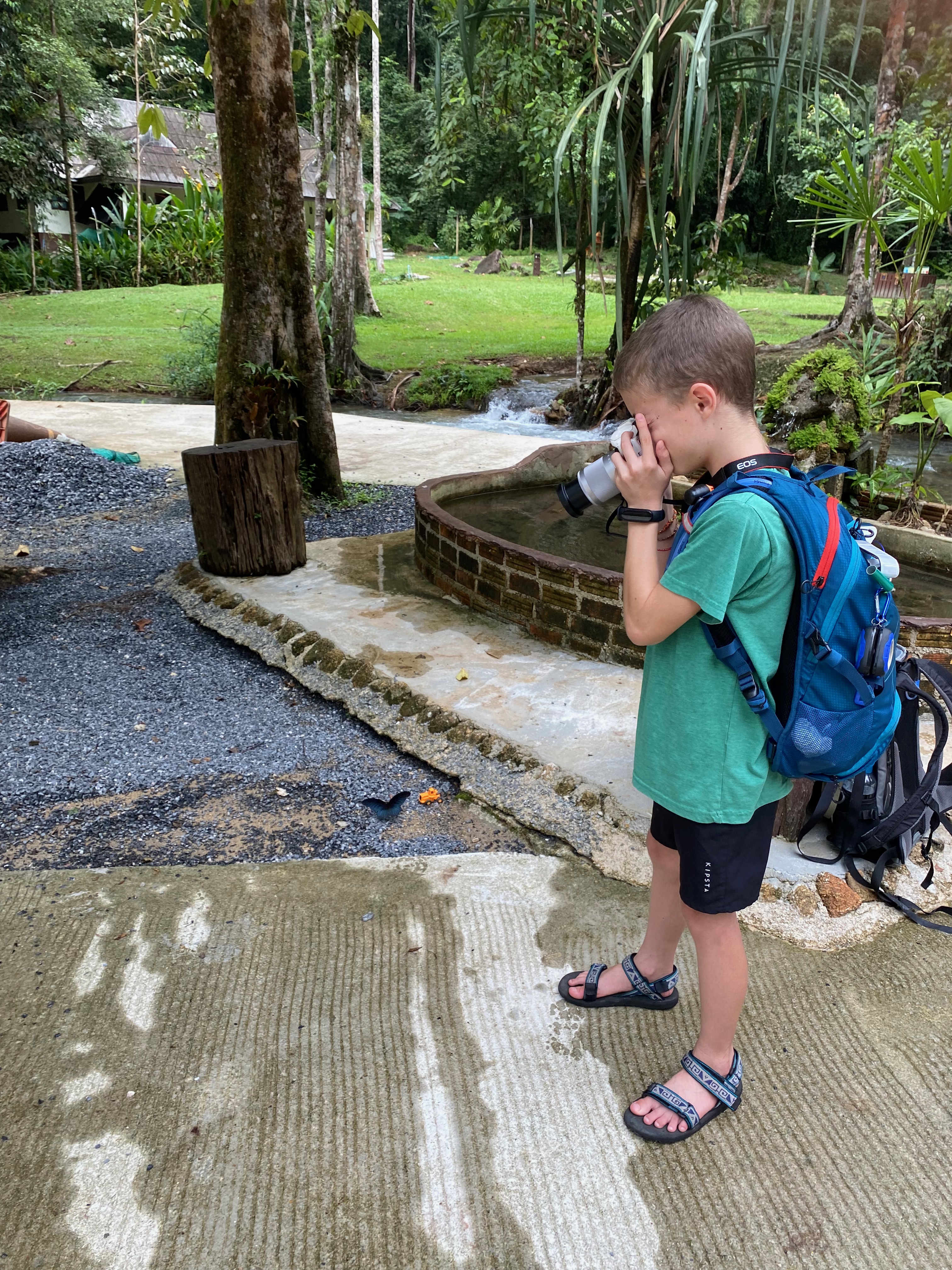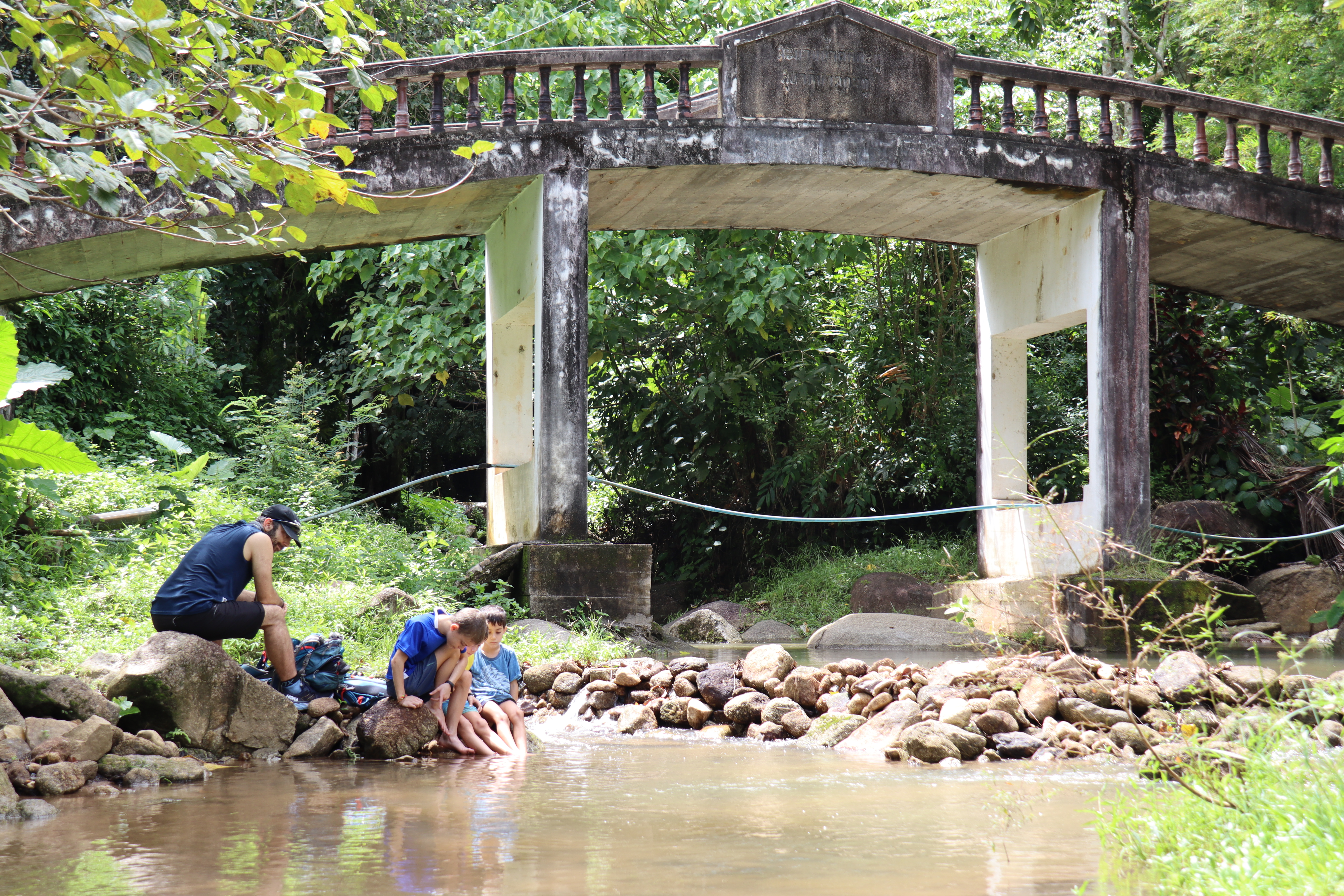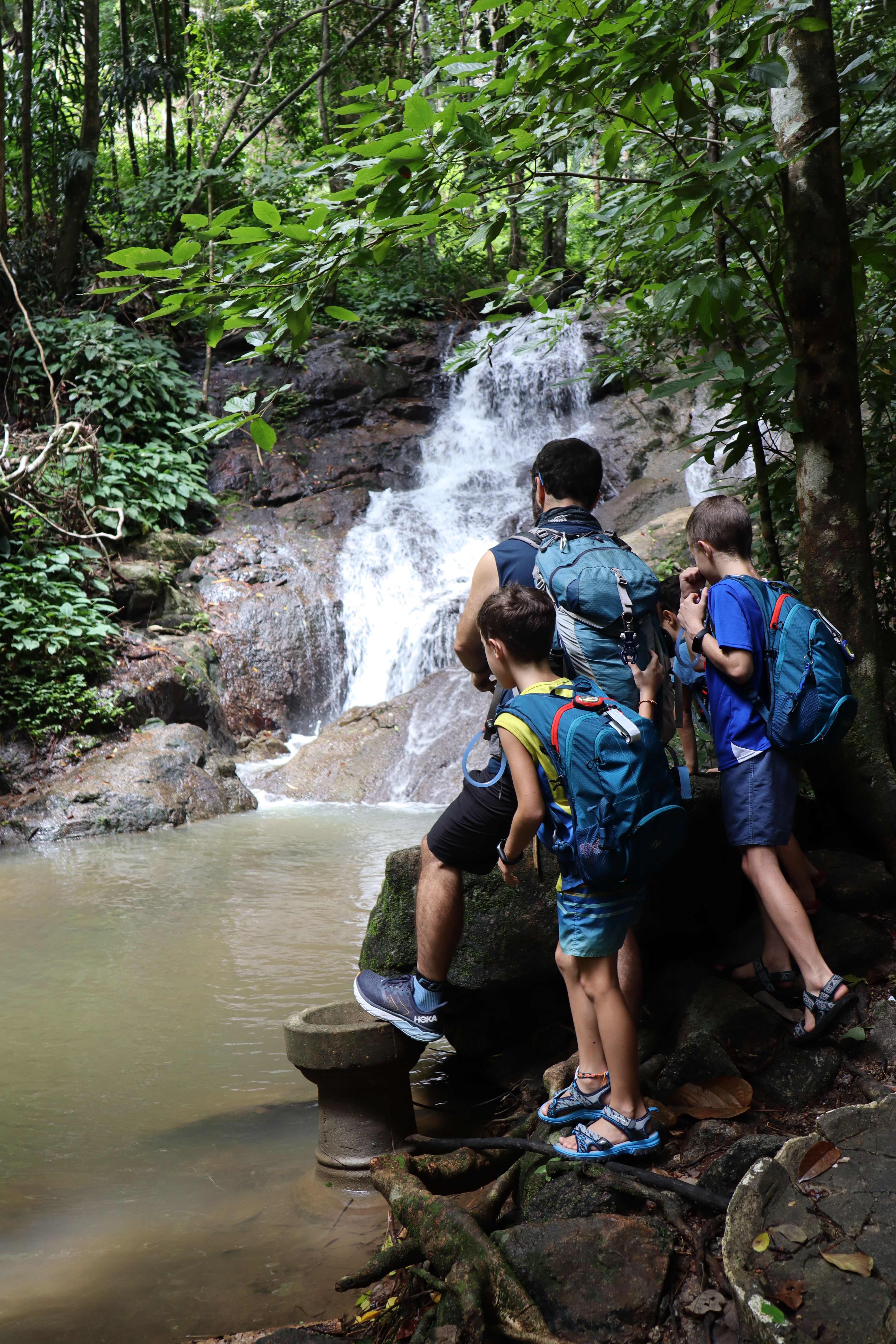 התחלנו במפל קא-טו, זה מפל שיותר מגיעים אליו בפוקט, כי הוא יותר קרוב לדברים אחרים, אבל בתקופה זו כמובן שהיינו שם עדיין די לבד. יש מלא מדרגות שמובילות אליו, וכמה בריכות שאפשר להשתכשך בהן בדרך, ואנחנו האמת בעיקר רצינו לבוא לפה בשביל עוד איזה תרגול ג׳ונגלים נח לילדים.. שמחנו לגלות שאין מתנגדים בקהל, ויצאנו לדרך. טיפסנו כמעט 500 מדרגות, עד שהתחילה להשמע התנגדות.. אז ירדנו בחזרה והשתכשכנו בנחל למטה. הילדים מצאו שם מלא דגיגונים ושיחקו איתם בעניין וסבלנות, כשהדגיגונים עושים להם מסאג׳ באצבעות..