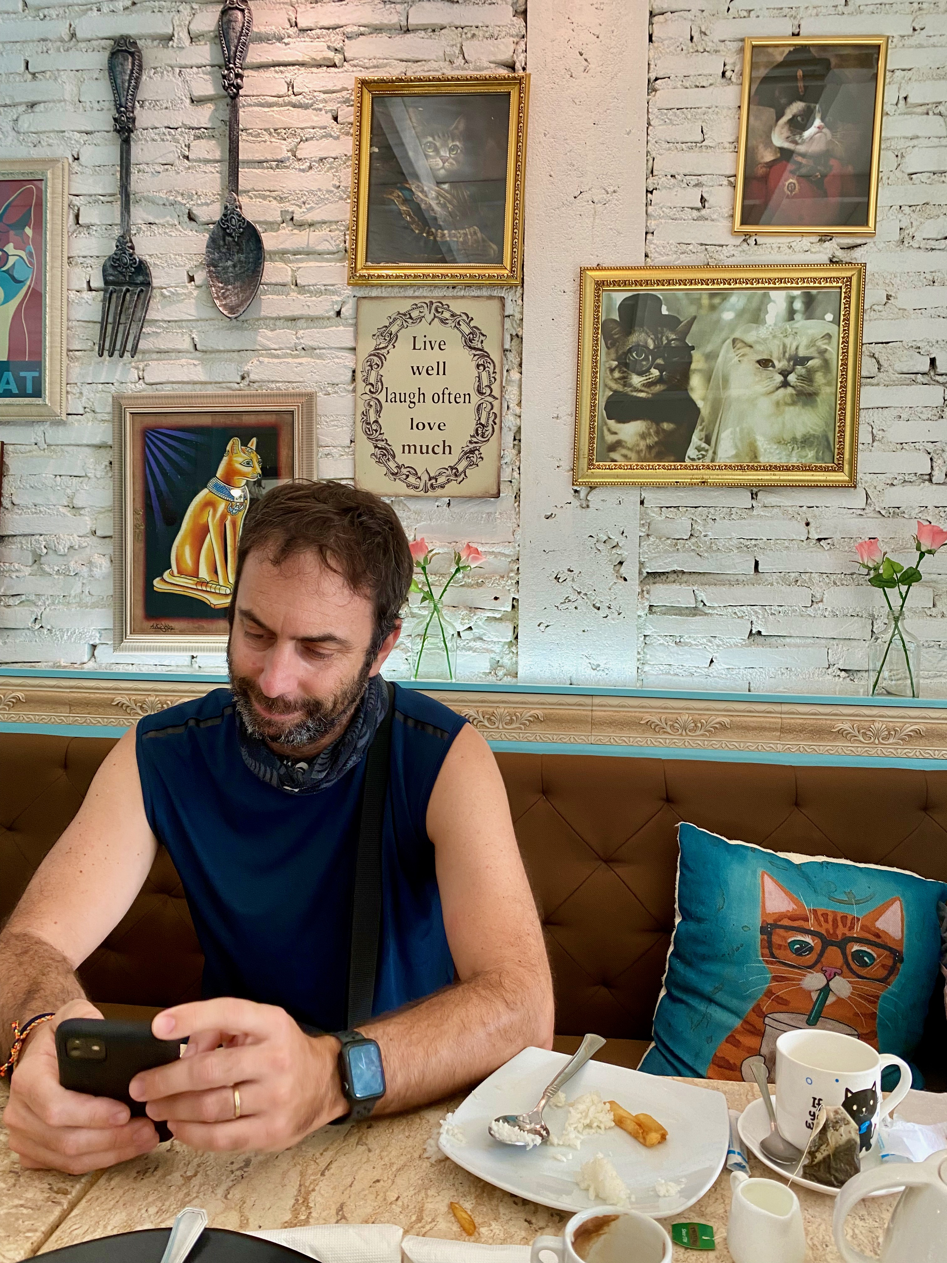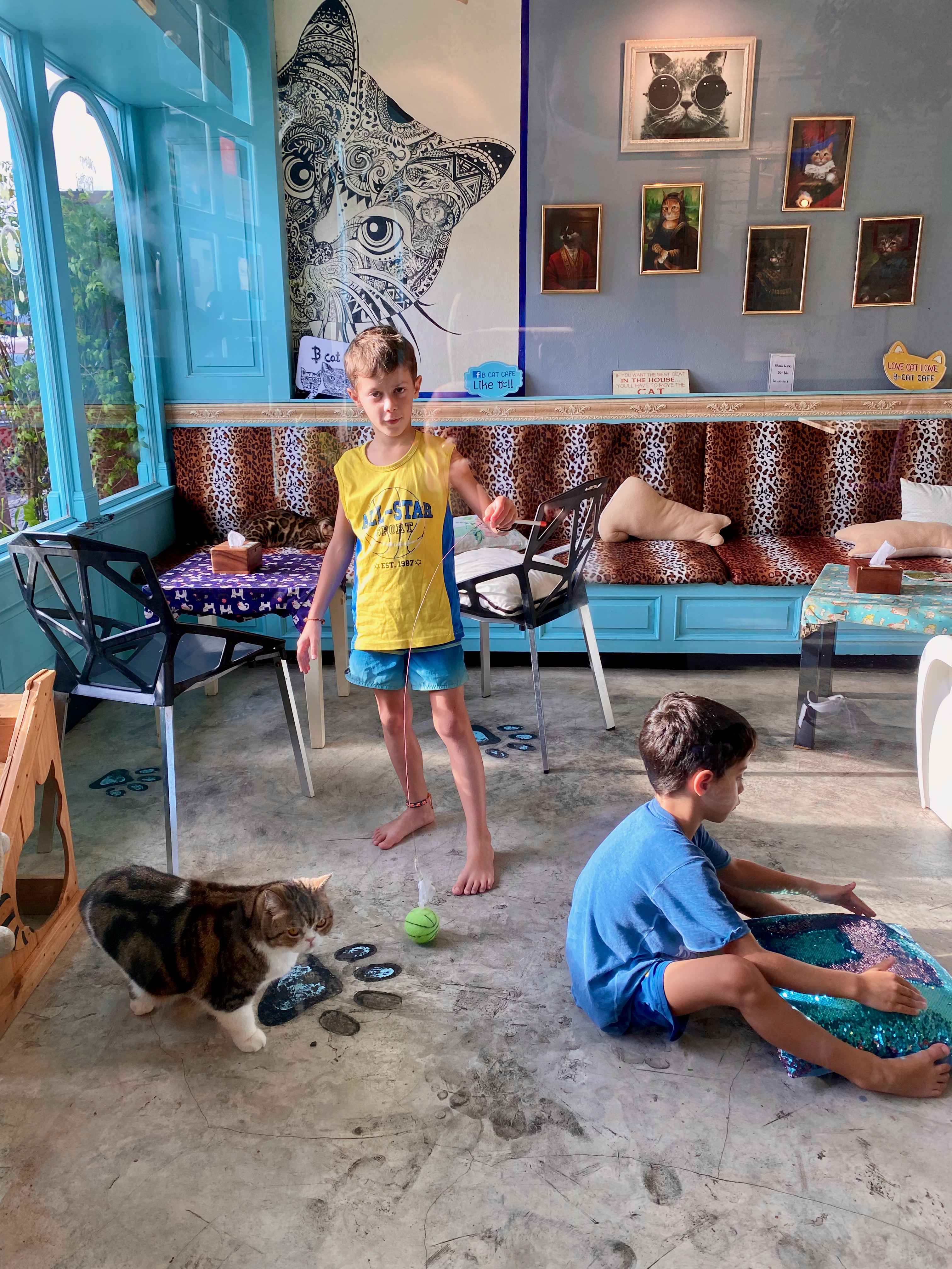 משם המשכנו לאולד פוקט, העיר העתיקה של פוקט, שנראית כאילו היא מסרט אחר ולא מתאילנד… בתים צבעוניים, נראה משהו אמריקאי ישן כזה.. אנחנו כיוונו לבית קפה שקראנו שיש בו הרבה חתולים, ועומרי מאוד אוהב חתולים, אז החלטנו לפנק אותו..