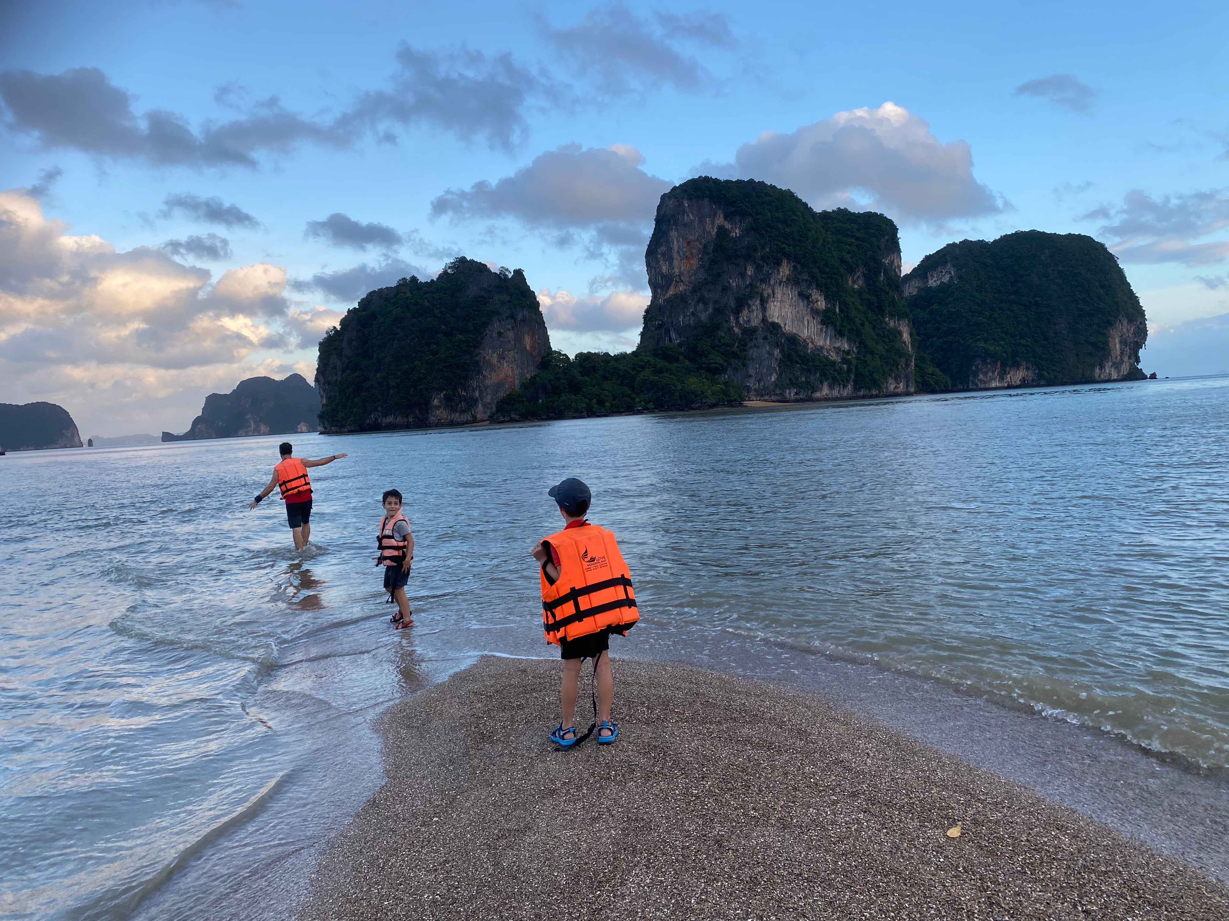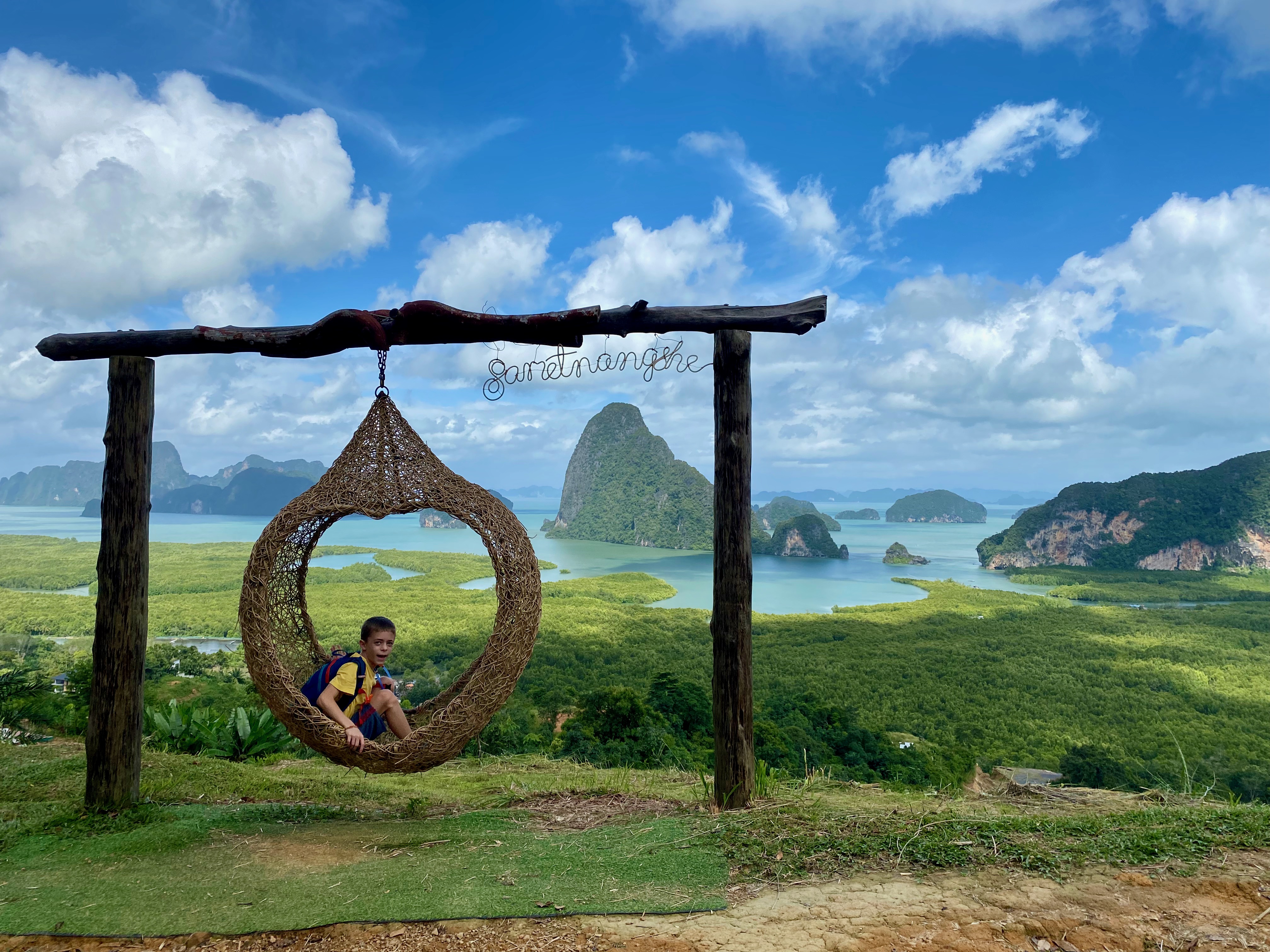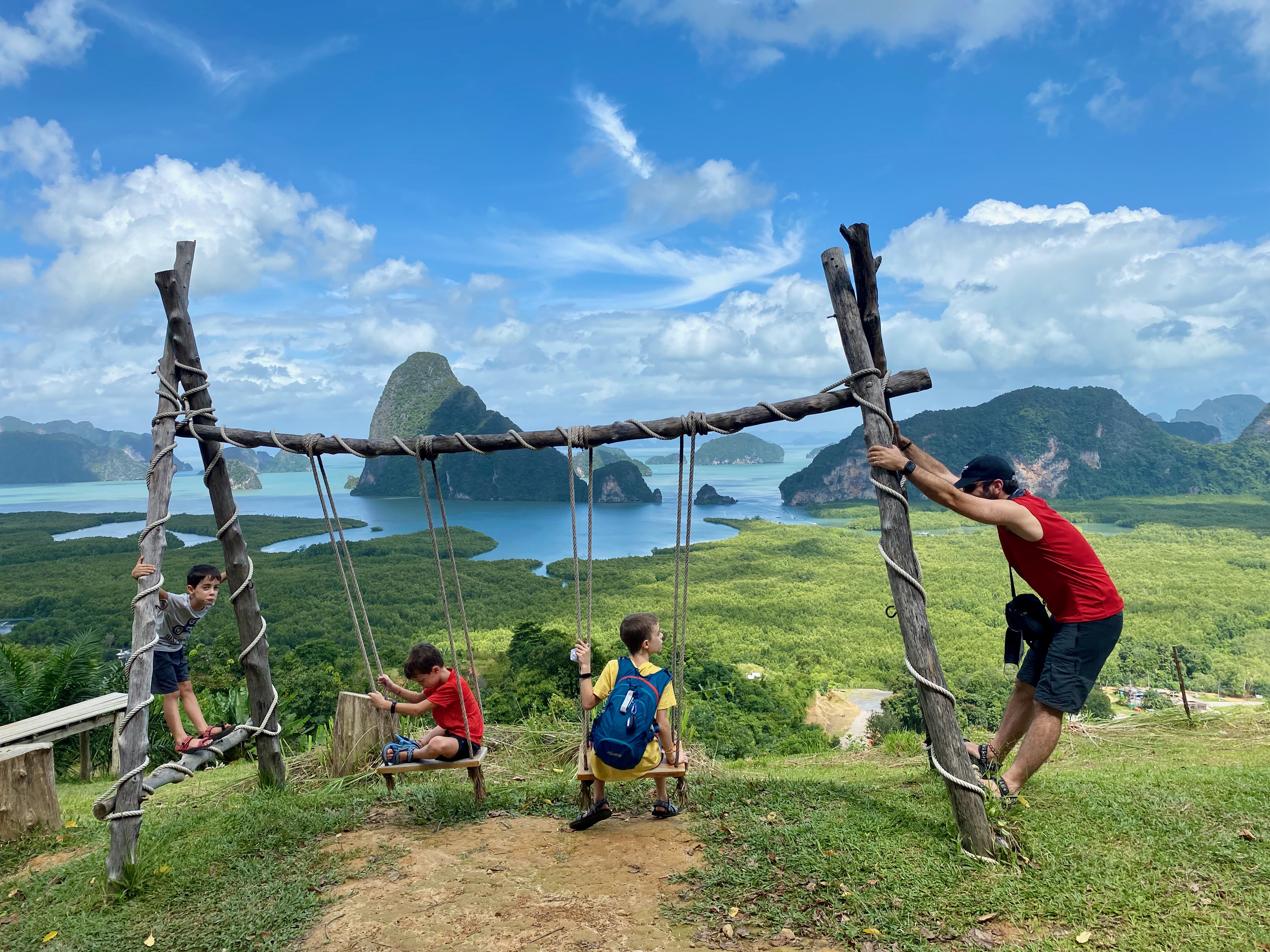 קודם עצרנו בנקודת תצפית שמשקיפה על כל המפרץ העמוס בצוקים קארסטים שיוצאים מהג׳ונגלים.. אלה שכשאומרים תאילנד, זה מה שיש לכולם בראש. עלינו לשם באיזה טנדר בדרך קצת פסיכית, שאותי קצת הפחידה, מאוד מאוד תלולה, אבל כל שאר יושבי הטנדר התאילנדים, צחקקו להם (ספק בשמחה ספק בפחד :)) אז לפחות הילדים לא חשו בחרדה שלי..