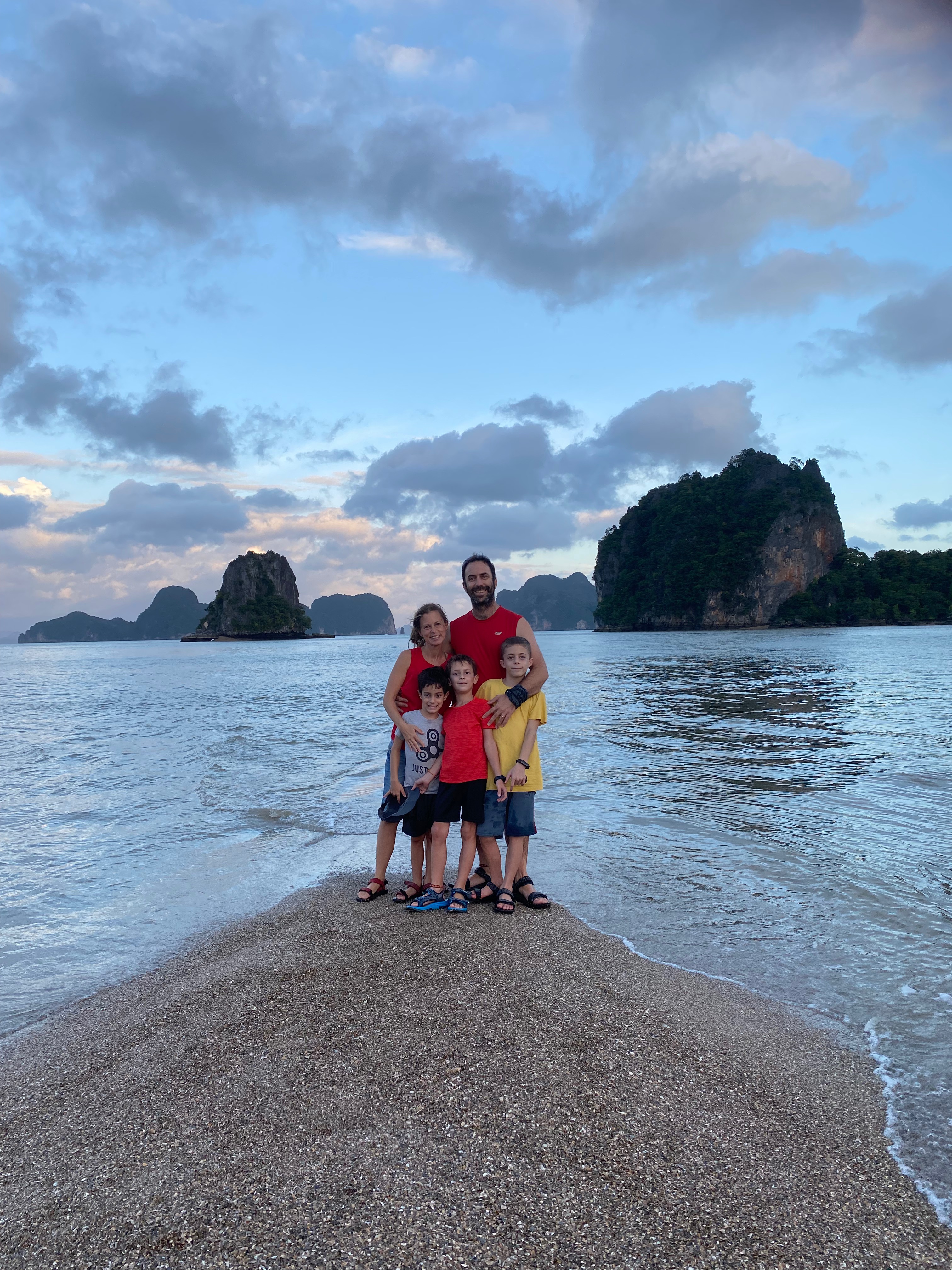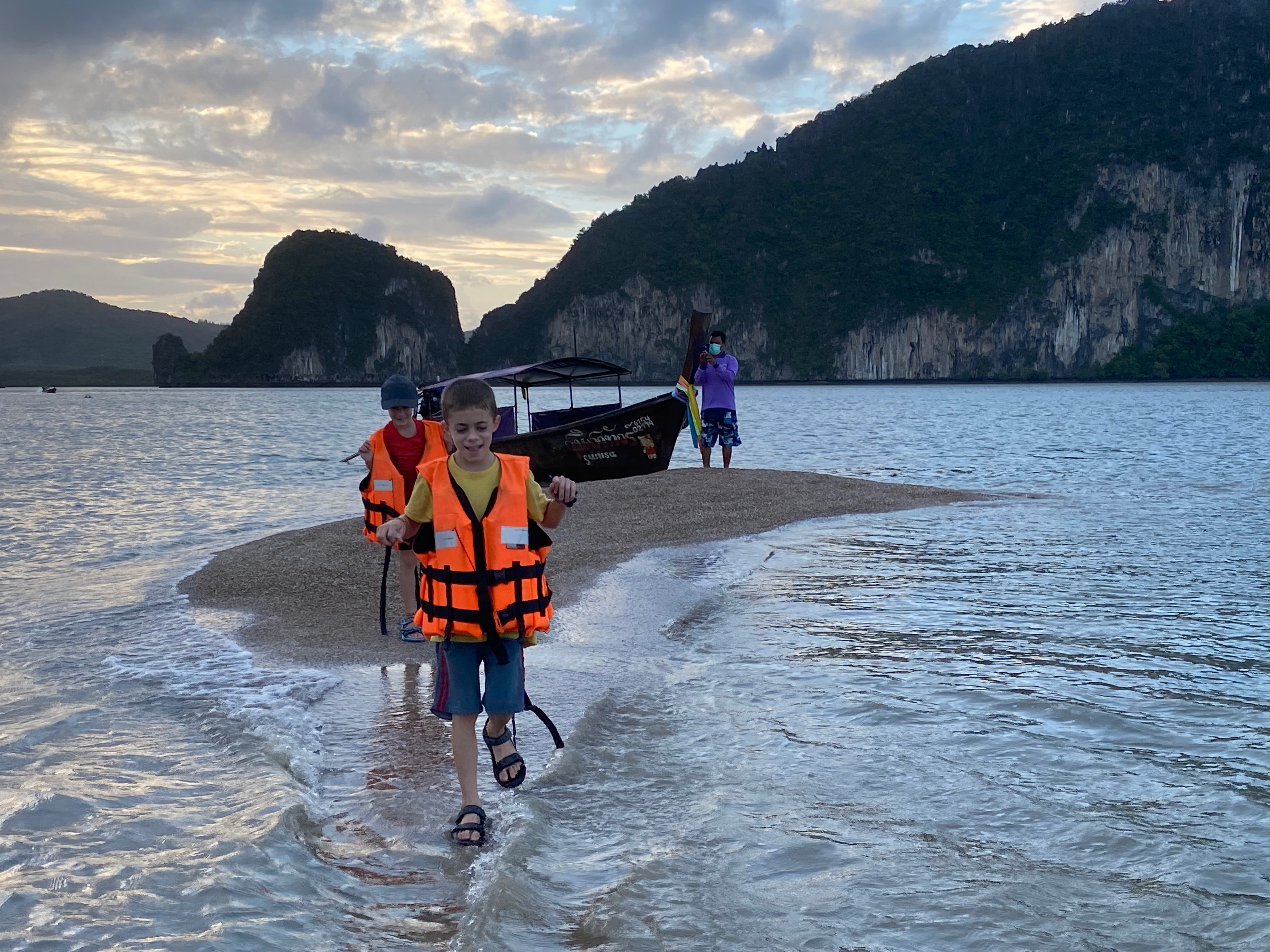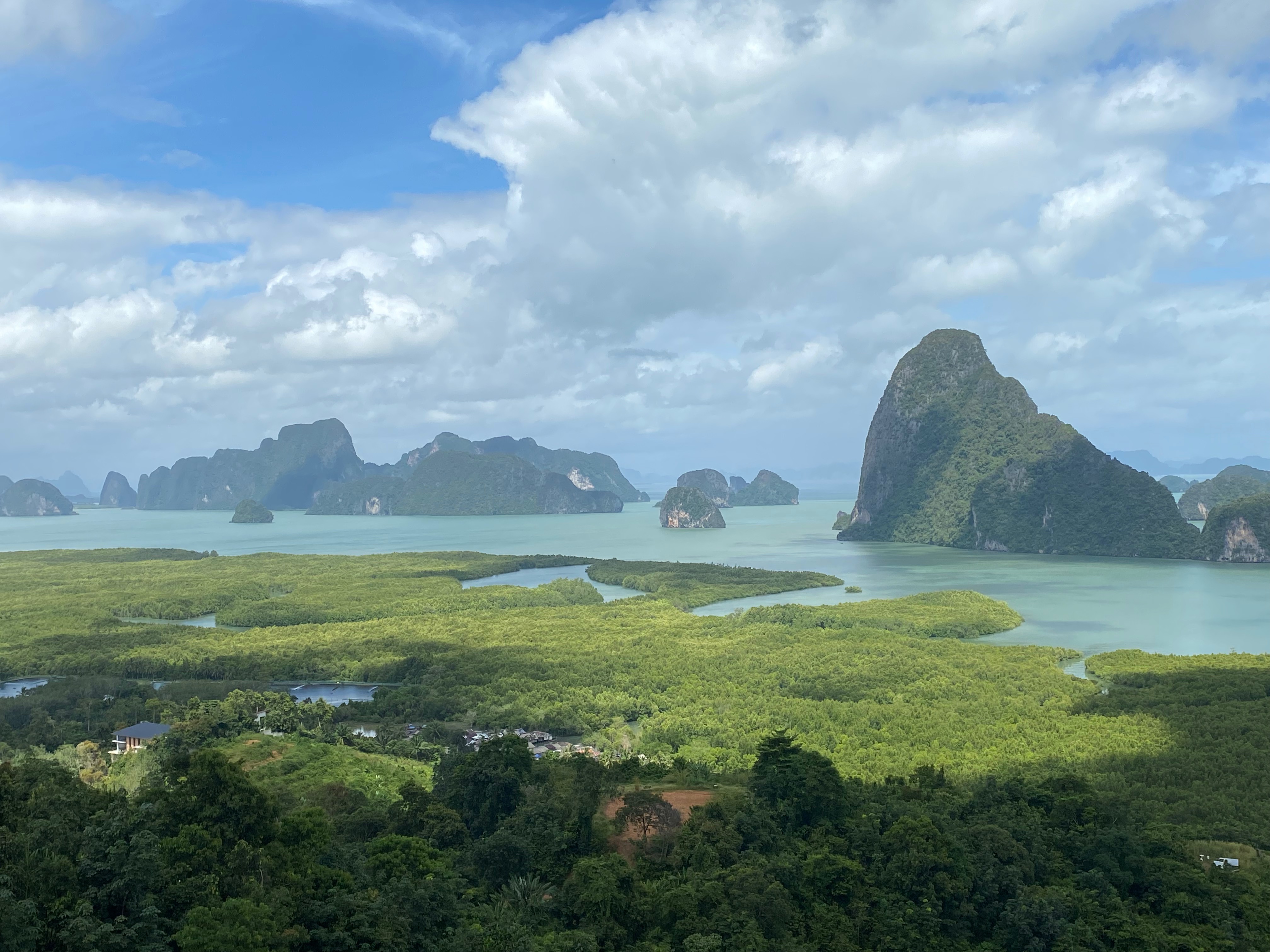 קודם עצרנו בנקודת תצפית שמשקיפה על כל המפרץ העמוס בצוקים קארסטים שיוצאים מהג׳ונגלים.. אלה שכשאומרים תאילנד, זה מה שיש לכולם בראש. עלינו לשם באיזה טנדר בדרך קצת פסיכית, שאותי קצת הפחידה, מאוד מאוד תלולה, אבל כל שאר יושבי הטנדר התאילנדים, צחקקו להם (ספק בשמחה ספק בפחד :)) אז לפחות הילדים לא חשו בחרדה שלי..