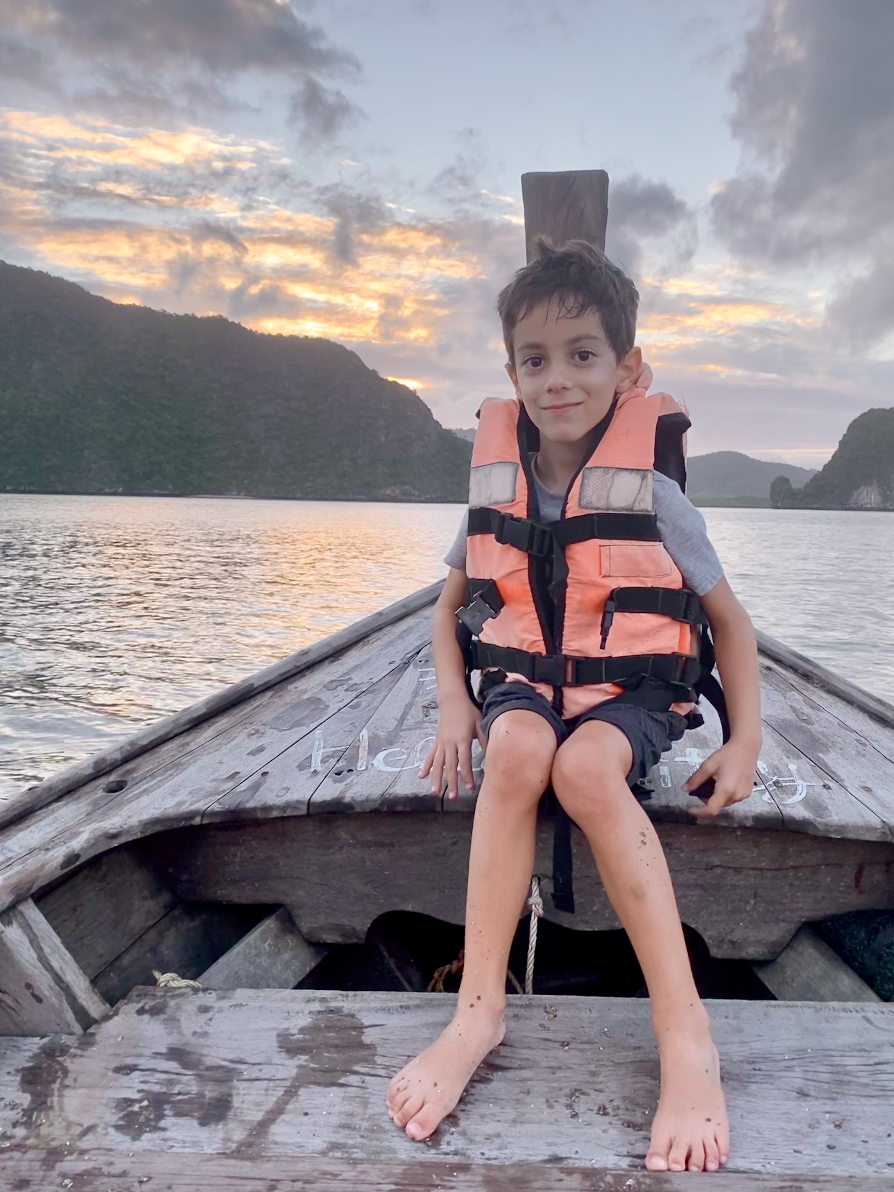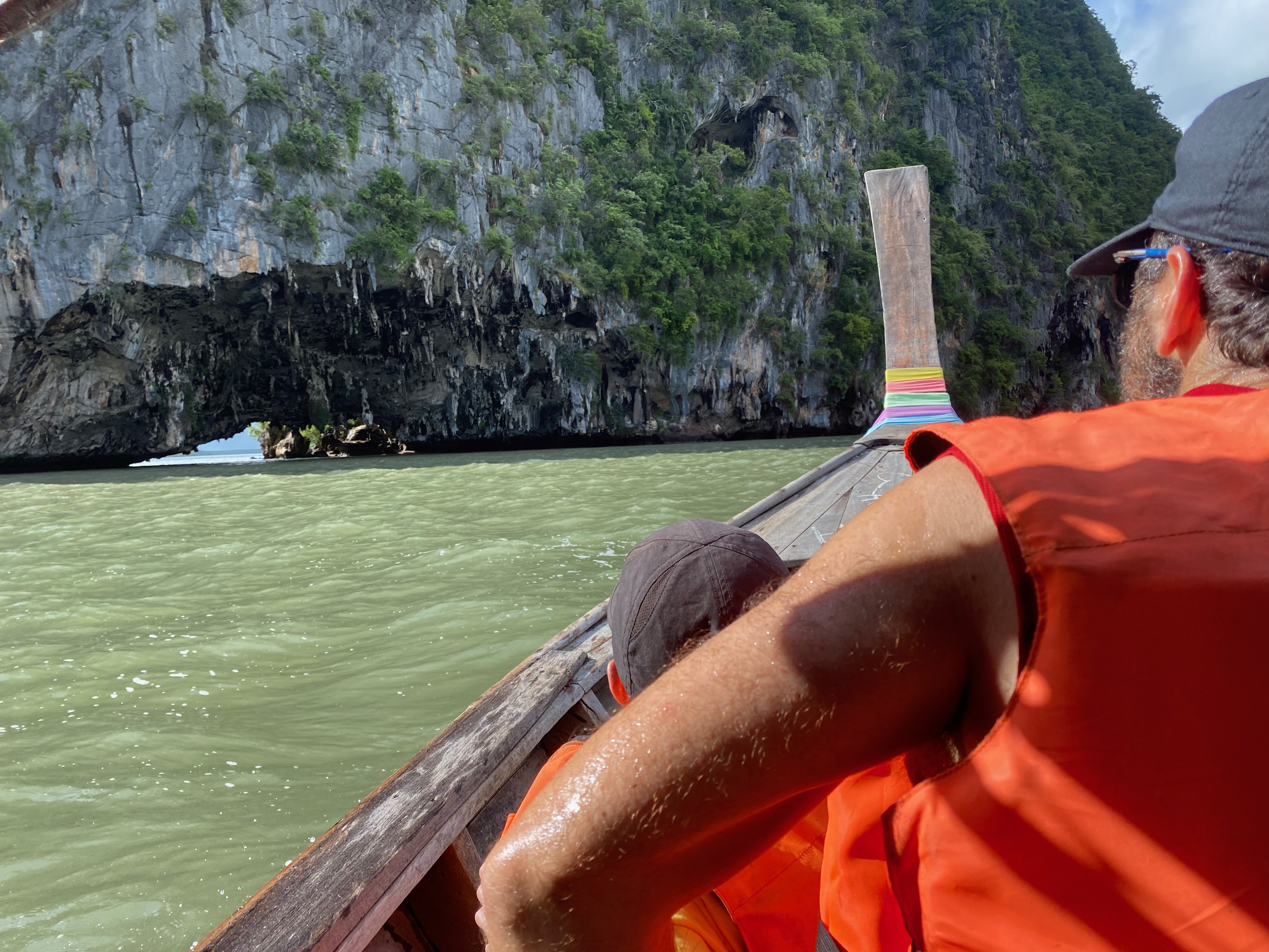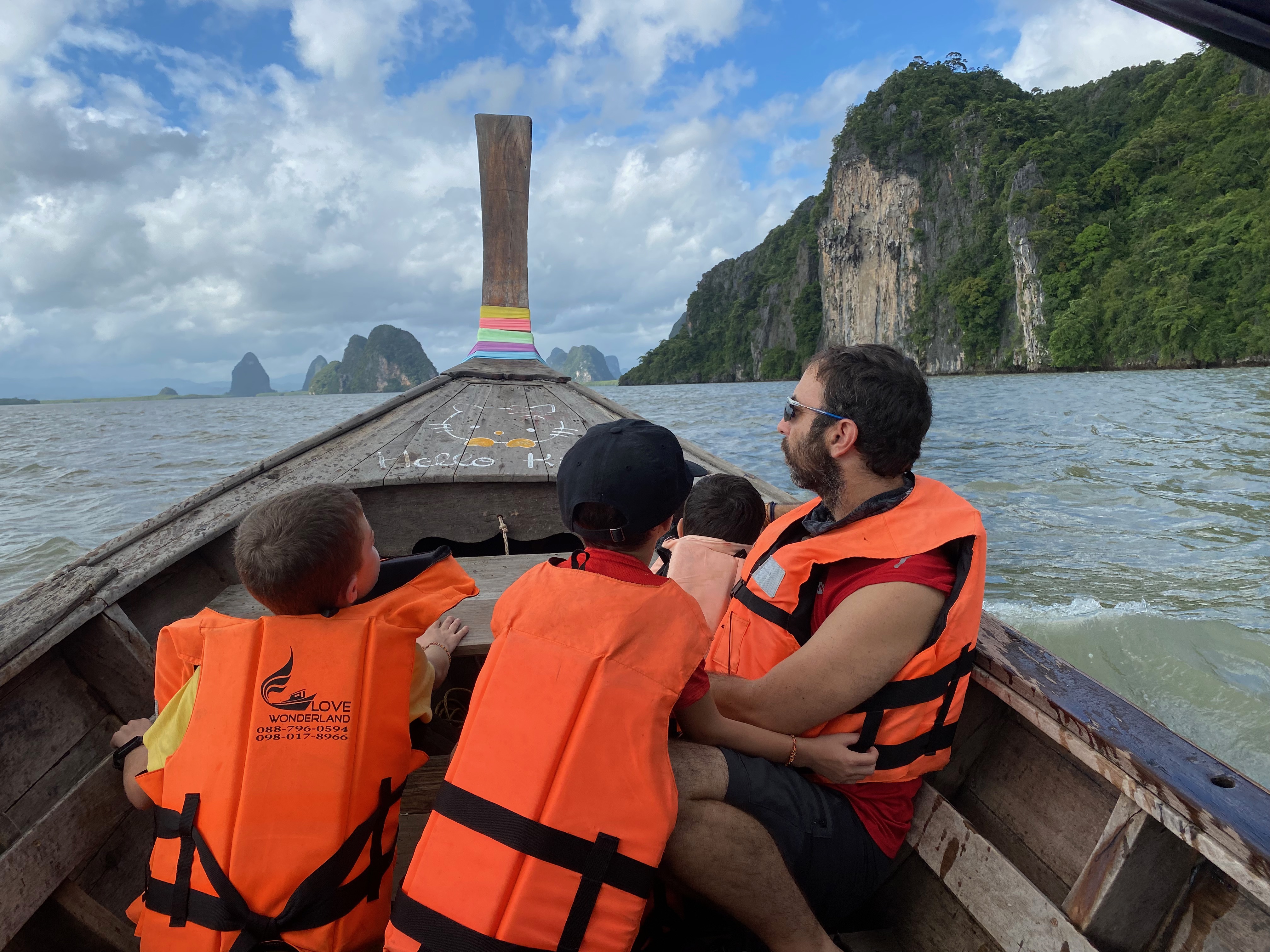 משם ירדנו למזח למצוא סירה, ניכר שבזמנים אחרים המקום הומה אדם, מדריכי תיירים ומשיטים.. אנחנו הוצאנו מישהו שדיבר קצת אנגלית מחדר המנוחה שלו וסגרנו איתו על שייט בין האיים. היו שם תמונות של המקומות העיקריים לשוט בינהם. יש כפר צף שסגור בגלל הקורונה, השאר פתוח, סגרנו על מערת נטיפים והצוקים שכיכבו אחד מסרטי ג׳יימס בונד, סיכמנו איתם שאנחנו תכף חוזרים והלכנו לאלתר ארוחת צהריים לילדים. באופן מפתיע גם אני וגם גל הצלחנו לקנות כמה מאפים וקרקרים בשתי מכולות שונות שהתפצלנו בינהן, הכל פה מאוד מקומי, ובכלל לא תיירותי כרגע, אז מאוד שמחנו שמצאנו את זה, וחזרנו למזח.