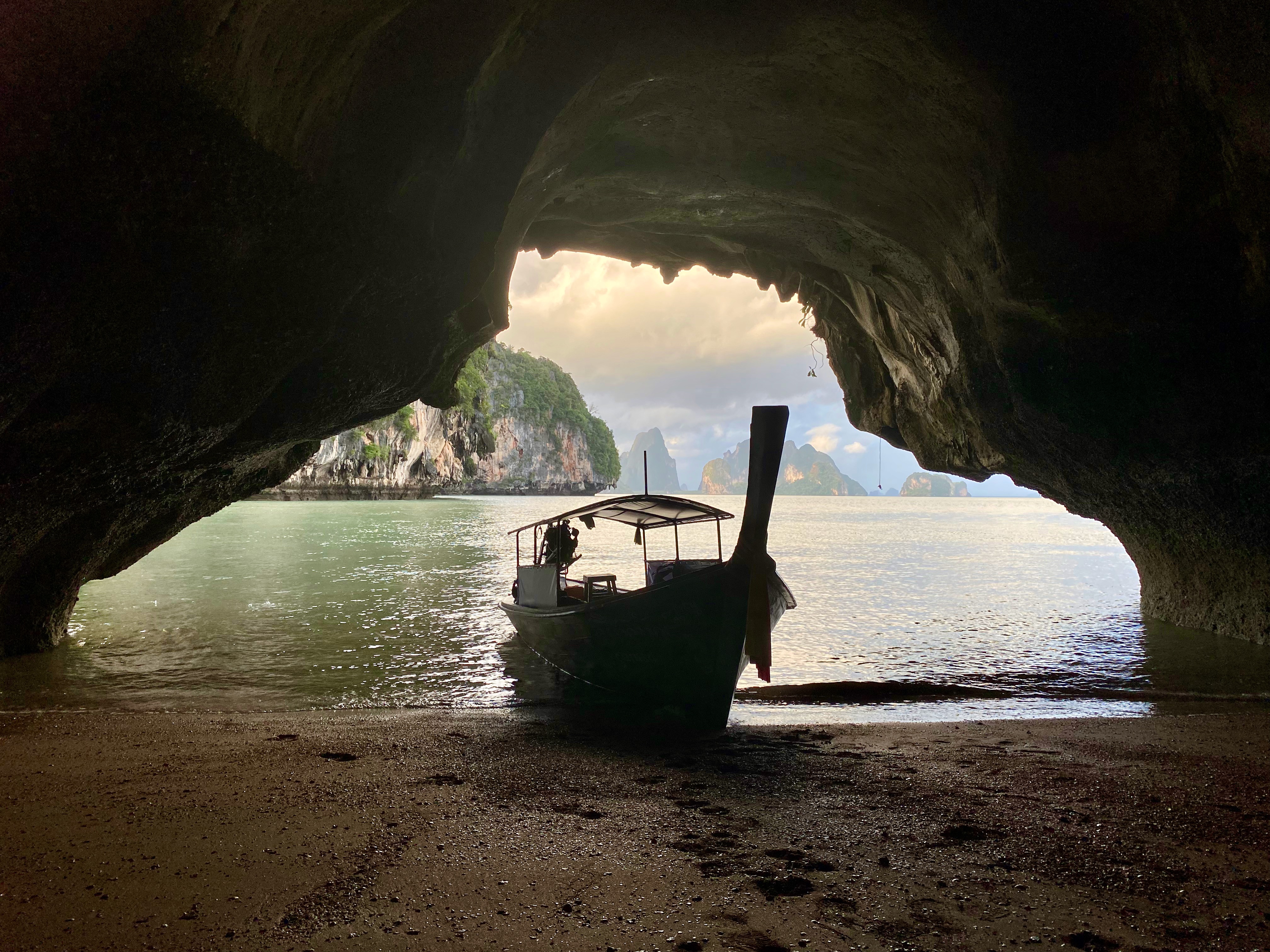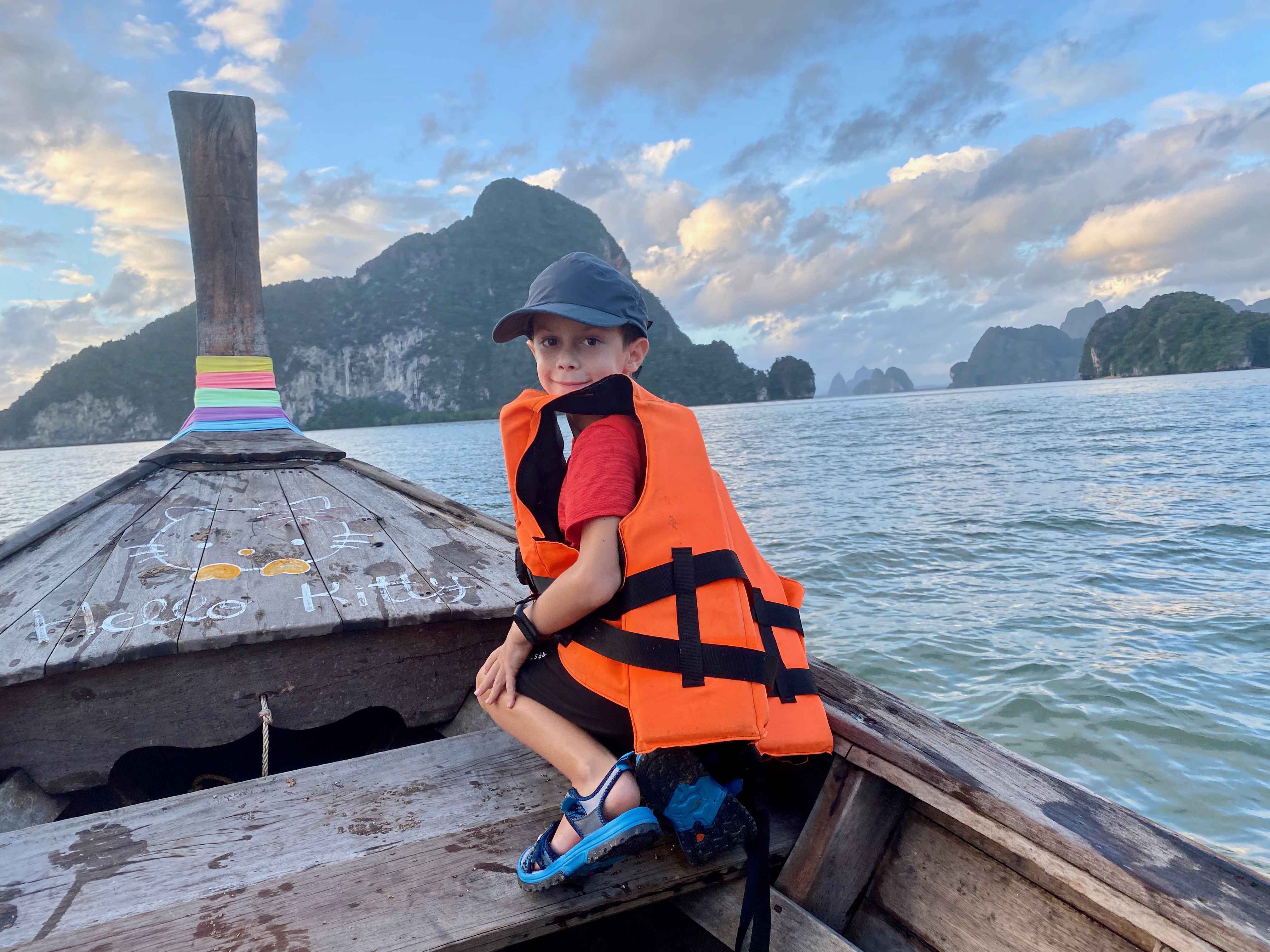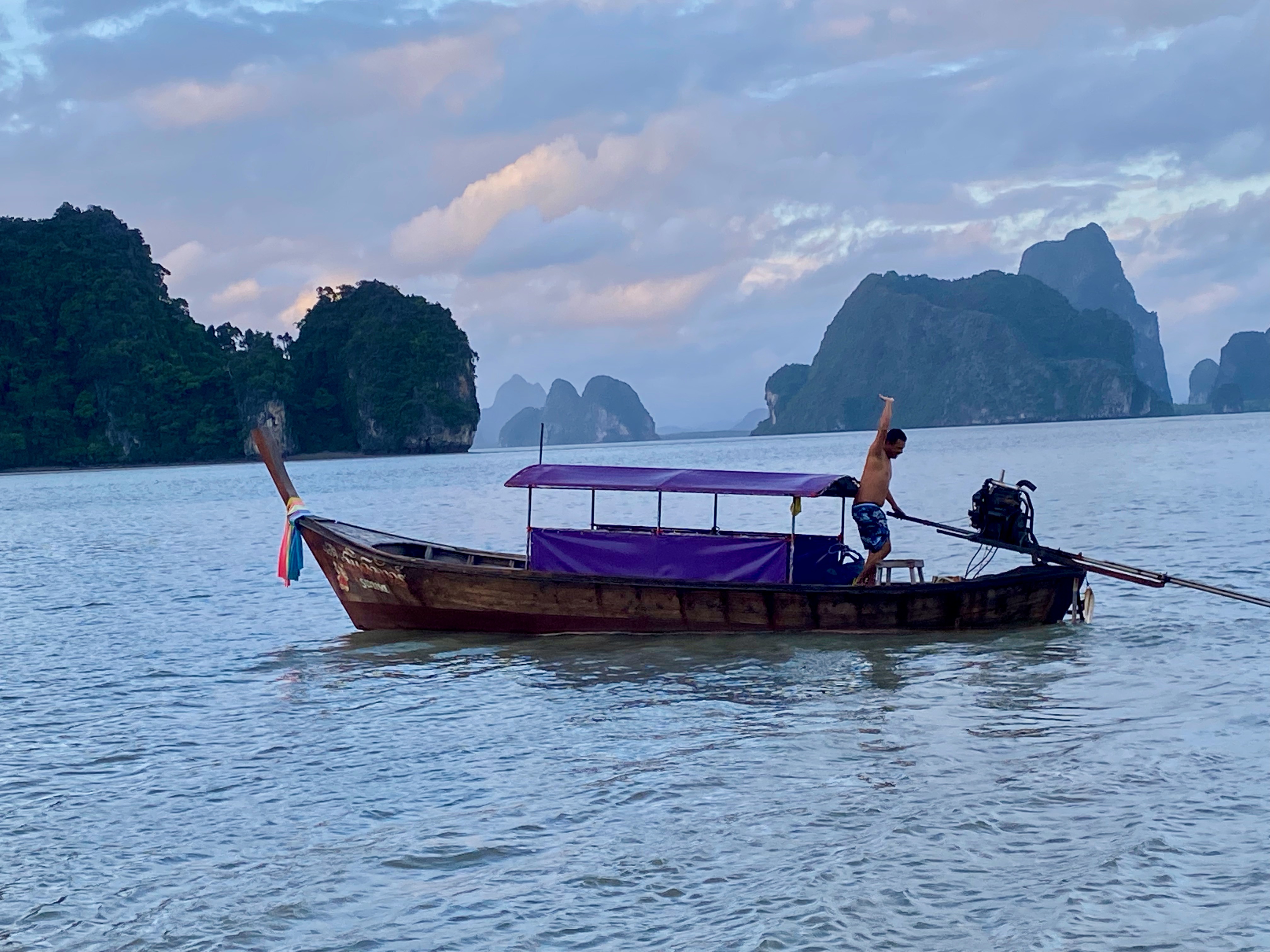 משם ירדנו למזח למצוא סירה, ניכר שבזמנים אחרים המקום הומה אדם, מדריכי תיירים ומשיטים.. אנחנו הוצאנו מישהו שדיבר קצת אנגלית מחדר המנוחה שלו וסגרנו איתו על שייט בין האיים. היו שם תמונות של המקומות העיקריים לשוט בינהם. יש כפר צף שסגור בגלל הקורונה, השאר פתוח, סגרנו על מערת נטיפים והצוקים שכיכבו אחד מסרטי ג׳יימס בונד, סיכמנו איתם שאנחנו תכף חוזרים והלכנו לאלתר ארוחת צהריים לילדים. באופן מפתיע גם אני וגם גל הצלחנו לקנות כמה מאפים וקרקרים בשתי מכולות שונות שהתפצלנו בינהן, הכל פה מאוד מקומי, ובכלל לא תיירותי כרגע, אז מאוד שמחנו שמצאנו את זה, וחזרנו למזח.