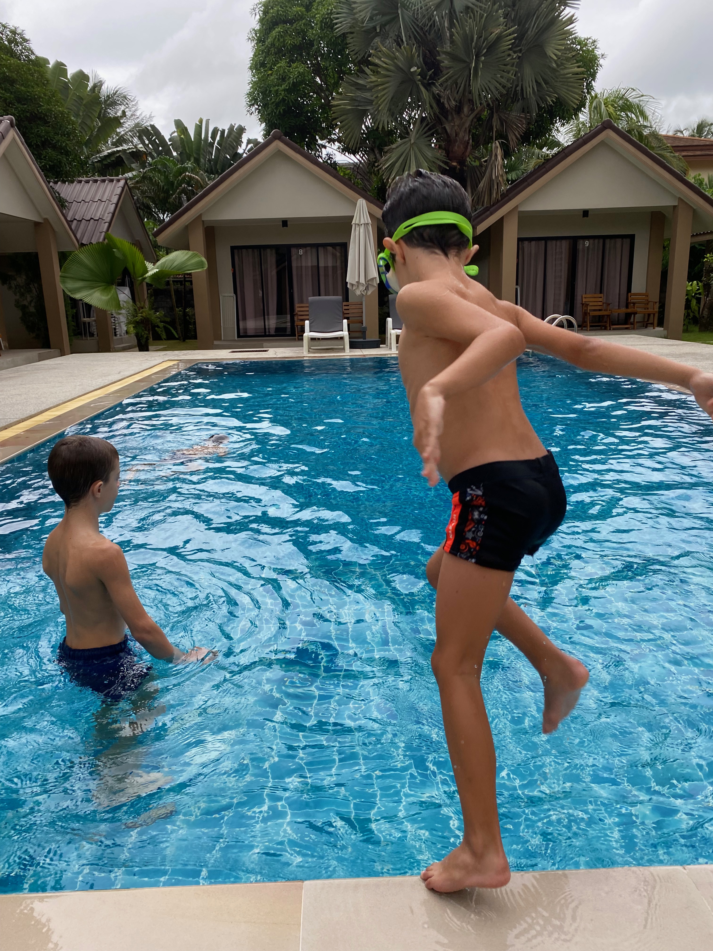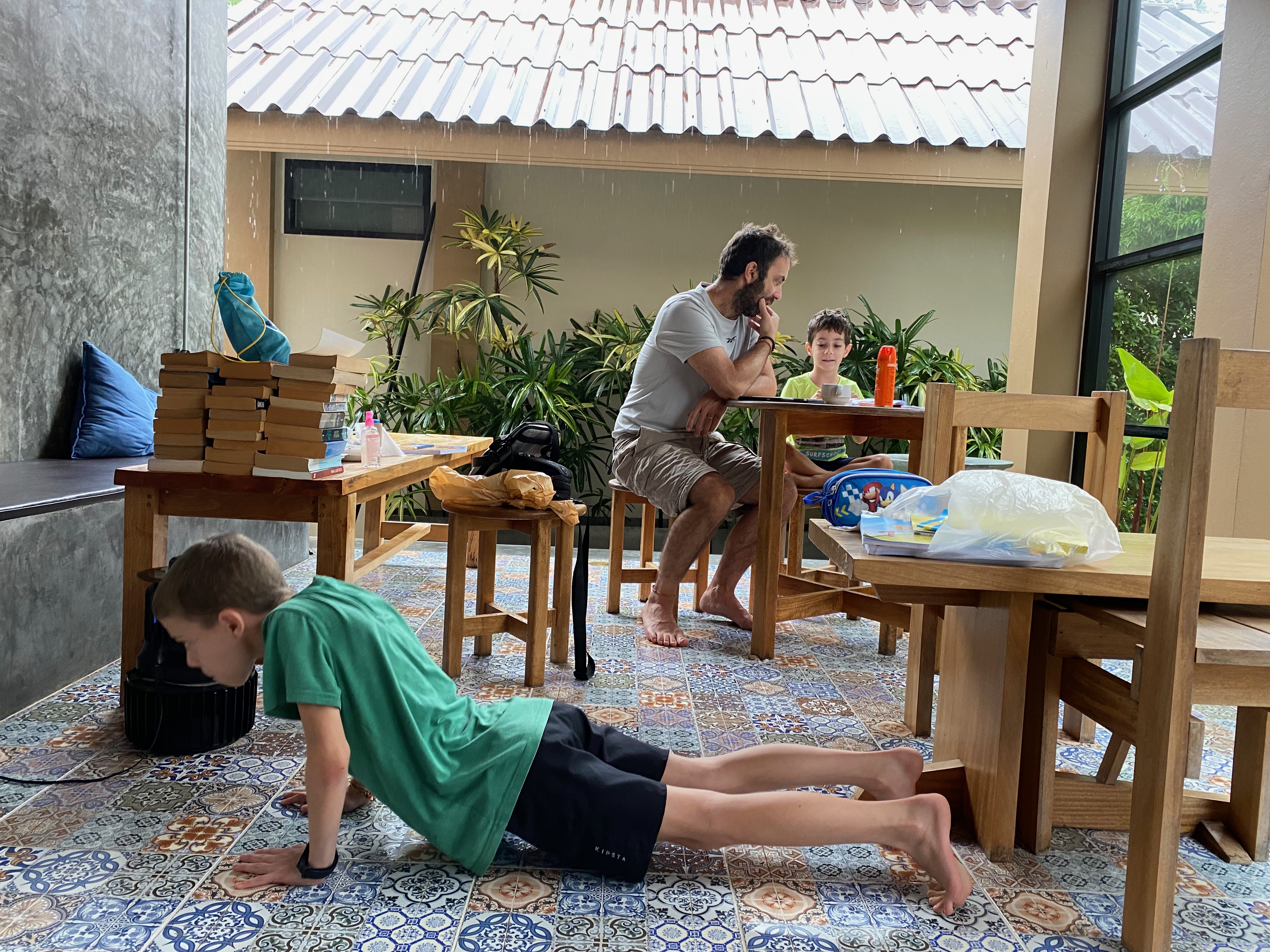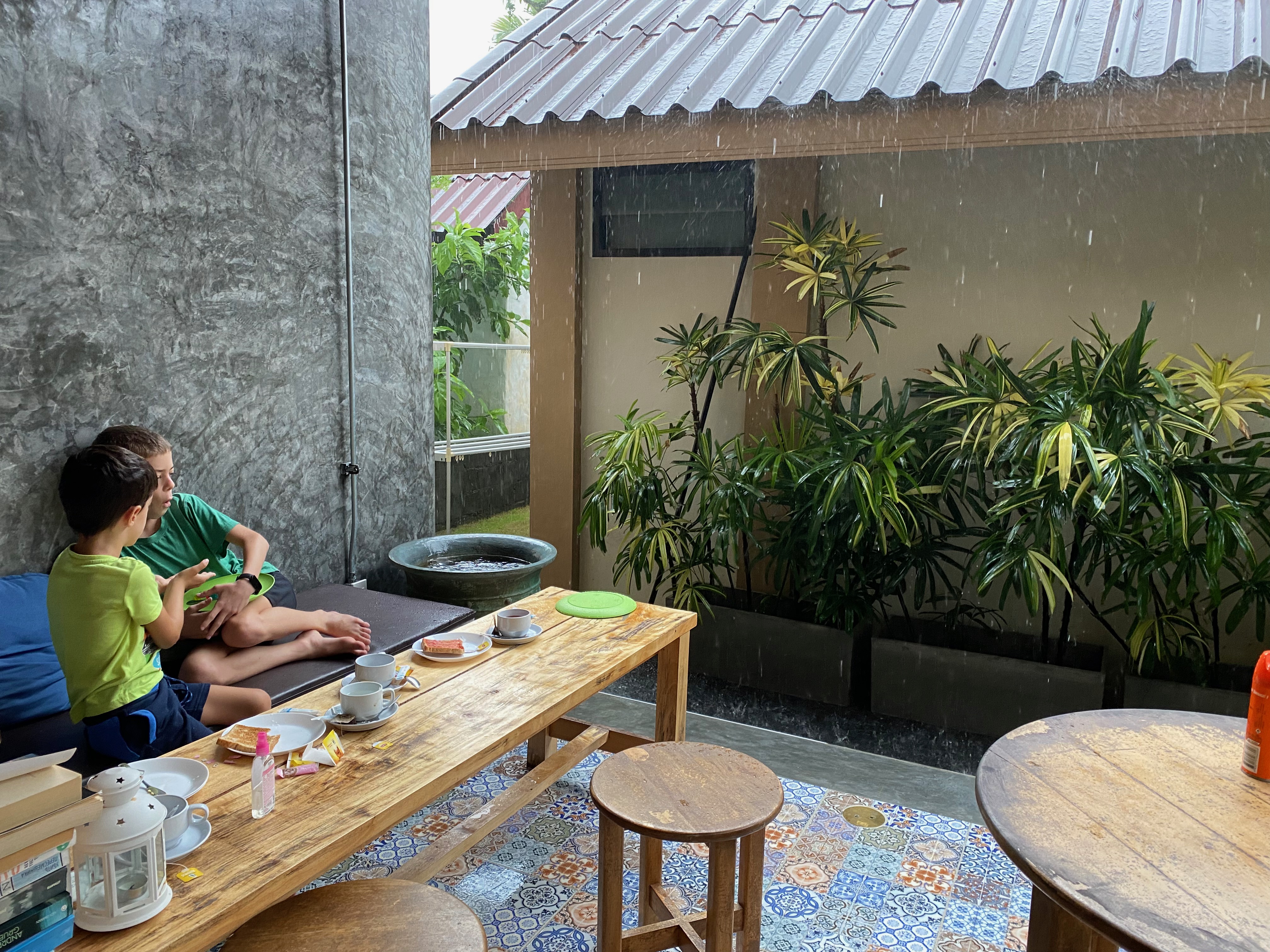 והגשם לא הפסיק לרדת… בבקר (12/10/21) הוא עדיין ירד. ישבנו ב׳חדר אוכל׳ לאכול ארוחת בוקר. נותנים לאורחים (רק אנחנו כמובן) טוסטים ומרגרינה/ריבה ותה/קפה, גל קפץ לקנות גם חמאה וגבינצ כדי להשלים את זה. אחרי זה נשארנו שם ללמוד בגשם, הילדים שיחקו גם פה עם הדגים בבריכות הדגים הקטנות בכניסה בגשם, ואחרי זה גל והילדים נכנסו לבריכה בגשם.. אחרי זה הילדים הלכו לראות סרט בחדר בגשם וגל הלך לעשות כביסה ומסאג׳ בגשם בזמן שאני התחלתי לכתוב..