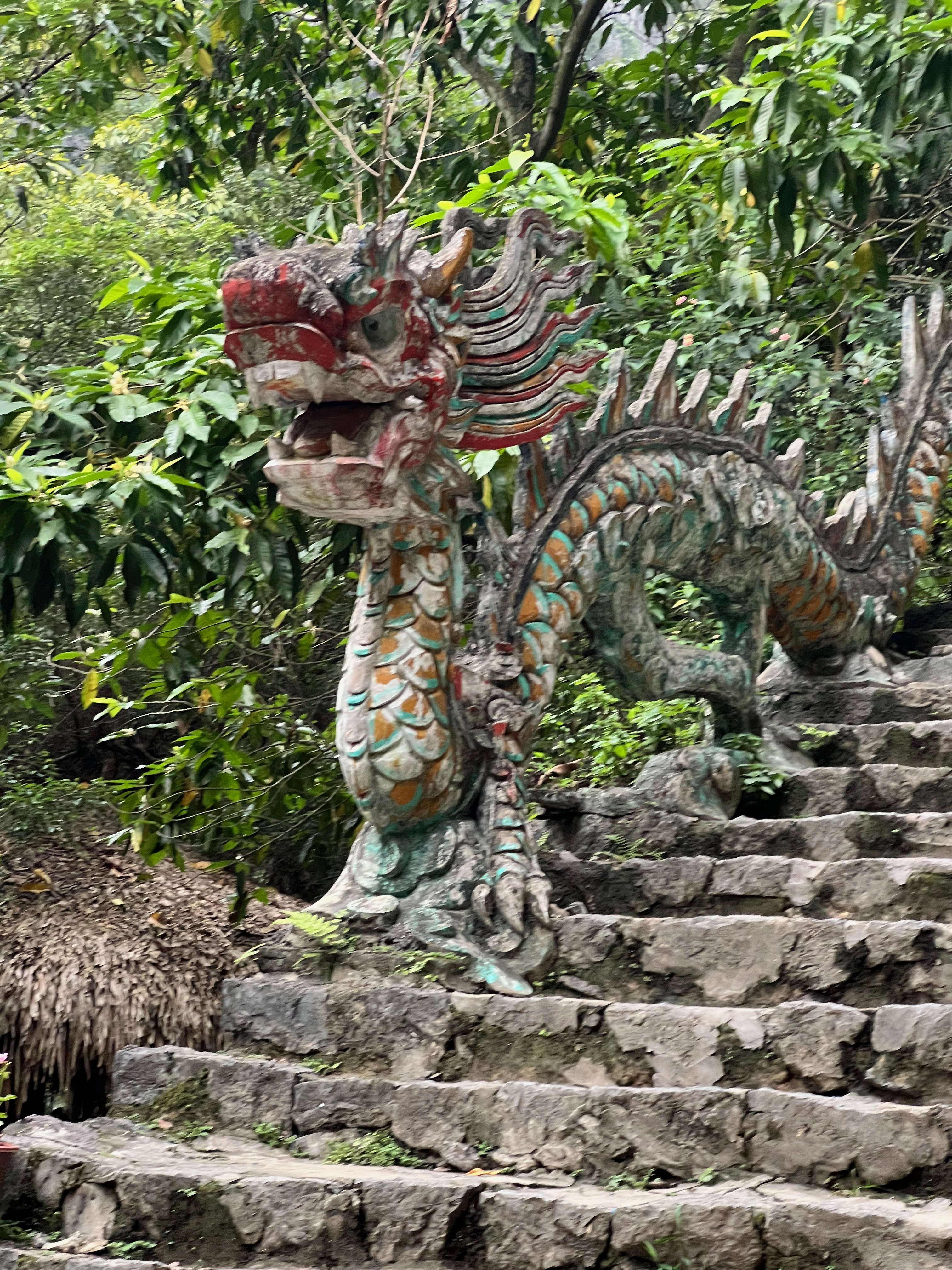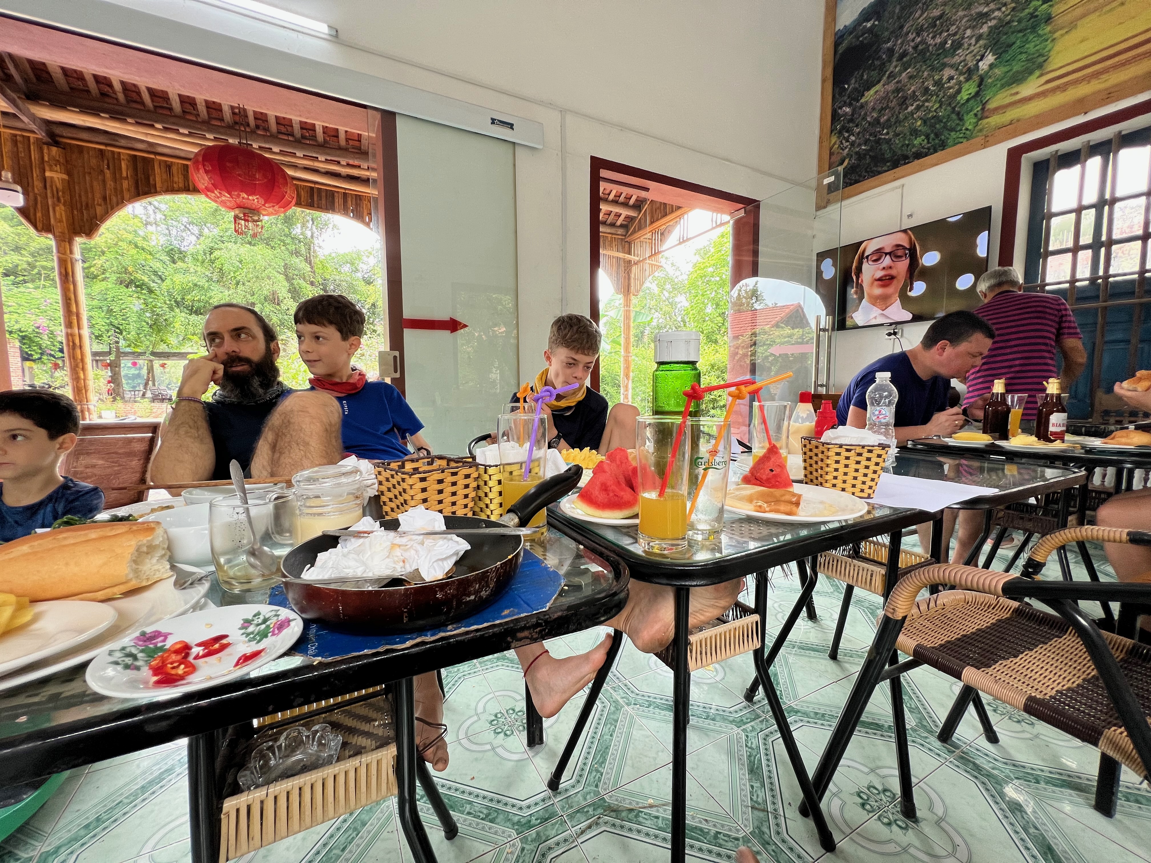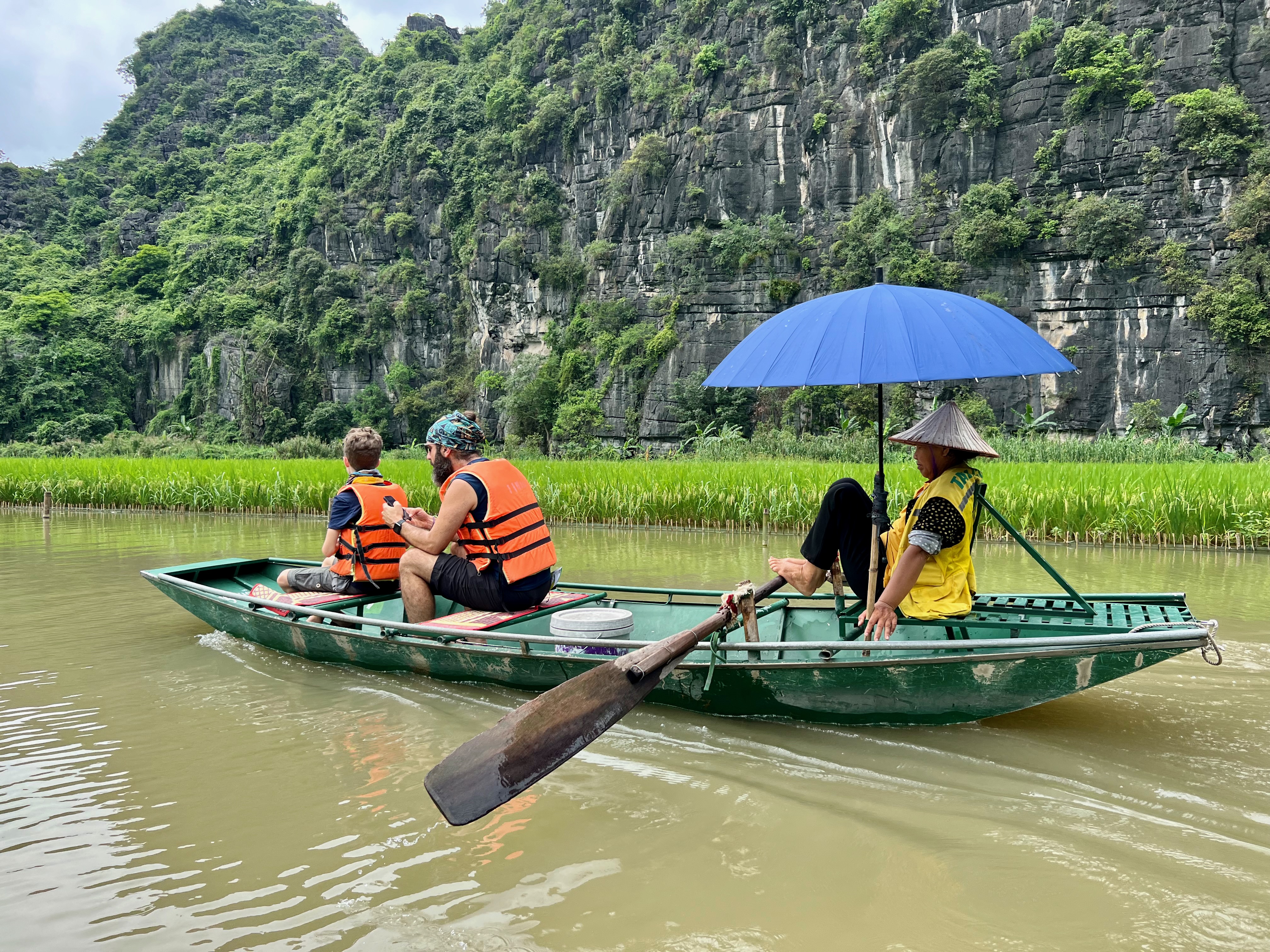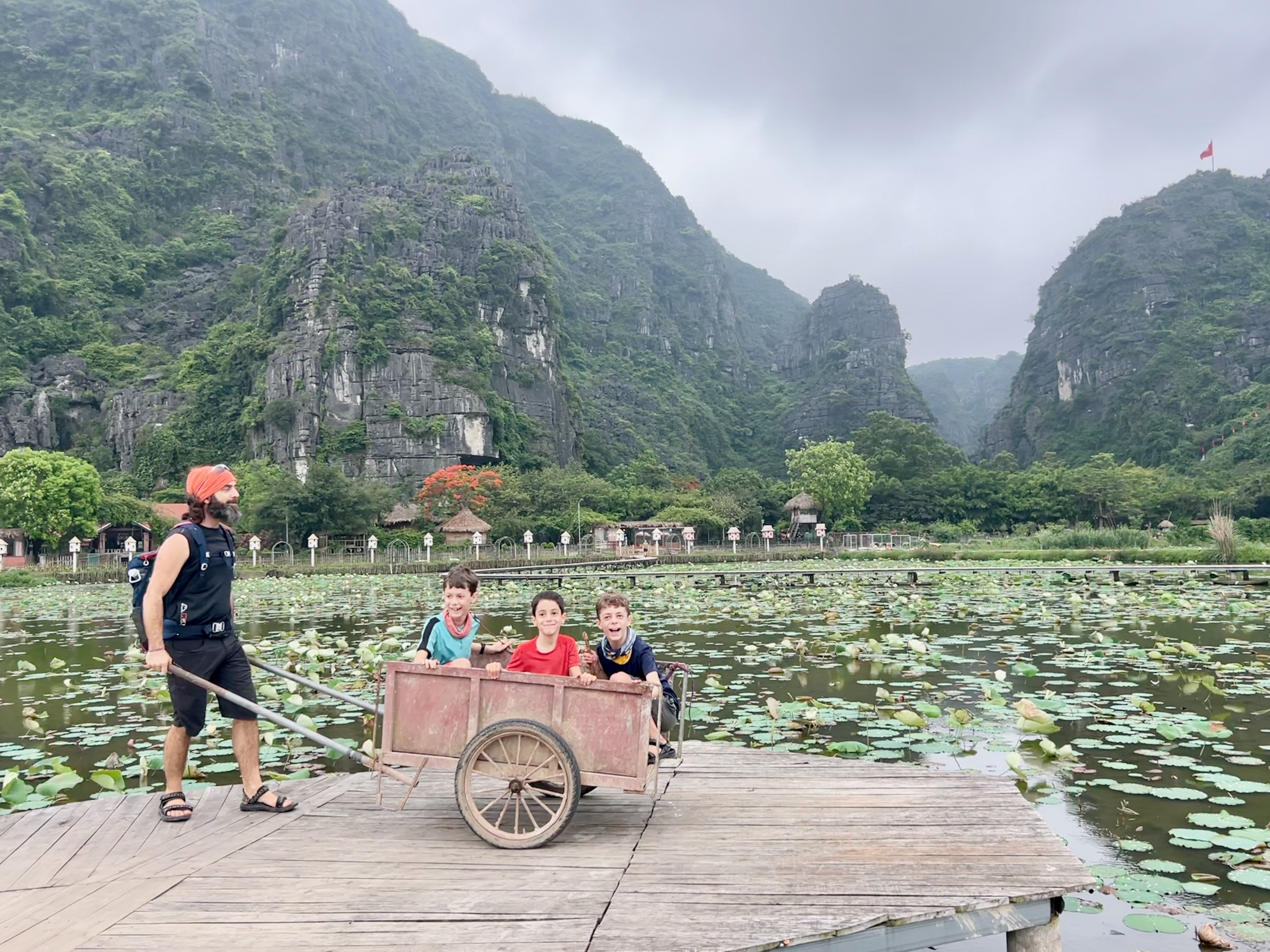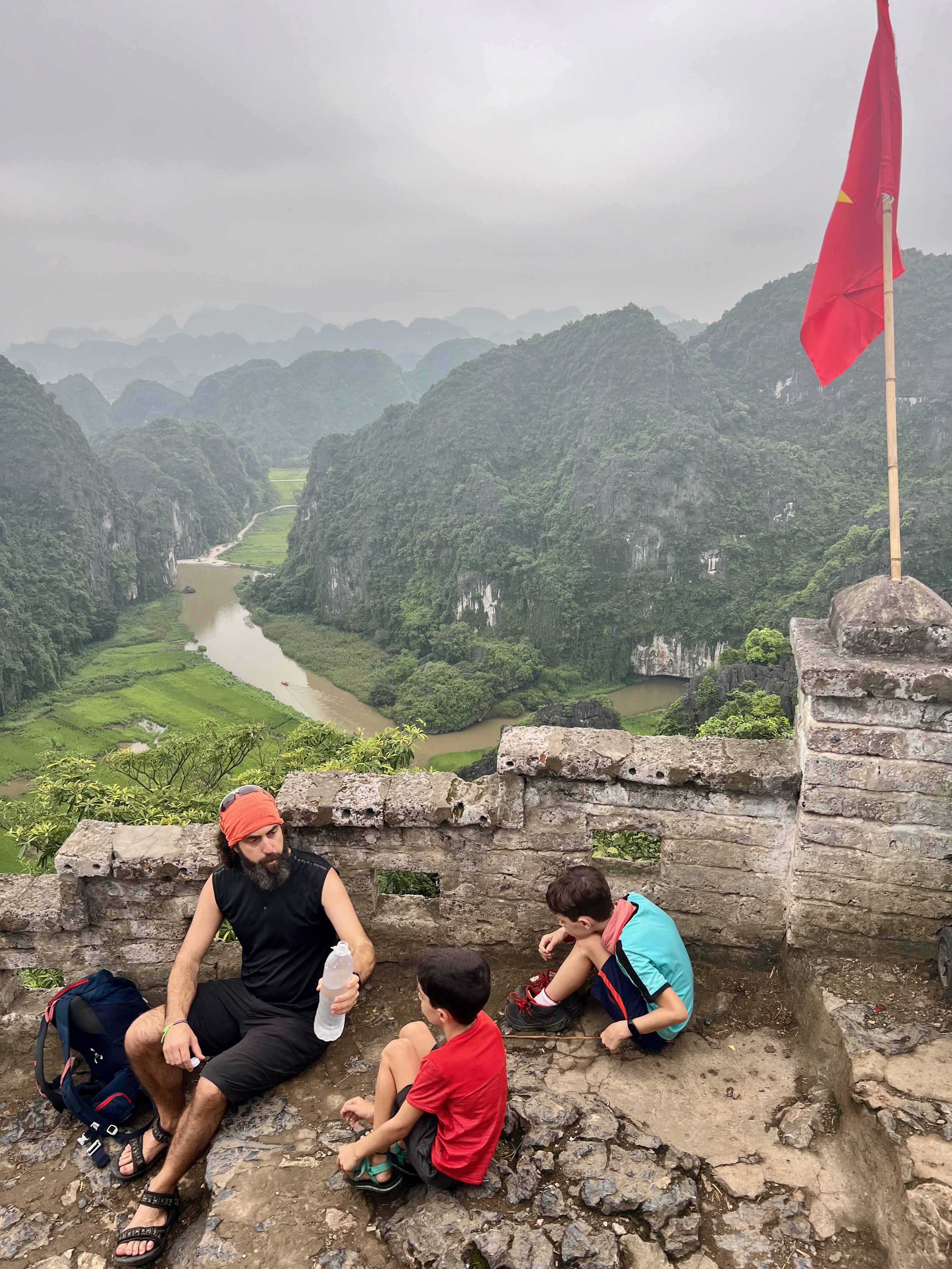 למחרת בבקר הכרנו את השכנים החמודים שלנו, נעם ועודי והבן שלהם איילון בן השנתיים. הופתענו שסה״כ על אף הפרשי הגילאים והשלבים השונים סה״כ בחיים, עדיין אנחנו חולקים לא מעט חוויות וגם אתגרים דומים, ושמחנו מאוד על המפגש. עשינו בקר רגוע של לימודים ואוריגמי וזמן איכות עם מבוגרים אחרים. ואחרי ארוחת צהריים יצאנו לטיול בשדות לכיוון תצפית מרהיבה על האיזור. טיילנו בין שדות אורז לשדות לוטוס, ומסביבנו צוקי גיר בולטים מהקרקע.. עד שהגענו למדרגות שמטפסות על אחד הצוקים.. לתצפית משגעת.. ממש מדהים.. צופים מצד אחד על הנהר שבו משייטות סירות תיירים ובצד השני השדות ובקצה הצוק פסל של דרקון, שבגללו כולם קוראים למקום התצפית עם הדרקון, במקום דאם סן האנג מואה – שזה משהו כמו ׳מערת ריקוד בריכת הלוטוס׳. באמת בבסיס הצוק יש גם מערה קטנה:)