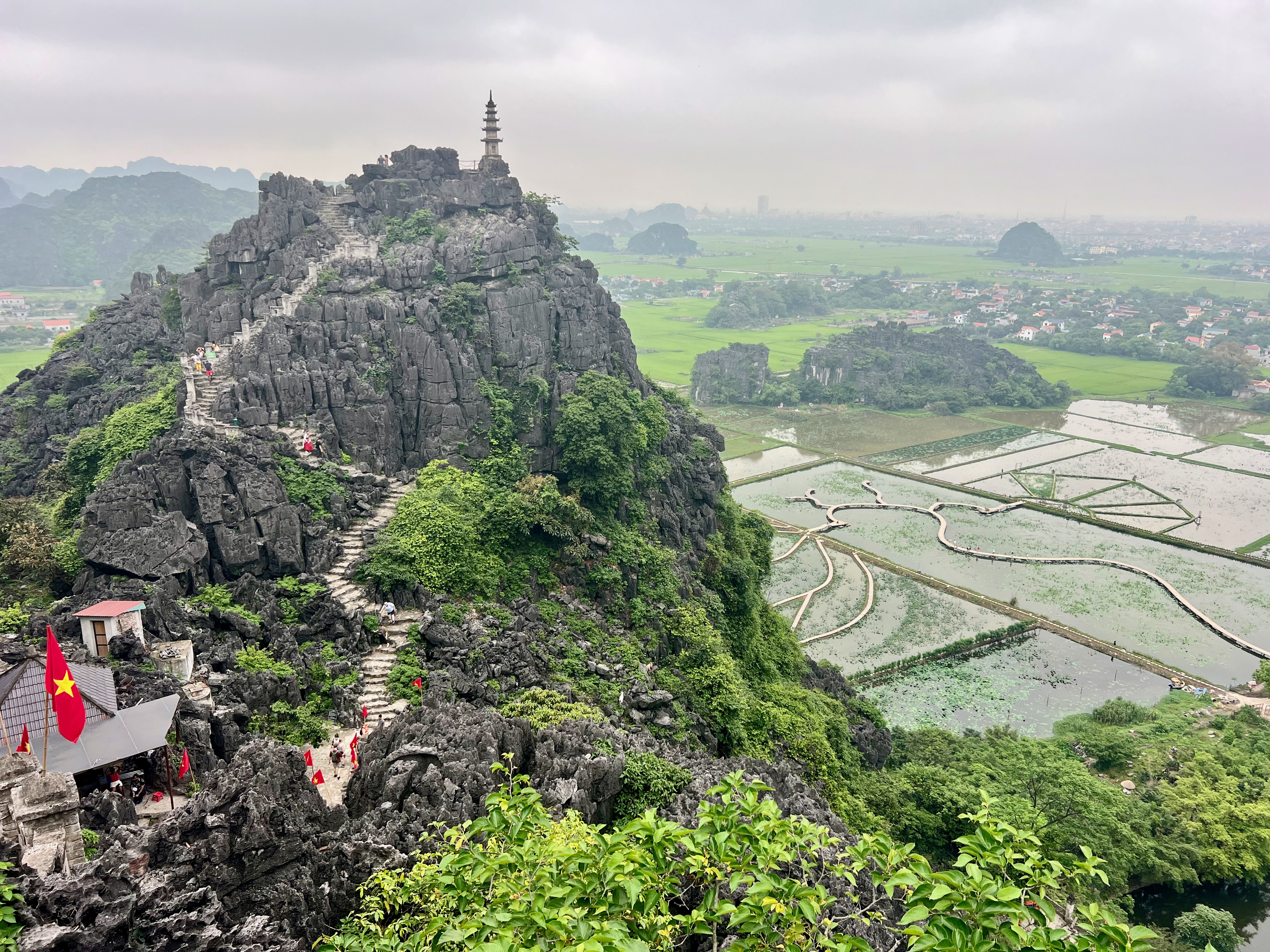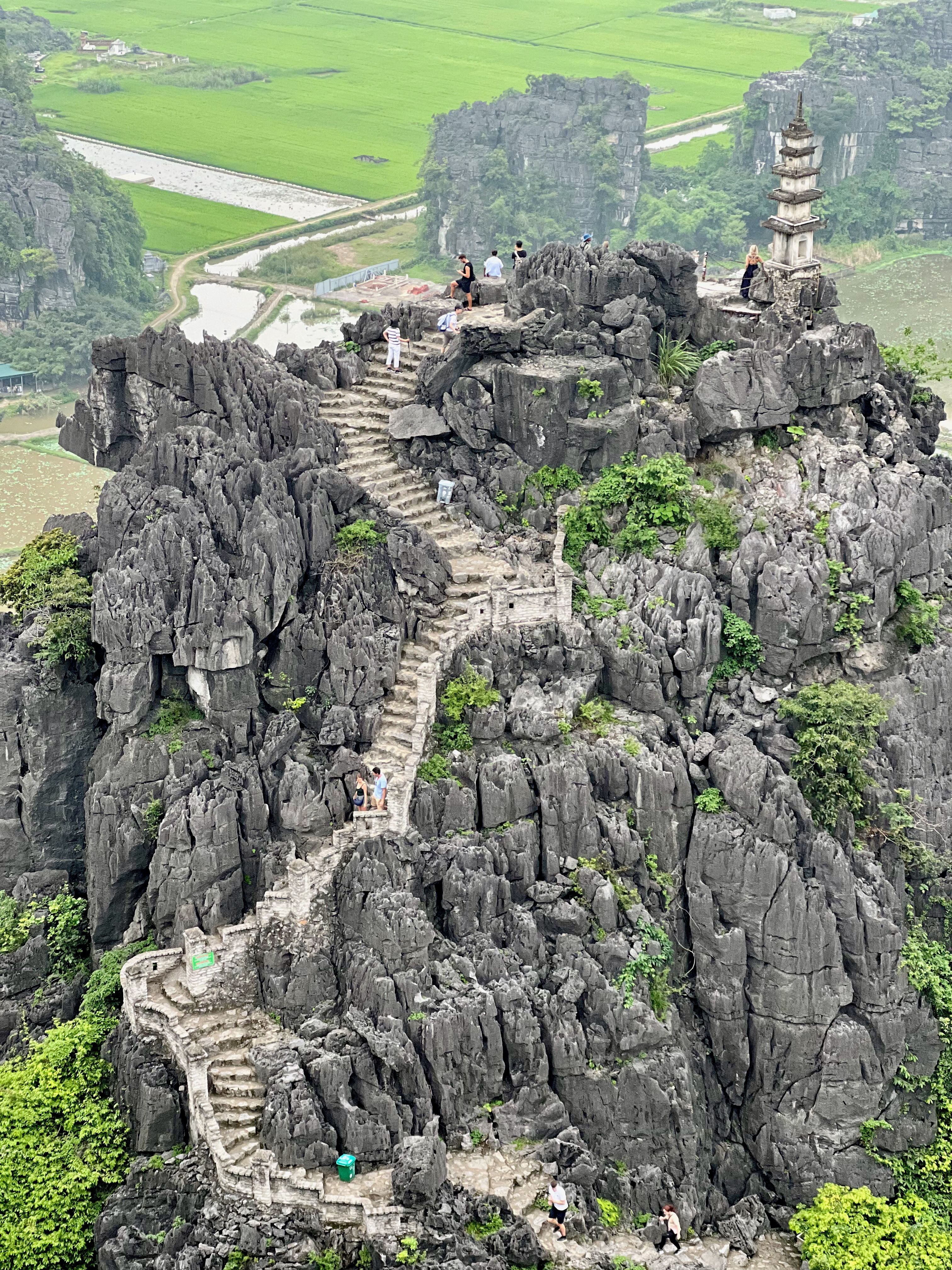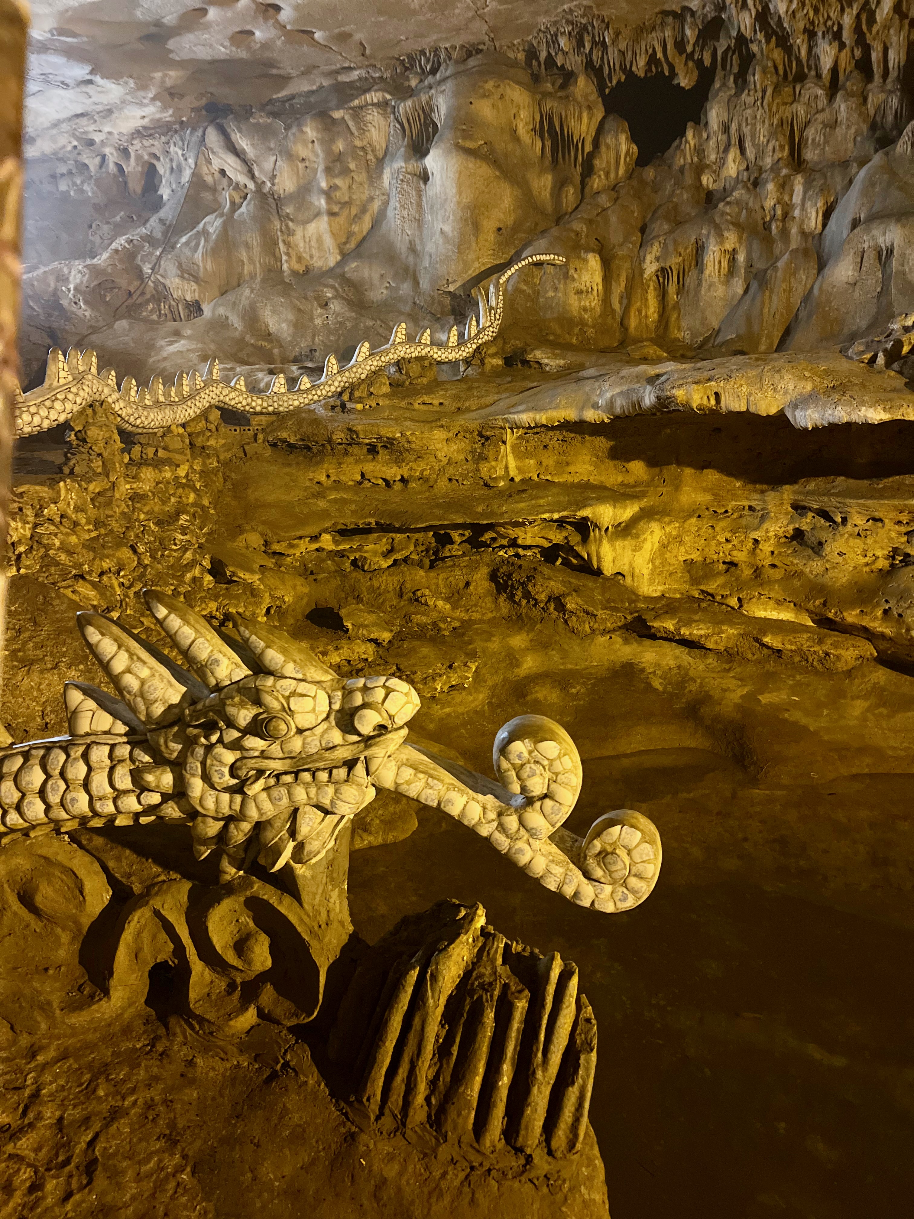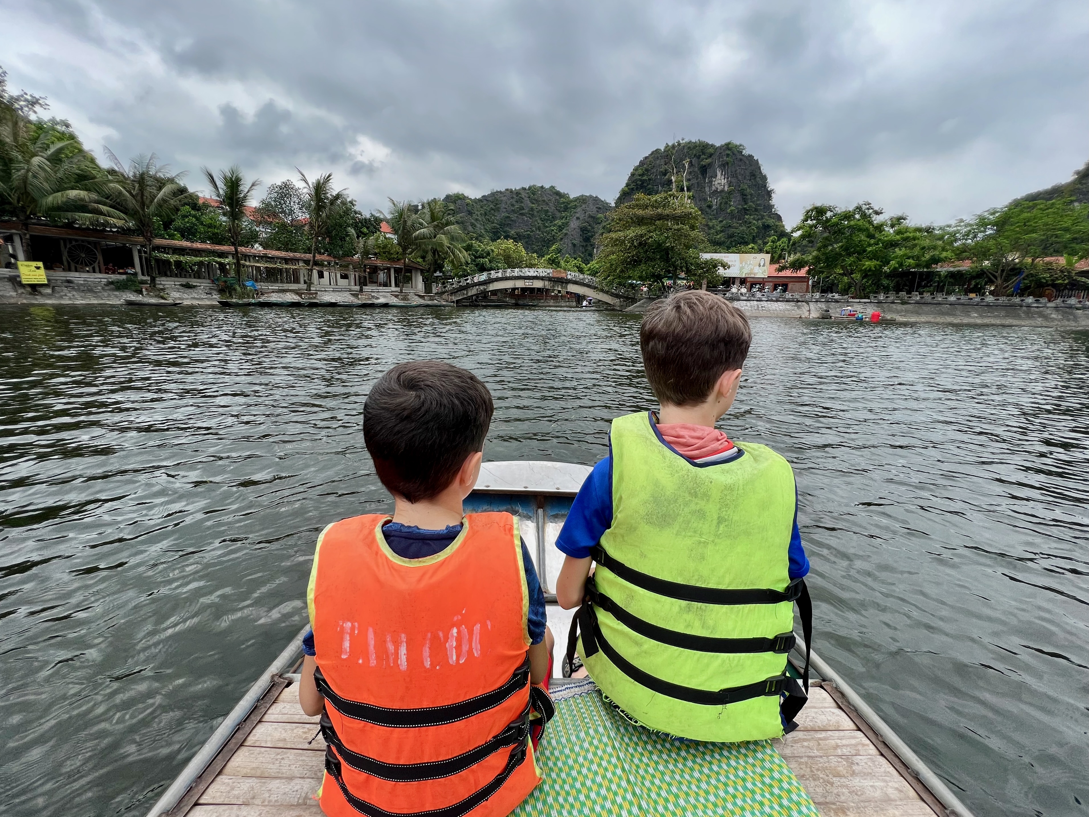 למחרת בבקר הכרנו את השכנים החמודים שלנו, נעם ועודי והבן שלהם איילון בן השנתיים. הופתענו שסה״כ על אף הפרשי הגילאים והשלבים השונים סה״כ בחיים, עדיין אנחנו חולקים לא מעט חוויות וגם אתגרים דומים, ושמחנו מאוד על המפגש. עשינו בקר רגוע של לימודים ואוריגמי וזמן איכות עם מבוגרים אחרים. ואחרי ארוחת צהריים יצאנו לטיול בשדות לכיוון תצפית מרהיבה על האיזור. טיילנו בין שדות אורז לשדות לוטוס, ומסביבנו צוקי גיר בולטים מהקרקע.. עד שהגענו למדרגות שמטפסות על אחד הצוקים.. לתצפית משגעת.. ממש מדהים.. צופים מצד אחד על הנהר שבו משייטות סירות תיירים ובצד השני השדות ובקצה הצוק פסל של דרקון, שבגללו כולם קוראים למקום התצפית עם הדרקון, במקום דאם סן האנג מואה – שזה משהו כמו ׳מערת ריקוד בריכת הלוטוס׳. באמת בבסיס הצוק יש גם מערה קטנה:)