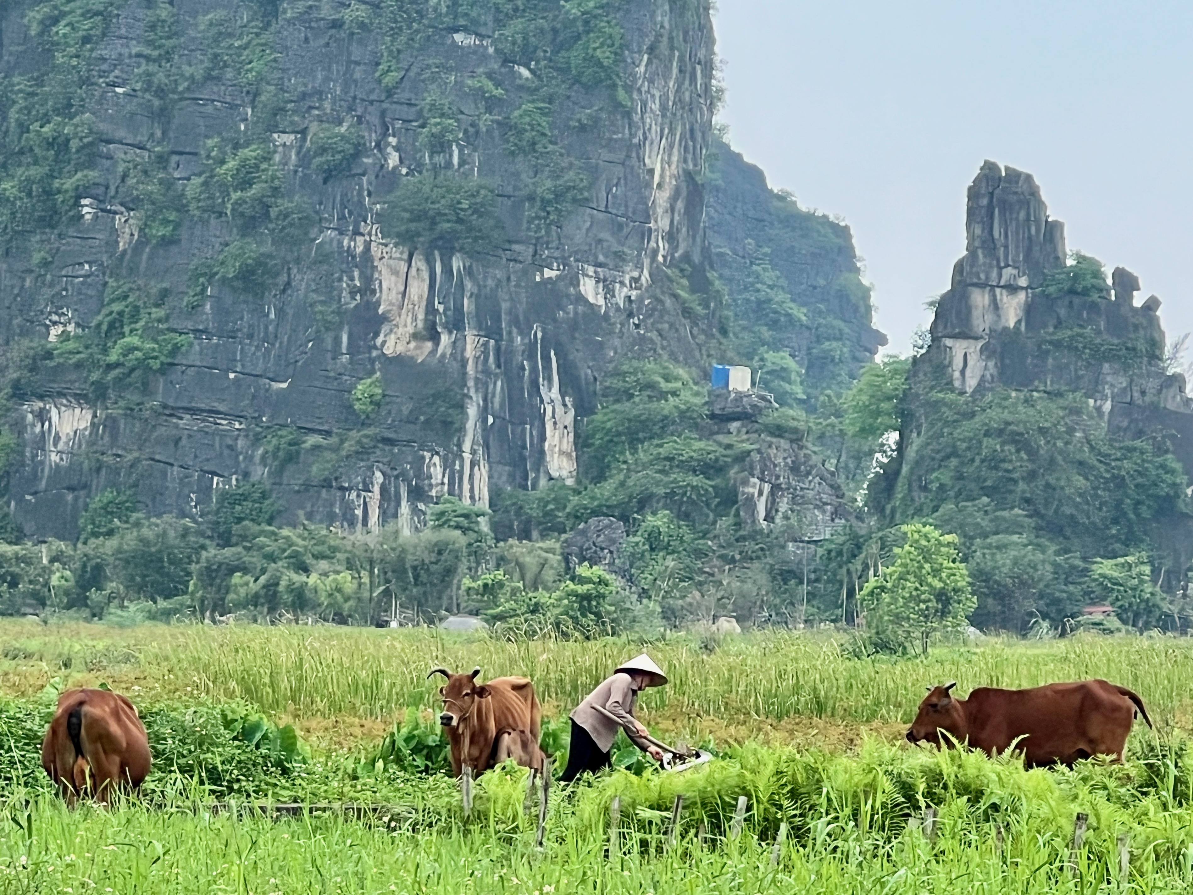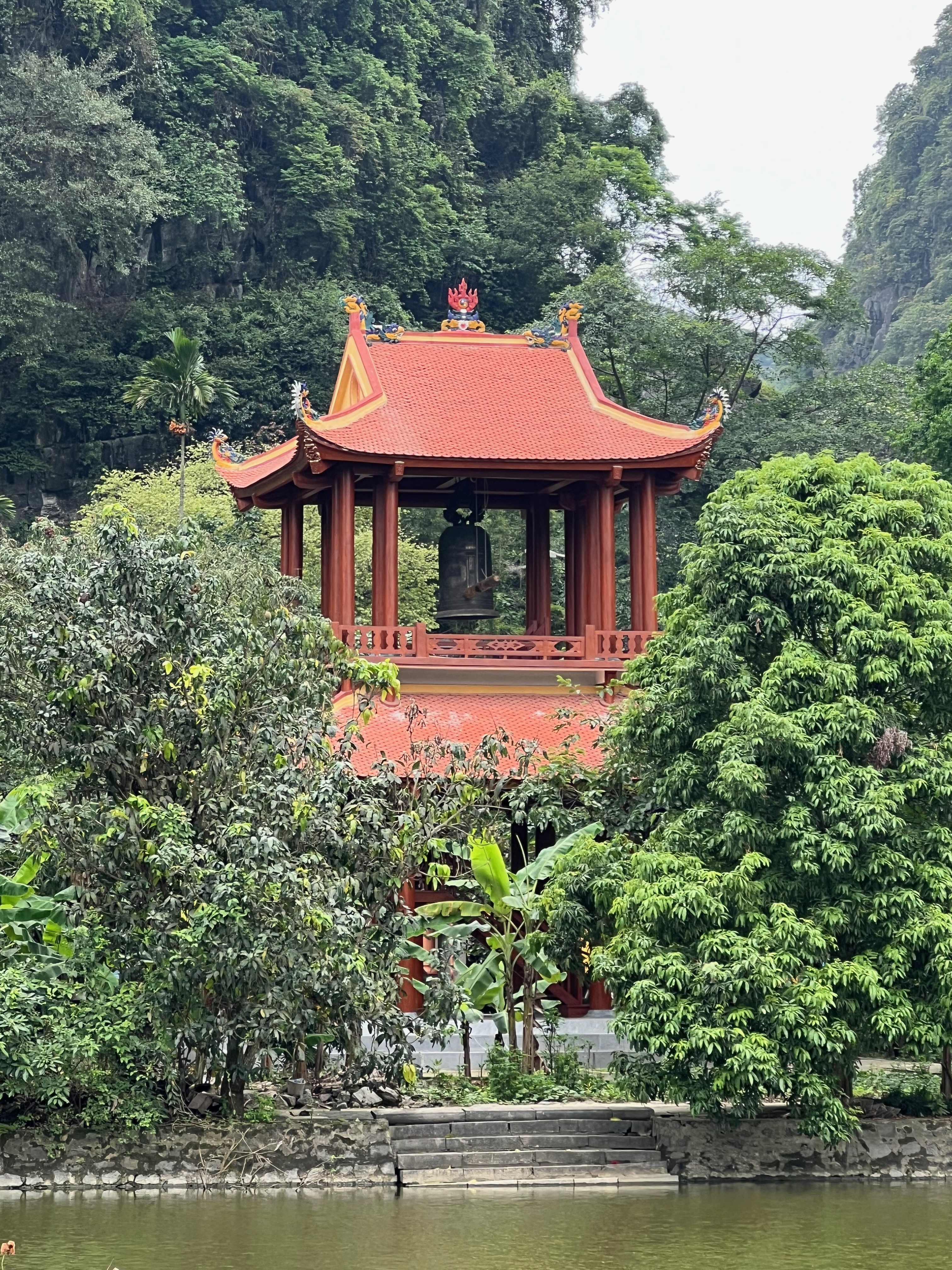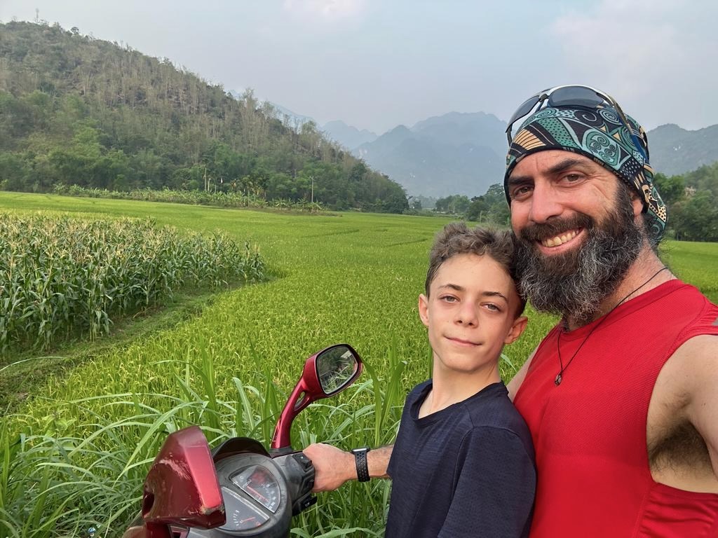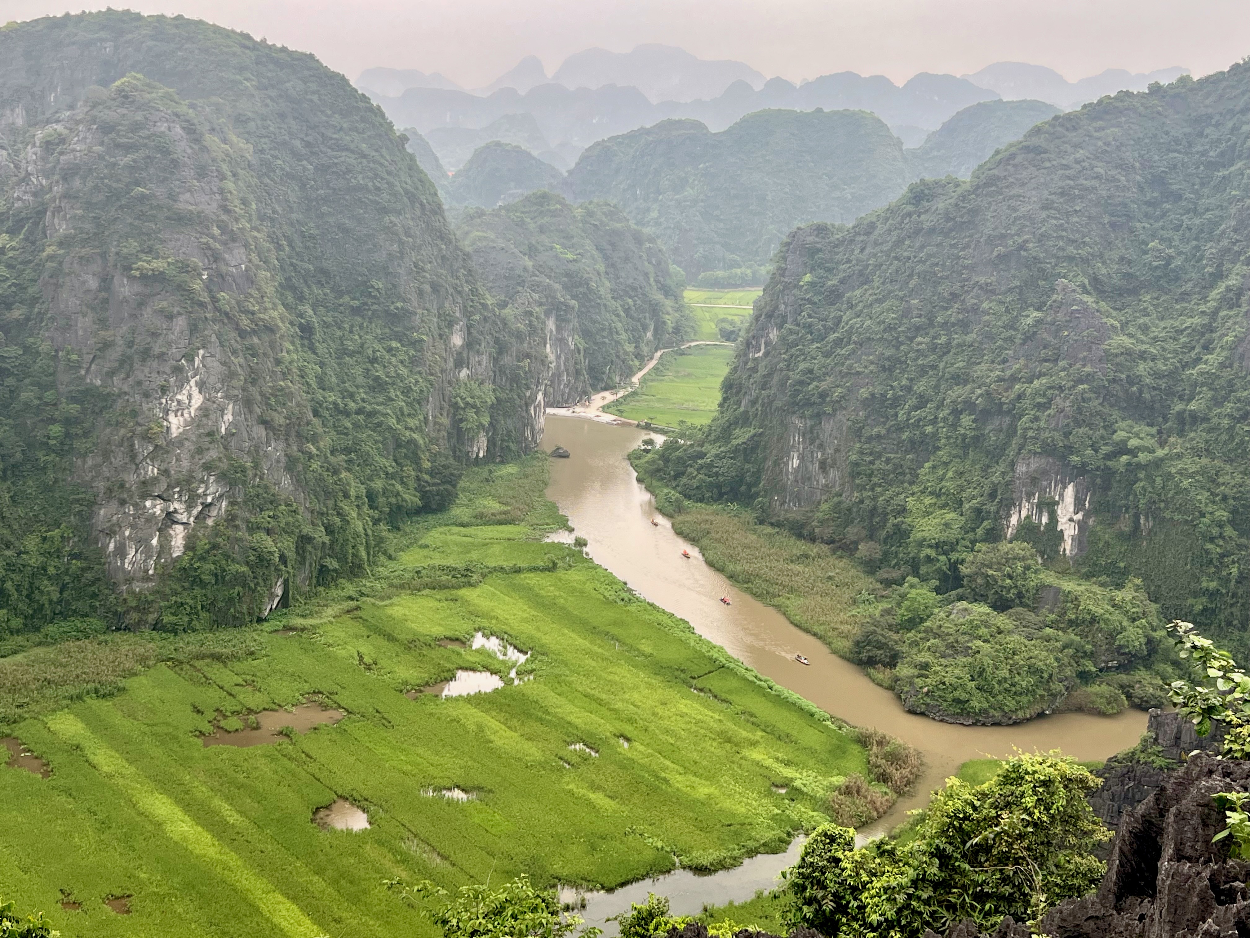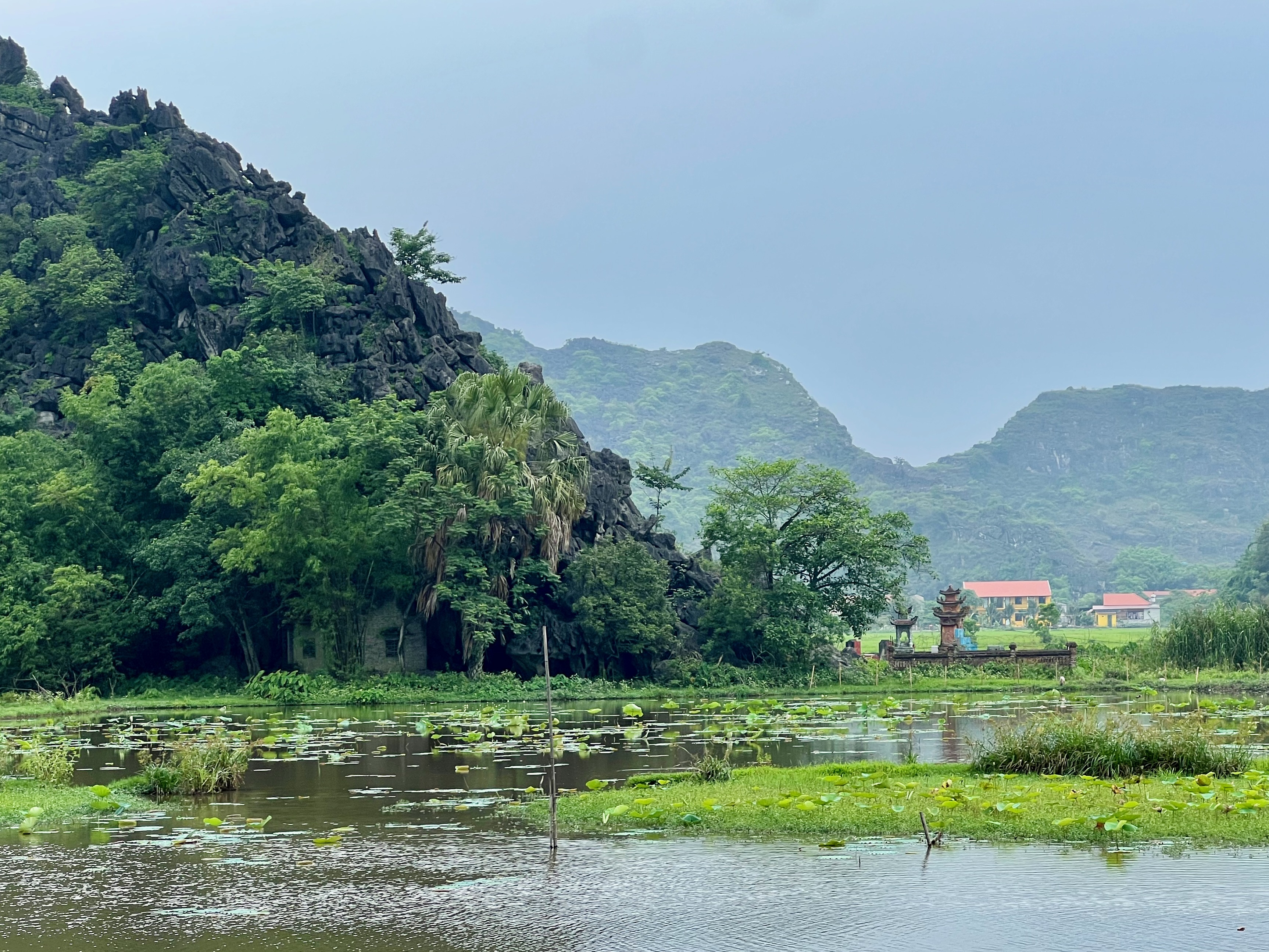 למחרת בבקר הכרנו את השכנים החמודים שלנו, נעם ועודי והבן שלהם איילון בן השנתיים. הופתענו שסה״כ על אף הפרשי הגילאים והשלבים השונים סה״כ בחיים, עדיין אנחנו חולקים לא מעט חוויות וגם אתגרים דומים, ושמחנו מאוד על המפגש. עשינו בקר רגוע של לימודים ואוריגמי וזמן איכות עם מבוגרים אחרים. ואחרי ארוחת צהריים יצאנו לטיול בשדות לכיוון תצפית מרהיבה על האיזור. טיילנו בין שדות אורז לשדות לוטוס, ומסביבנו צוקי גיר בולטים מהקרקע.. עד שהגענו למדרגות שמטפסות על אחד הצוקים.. לתצפית משגעת.. ממש מדהים.. צופים מצד אחד על הנהר שבו משייטות סירות תיירים ובצד השני השדות ובקצה הצוק פסל של דרקון, שבגללו כולם קוראים למקום התצפית עם הדרקון, במקום דאם סן האנג מואה – שזה משהו כמו ׳מערת ריקוד בריכת הלוטוס׳. באמת בבסיס הצוק יש גם מערה קטנה:)