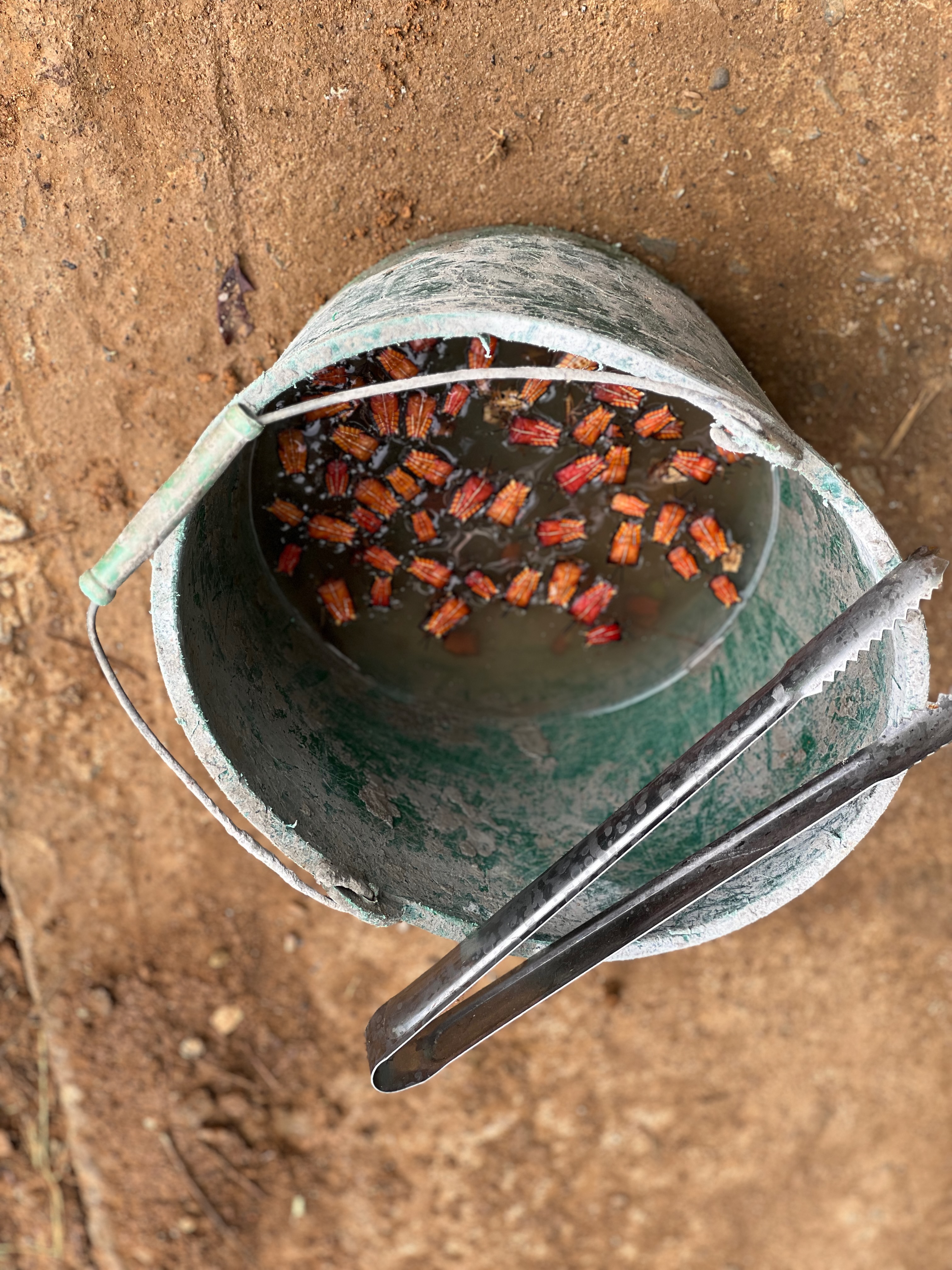 אספנו את הבעל מהמקום בו הוא ישב במרכז הכפר. ונסענו לבית שלהם, שם היא ציידה אותי בבננה ומניפה ישנה שלה.. שלא יהיה לי חם, בעלה הצטייד בחליפות סערה לשנינו למקרה שיתחיל גשם (נשמע כמו הרעיון הכי רחוק מהמציאות באותו רגע, אבל הערכתי את המחשבה). ויצאנו לדרך..