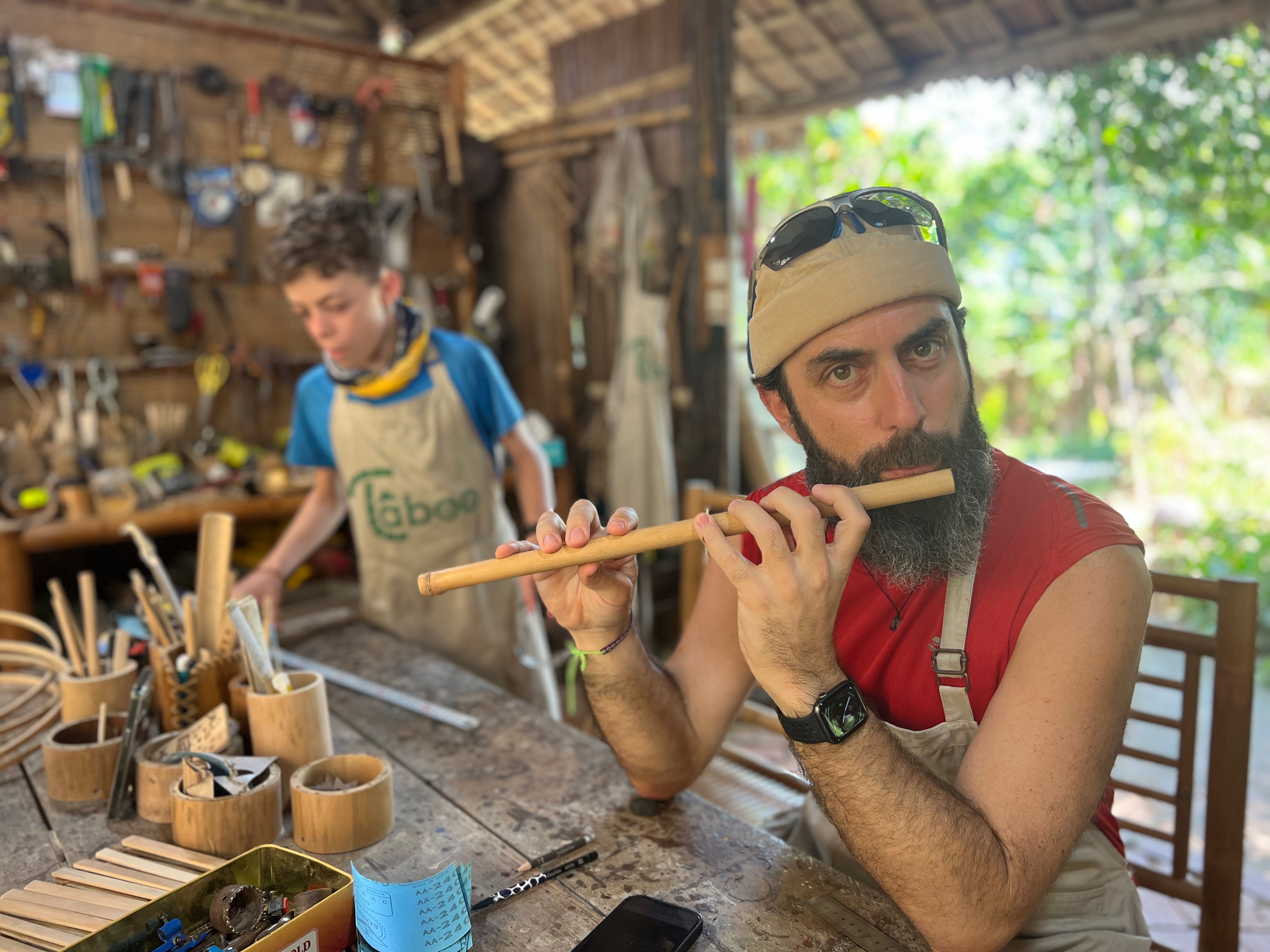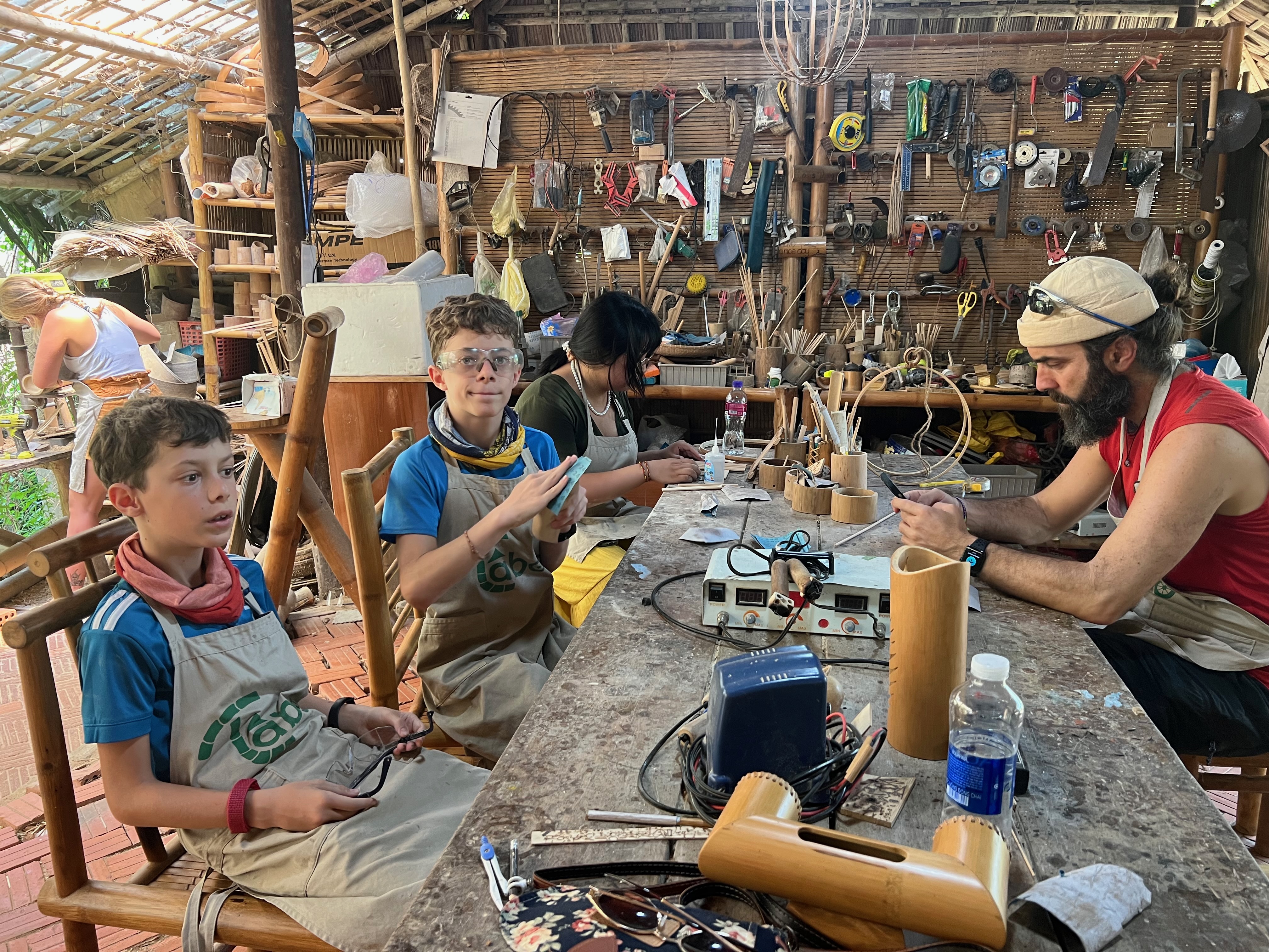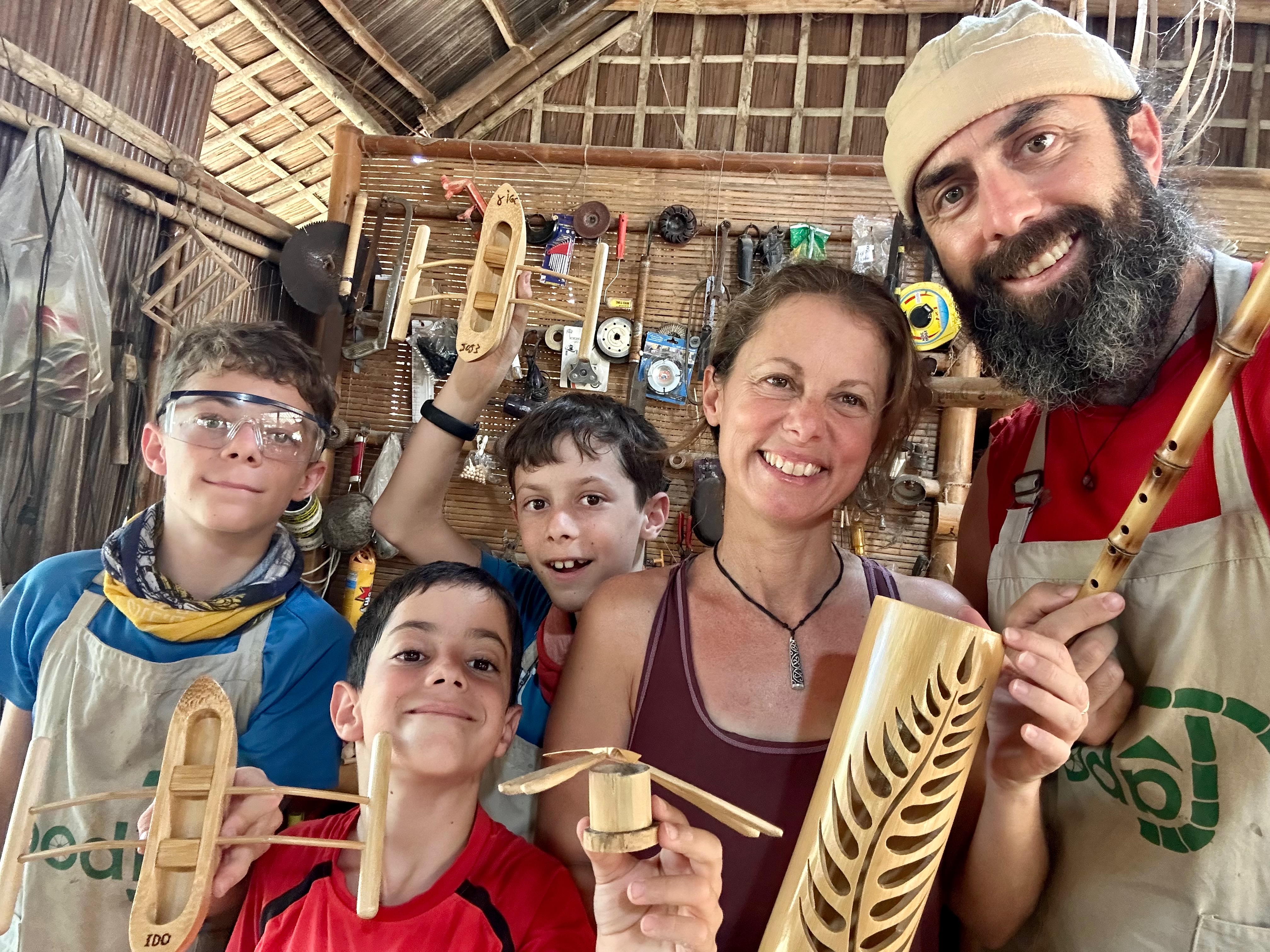 לא בדיוק ידעתי למה לצפות ואיך יזרום, אבל היה ממש ממש מקסים. כולם ידעו לבחור מה הם רוצים ליצור מתוך מגוון הדוגמאות היפהפה שהיה שם. הילדים בחרו באינסטינקטיביות דברים בדיוק לרמתם.. עומרי הכין שפירית שמתאזנת על המקל שהיא עומדת עליו. הוא ראה כאלה ביפן ולא הסכמנו לקנות כי לא חשבנו שישרדו את המסע.. עידו ועופר הכינו כל אחד סירה, אני הכנתי אהיל למנורה וגל הכין חליל. הכל מרמת הבמבוק הגולמי ועד היצירה המוגמרת. עם עזרה מהמדריכים המקומיים. היה כיף ומספק עד מאוד!