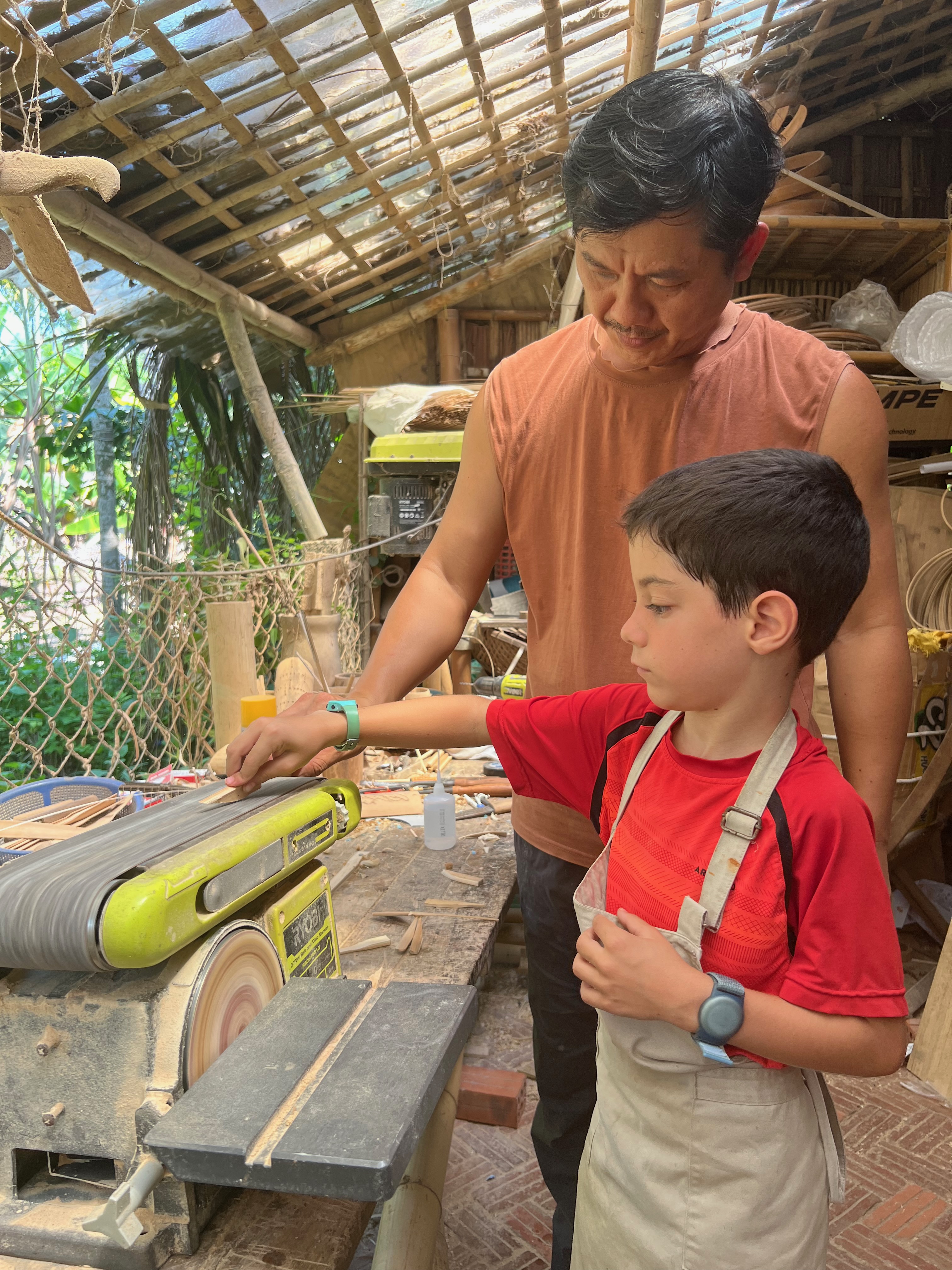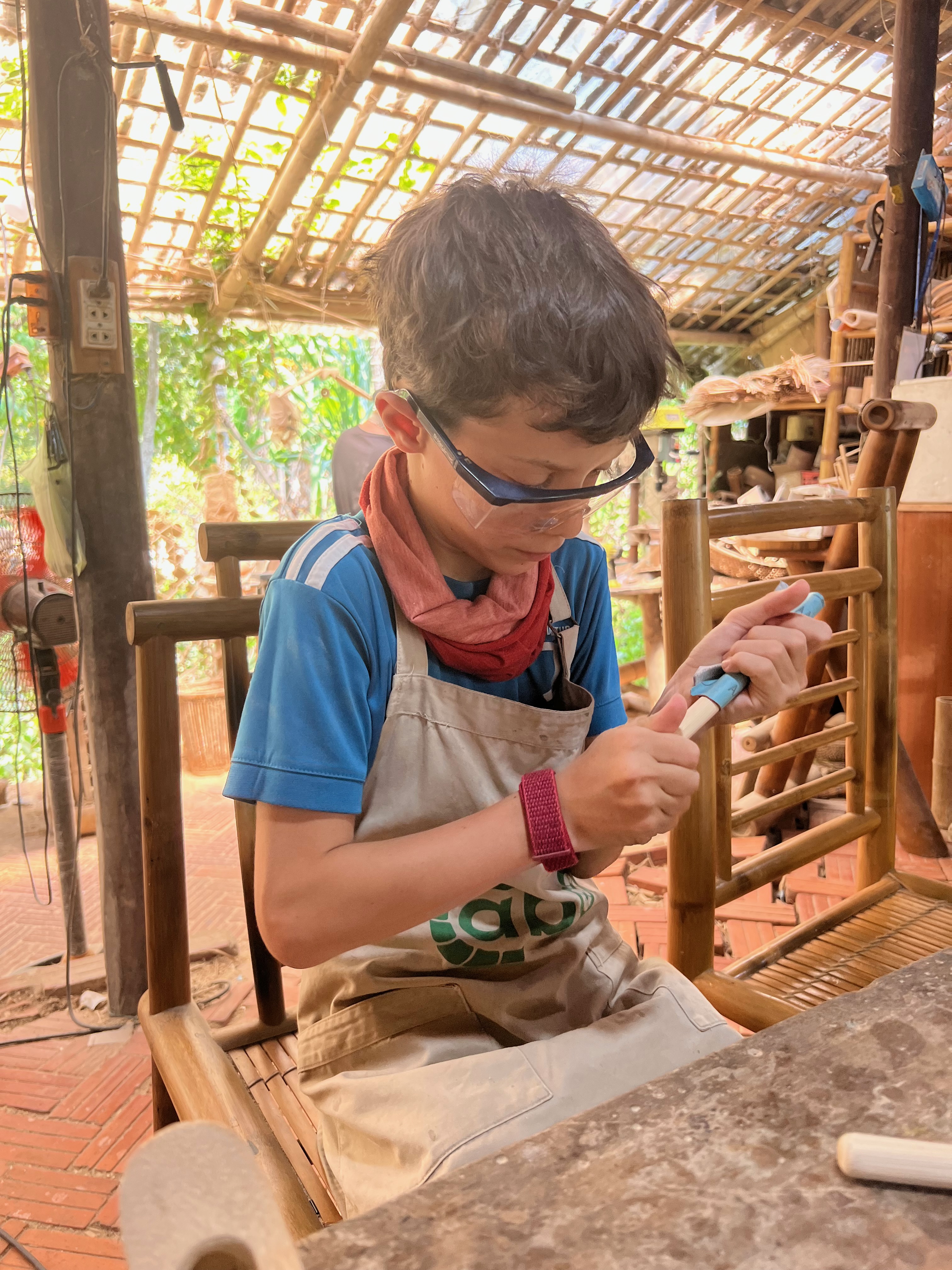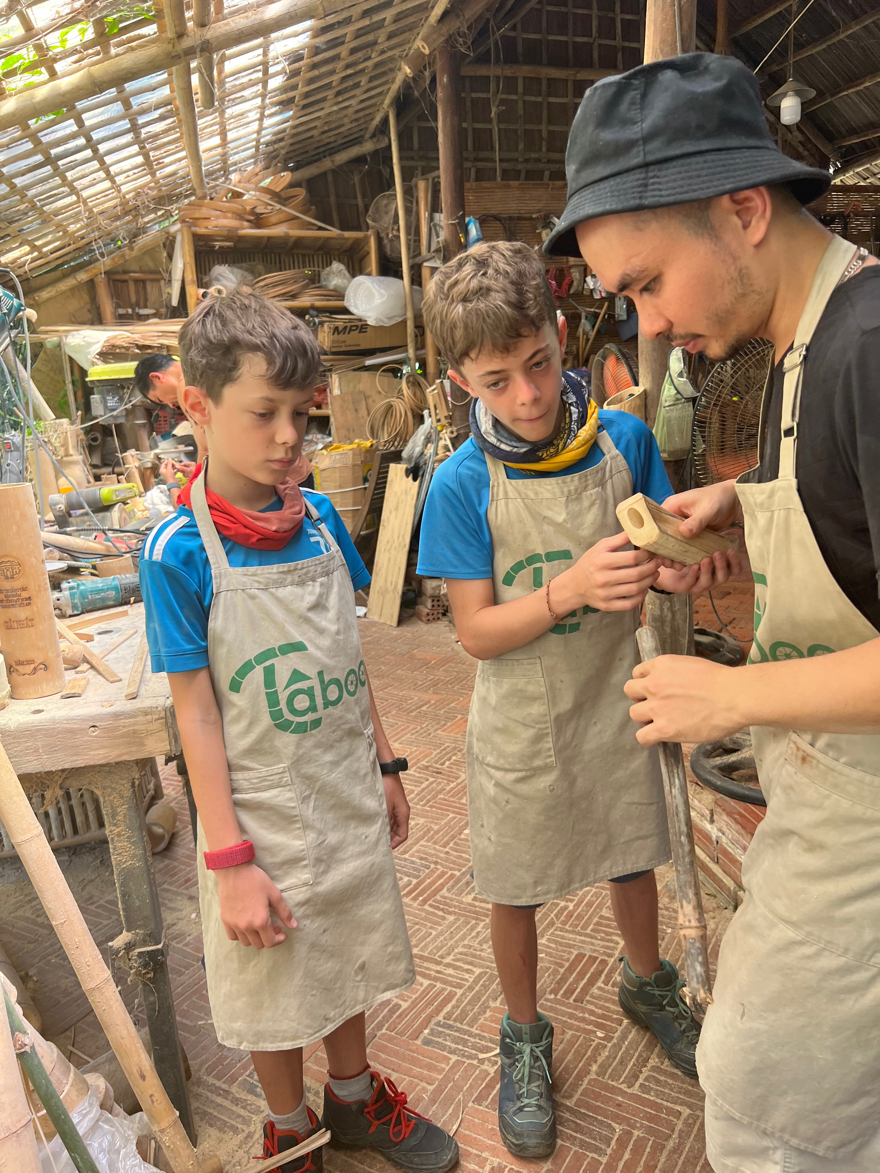 לא בדיוק ידעתי למה לצפות ואיך יזרום, אבל היה ממש ממש מקסים. כולם ידעו לבחור מה הם רוצים ליצור מתוך מגוון הדוגמאות היפהפה שהיה שם. הילדים בחרו באינסטינקטיביות דברים בדיוק לרמתם.. עומרי הכין שפירית שמתאזנת על המקל שהיא עומדת עליו. הוא ראה כאלה ביפן ולא הסכמנו לקנות כי לא חשבנו שישרדו את המסע.. עידו ועופר הכינו כל אחד סירה, אני הכנתי אהיל למנורה וגל הכין חליל. הכל מרמת הבמבוק הגולמי ועד היצירה המוגמרת. עם עזרה מהמדריכים המקומיים. היה כיף ומספק עד מאוד!