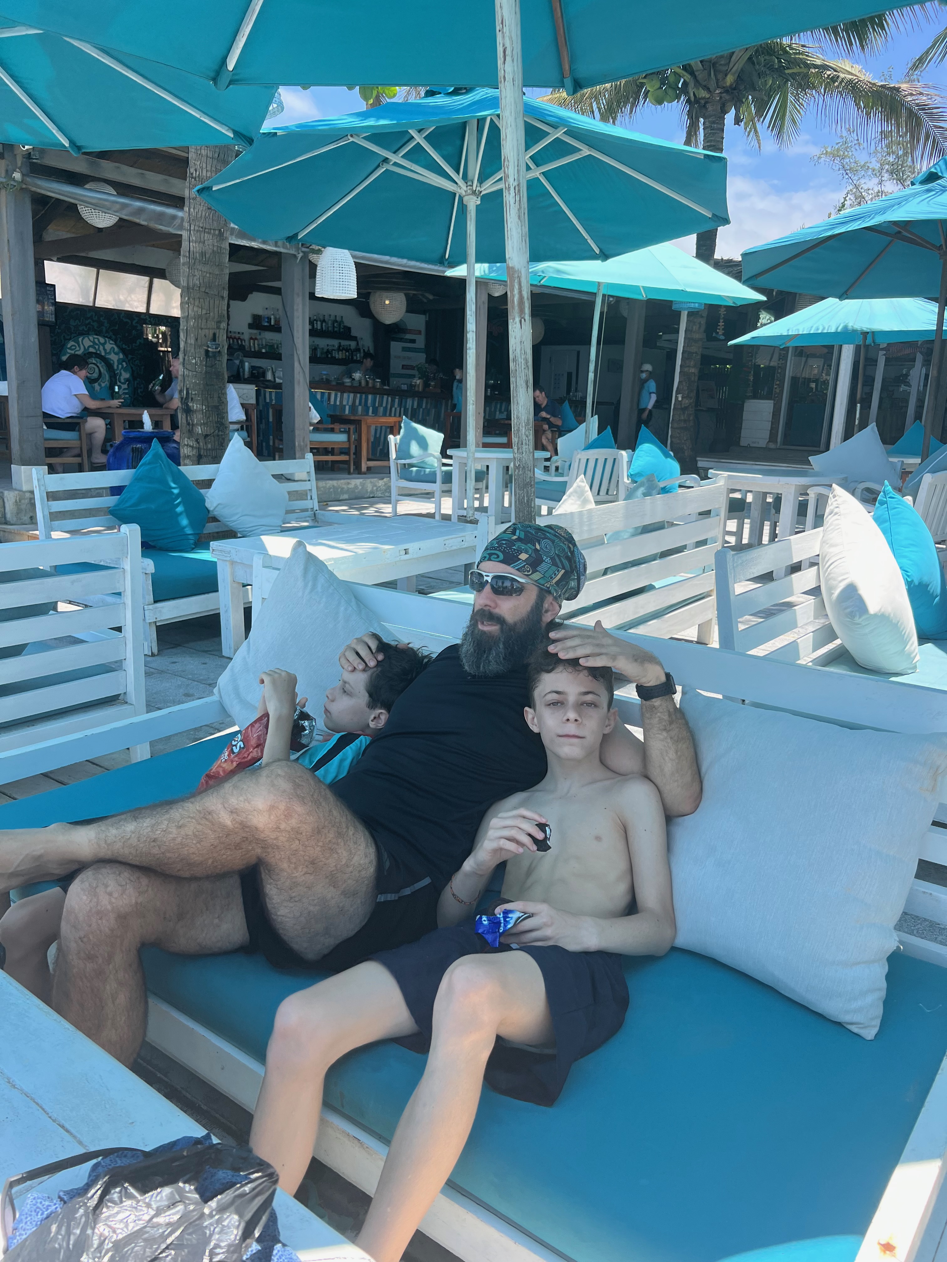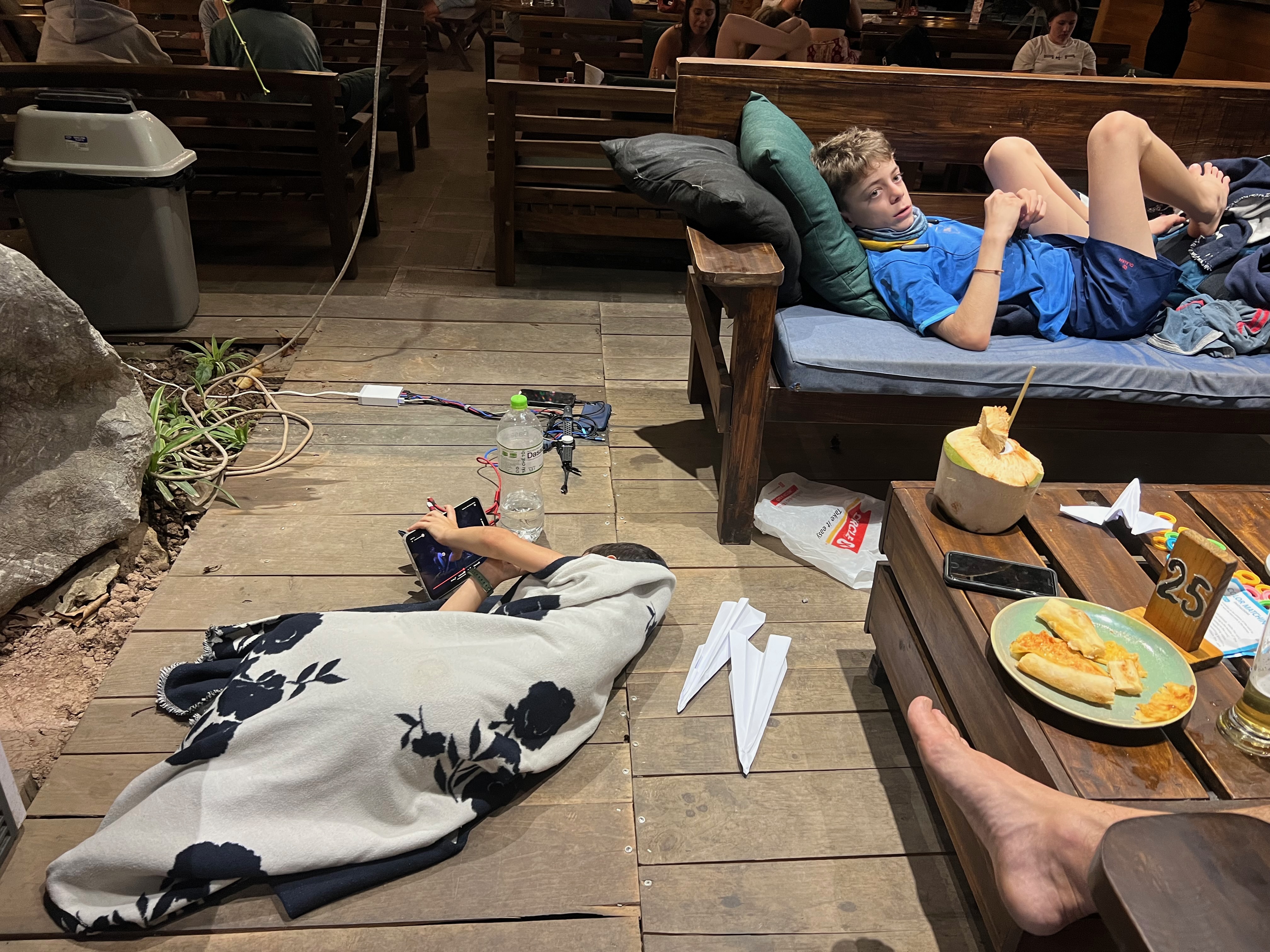כשסיימנו את השייט הילדים רצו להתחשב בנו שנלך לאכול איפה שאנחנו רוצים, וביקשו שהם ייקחו אוכל בטייקאווי למלון.. לקחנו את הצעתם בשתי ידיים, וגם עיגלנו עוד פינות. מצאנו את עצמינו בגסט האוז מגניב של תרמילאים מגניבים עם בריכה מגניבה ומוסיקה מגניבה, והיינו מגניבים קצת בעצמינו והתיישבנו שם לבירה וקוקוס.