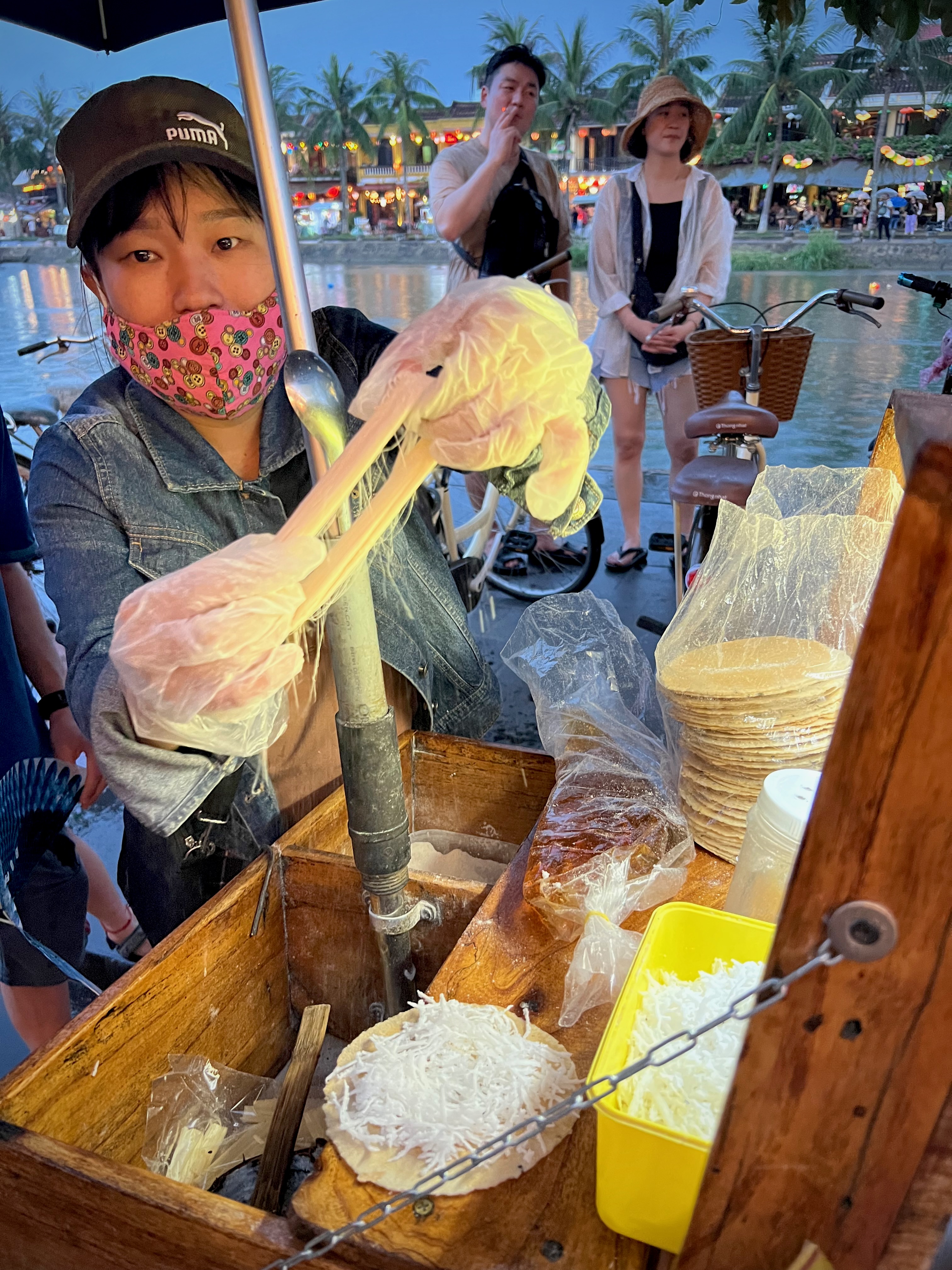 כשהתחיל הגשם תפסנו ״טרמפ״ עם מוכרת אוכל רחוב שהלכה עם העגלה שלה ומעליה מטריה ענקית. הלכנו איתה מתחת למטריה שלה עד שעצרה להציע את האוכל שלה לתיירים, אז קפצנו על ההזדמנות וביקשנו שתכין לנו גם מנה. היא לקחה משהו שנראה כמו דבש, ערבבה במשהו שנראה כמו קמח אורז והכינה מזה סיבים דקים דקים של דבש שנראו כמו משי. את זה שמה בתוך שני דפי אורז פריכים דקים דקים והוסיפה גריסי קוקוס מעל. קוראים לזה ״קוקוס משי״ וזה היה טעים מאוד!