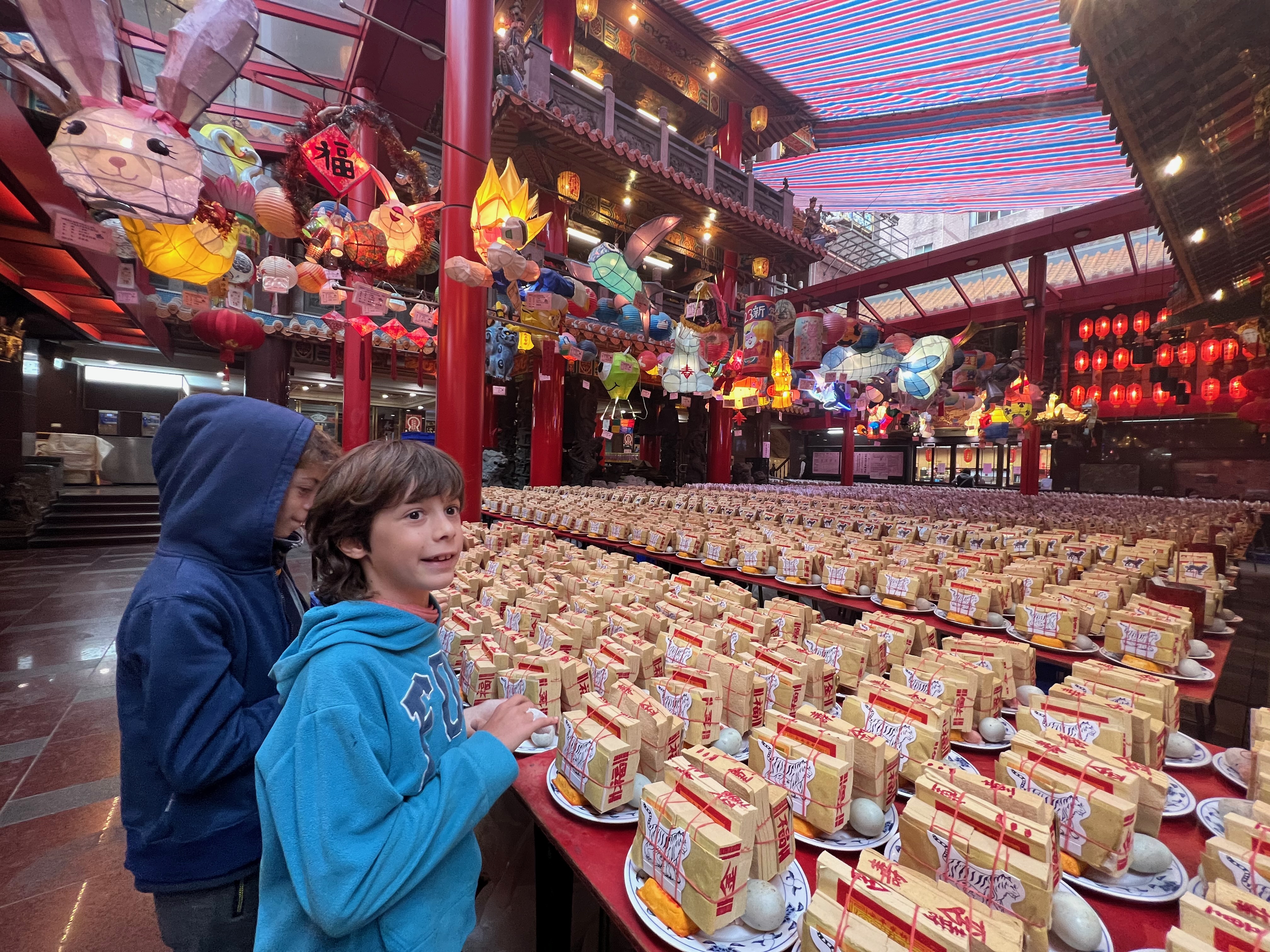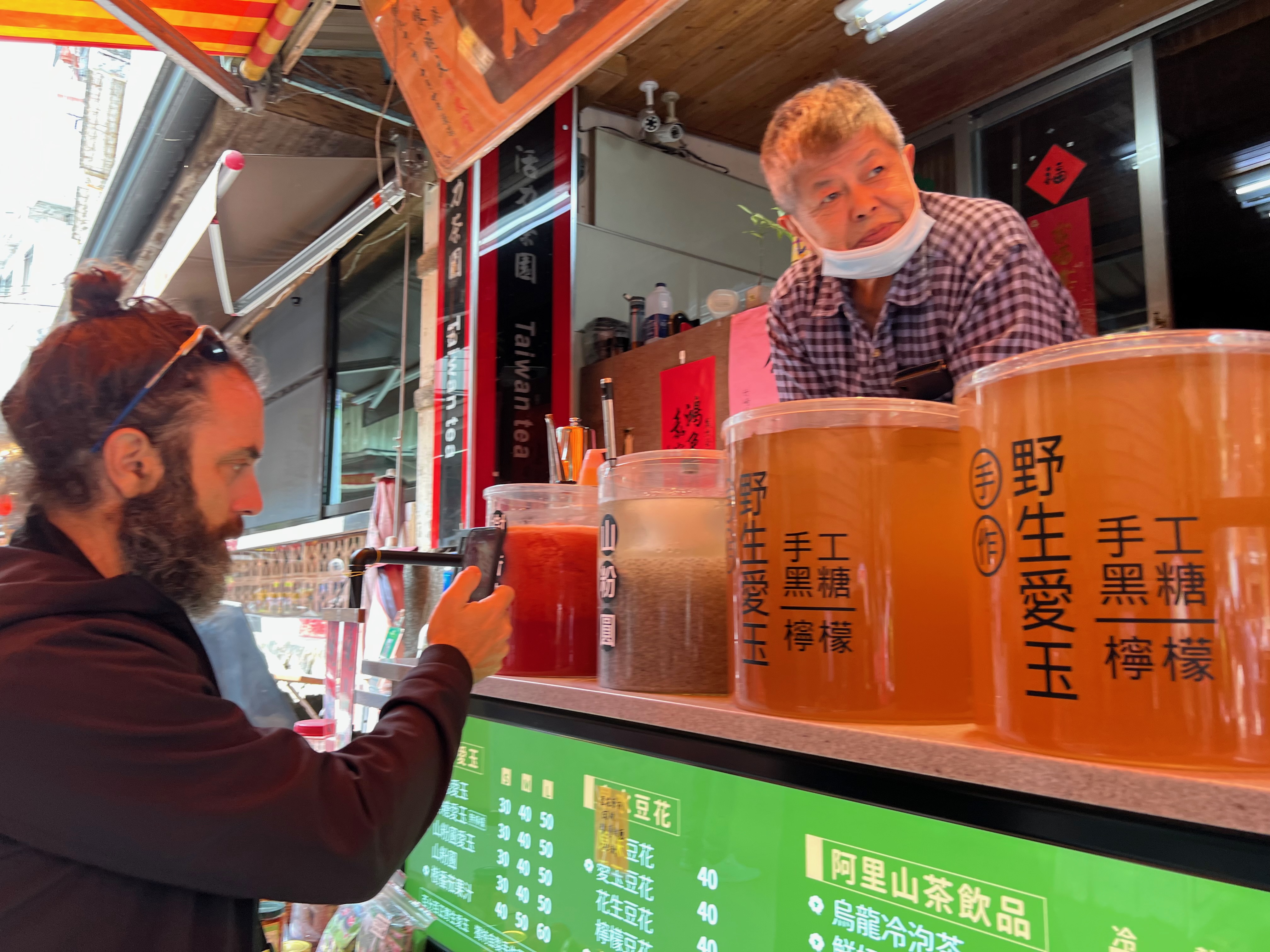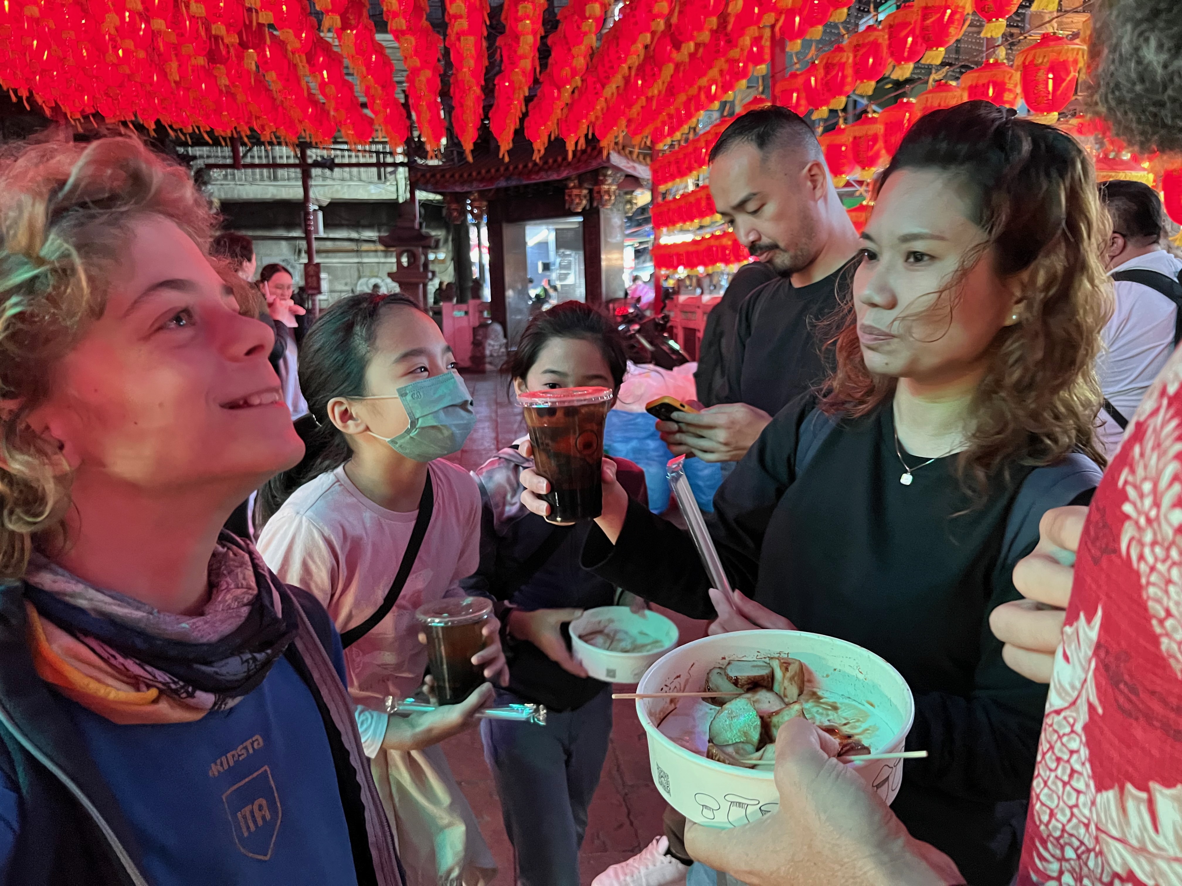 מאוחר יותר הגיעה האחיין שלה עם המשפחה שלו, יש לו שני בנים קטנטנים ומתוקים.. כשבן השנה ראה אותנו הוא כל כך נבהל לראות אנשים מערביים ועוד גבר עם זקן עד שהוא התחיל לבכות ועשה לנו ביי ביי כדי ללכת.. אכלנו איתם אזני המן ושתינו תה בועות שהטאייואנים מאוד גאים בו, ודיברנו על דתות וישראל והיה מעניין, עד שכבר היה באמת ממש מאוחר והקטנצ’יק שלהם עשה לנו שוב ביי ביי, הפעם בשמחה.