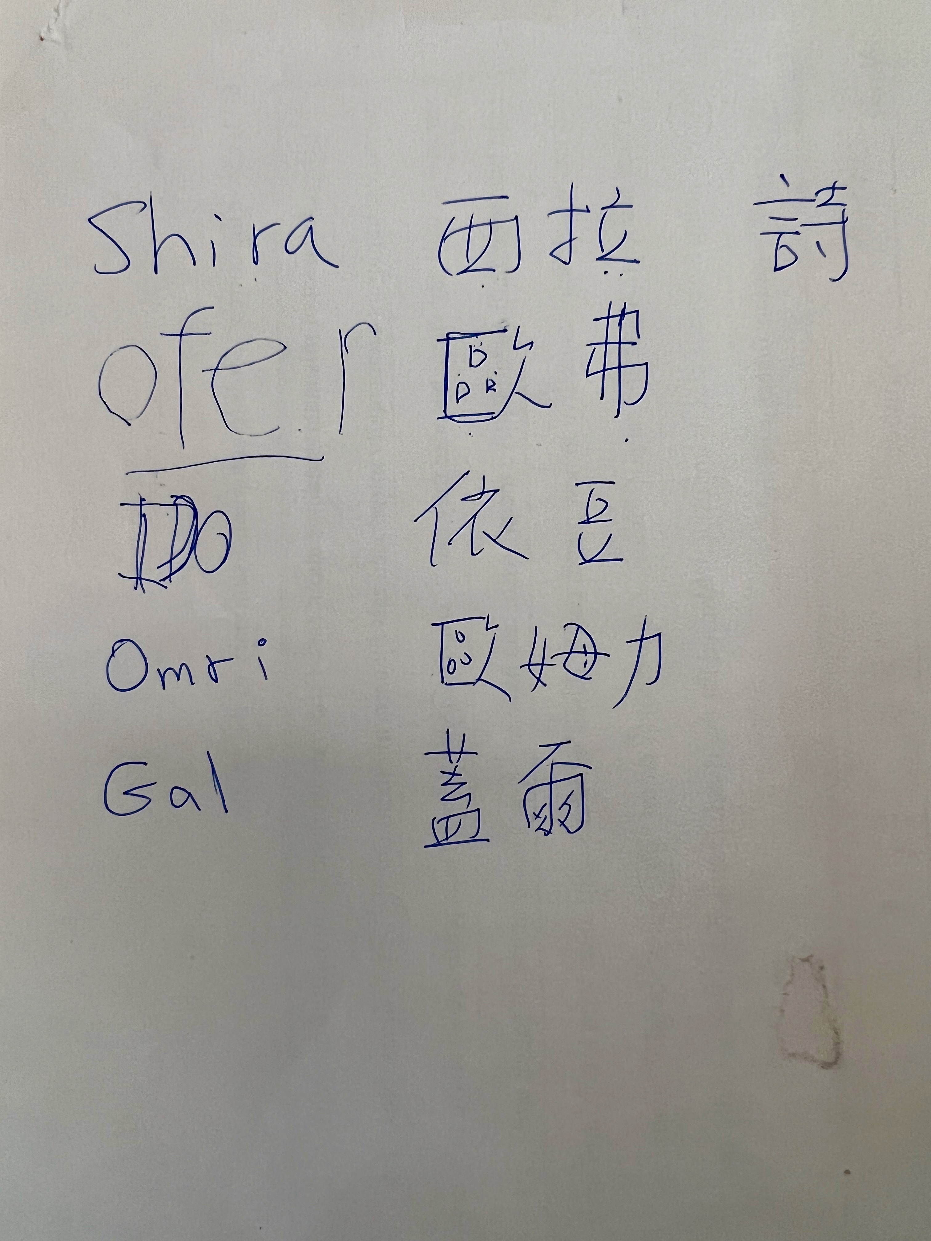 חזרנו לדירה, הילדים אכלו ארוחת ערב ואחר כך הראו לפיי את כל המילים שהם הצליחו ללמוד לכתוב בסינית, ופיי המקסימה התלהבה והסבירה להם – כל הכבוד, זה הר! כל הכבוד – זה איש! וגם הראתה לנו איך כותבים את השמות שלנו..