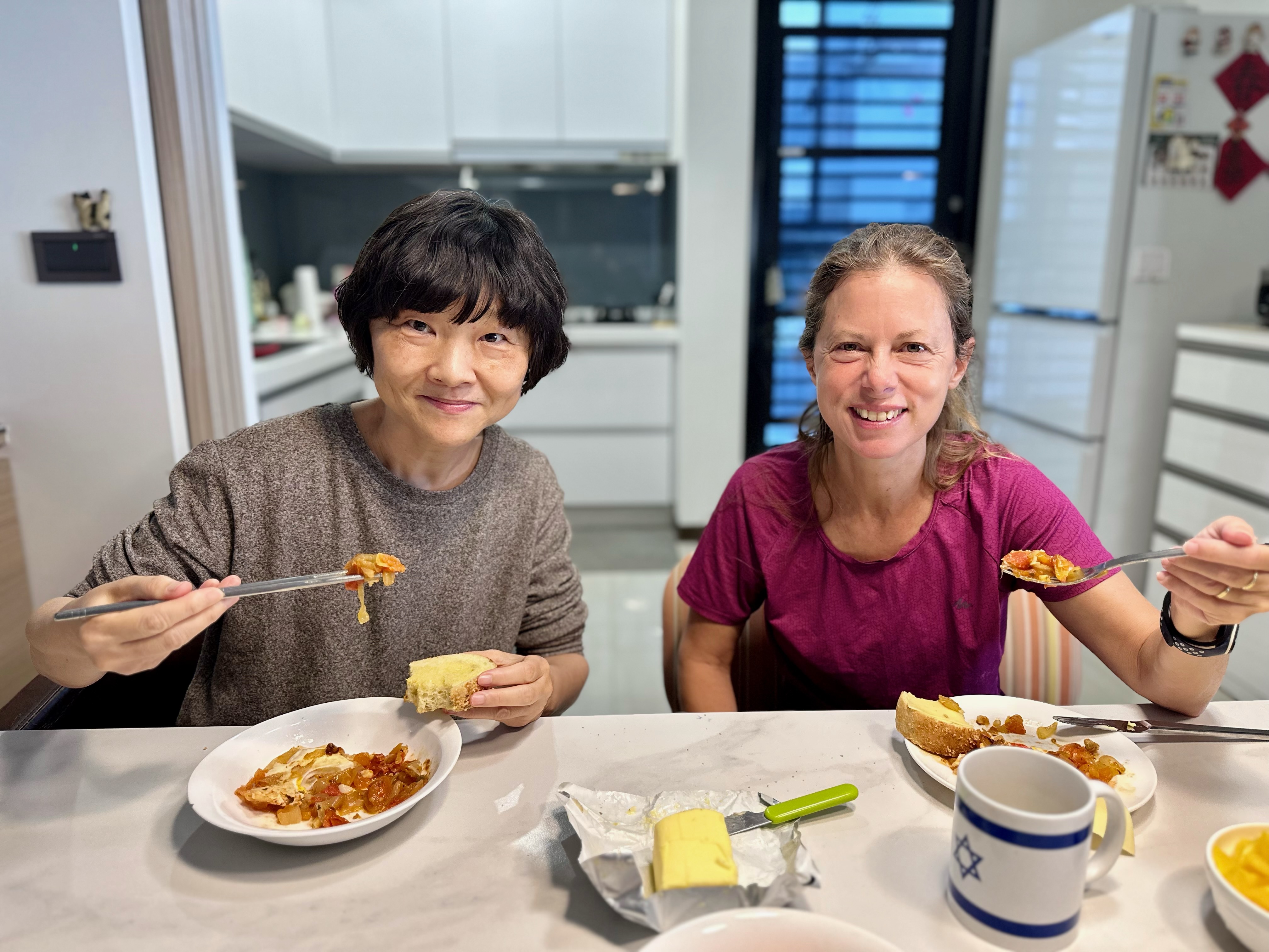 אחר כך קנינו כמה מאפים מקומיים שפיי המליצה עליהם בשוק שהצטרפו לארוחת בקר ביתית וטעימה מהמצרכים שקניתי יום קודם בסופר היפה שיש בו הכל מול הבית של פיי ואכלנו איתה ביחד ארוחת בקר.