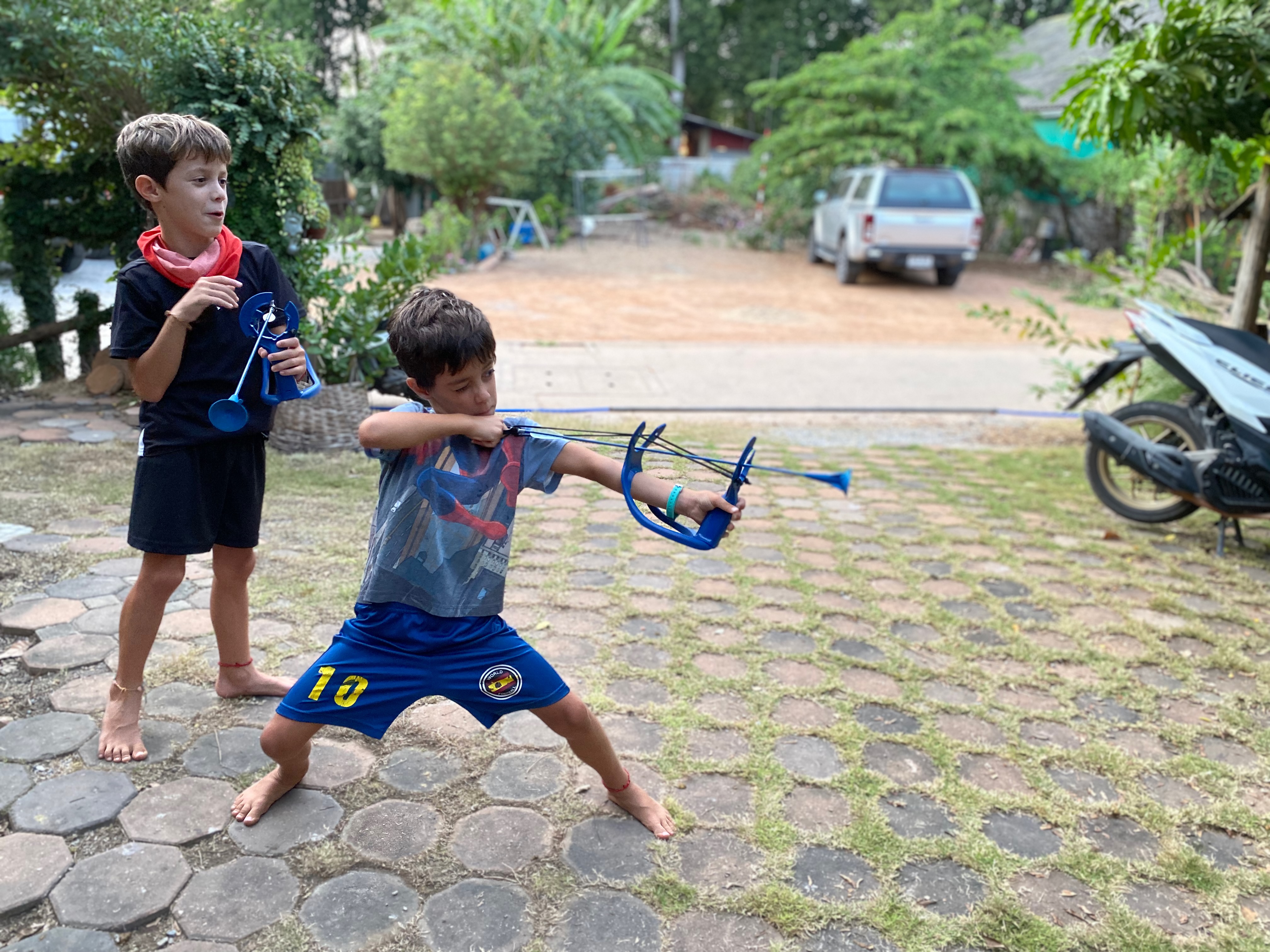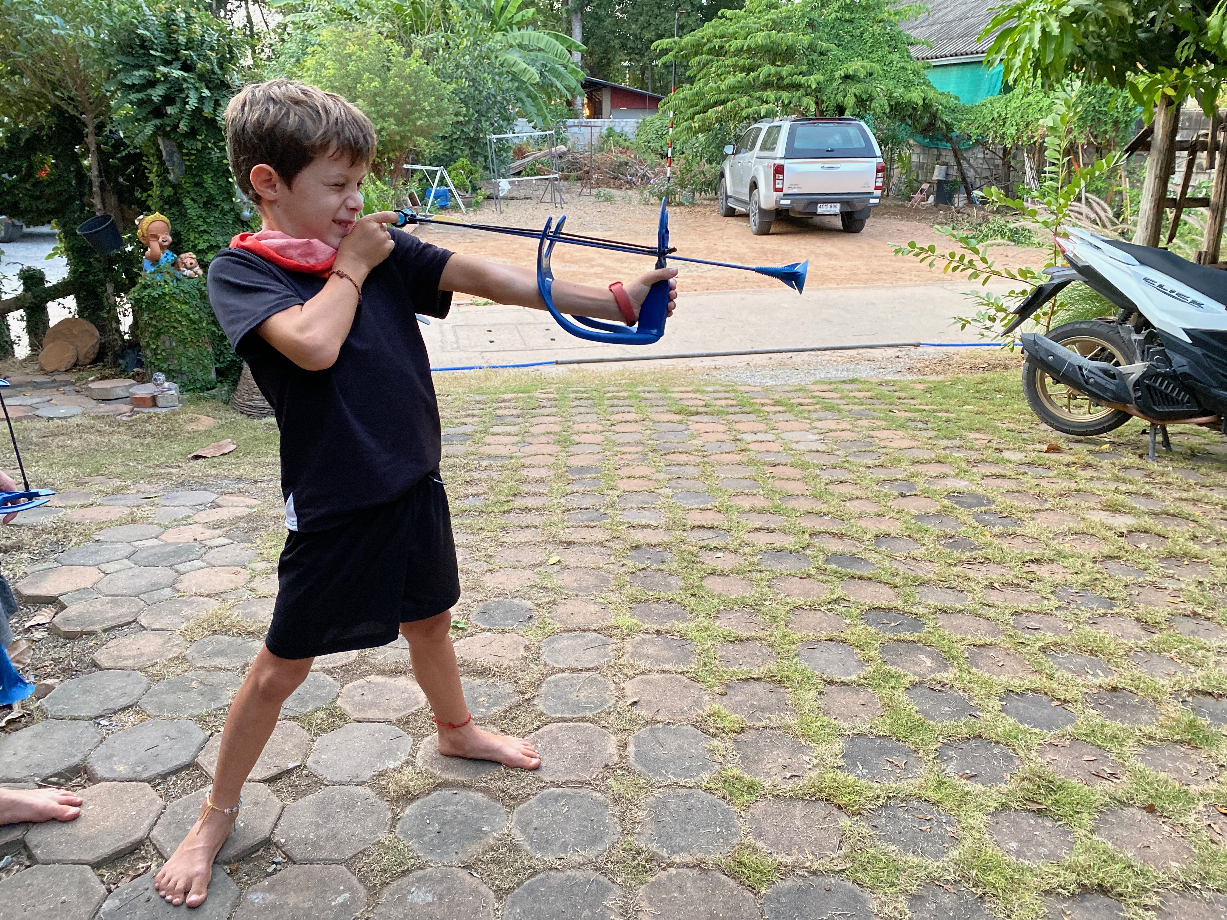 כמעט הזמנתי את הגסט האוז שישנתי בו עם דנה לפני 20 שנה, אבל בשניה האחרונה, היות והבנתי כמה קריטי זה שיהיה לנו נעים מרווח ונח, הלכתי על בטוח והזמנתי חדר שחברה וירטואלית שמטיילת בתאילנד המליצה לי עליו בגסט האוז קרוב אחר. ואכן יש פה חצר חמודה וחדרים מרווחים עם דלת מקשרת. הילדים שמחו על החצר ומיד התחילו טורניר בחץ וקשת שהם קנו בדקטלון, ואחר כך הלכנו בכל זאת לגסט האוז ההוא מלפני 20 שנה. ואכלנו בו ארוחת ערב מפנקת ומגוונת לכולנו. ב55 ש״ח.