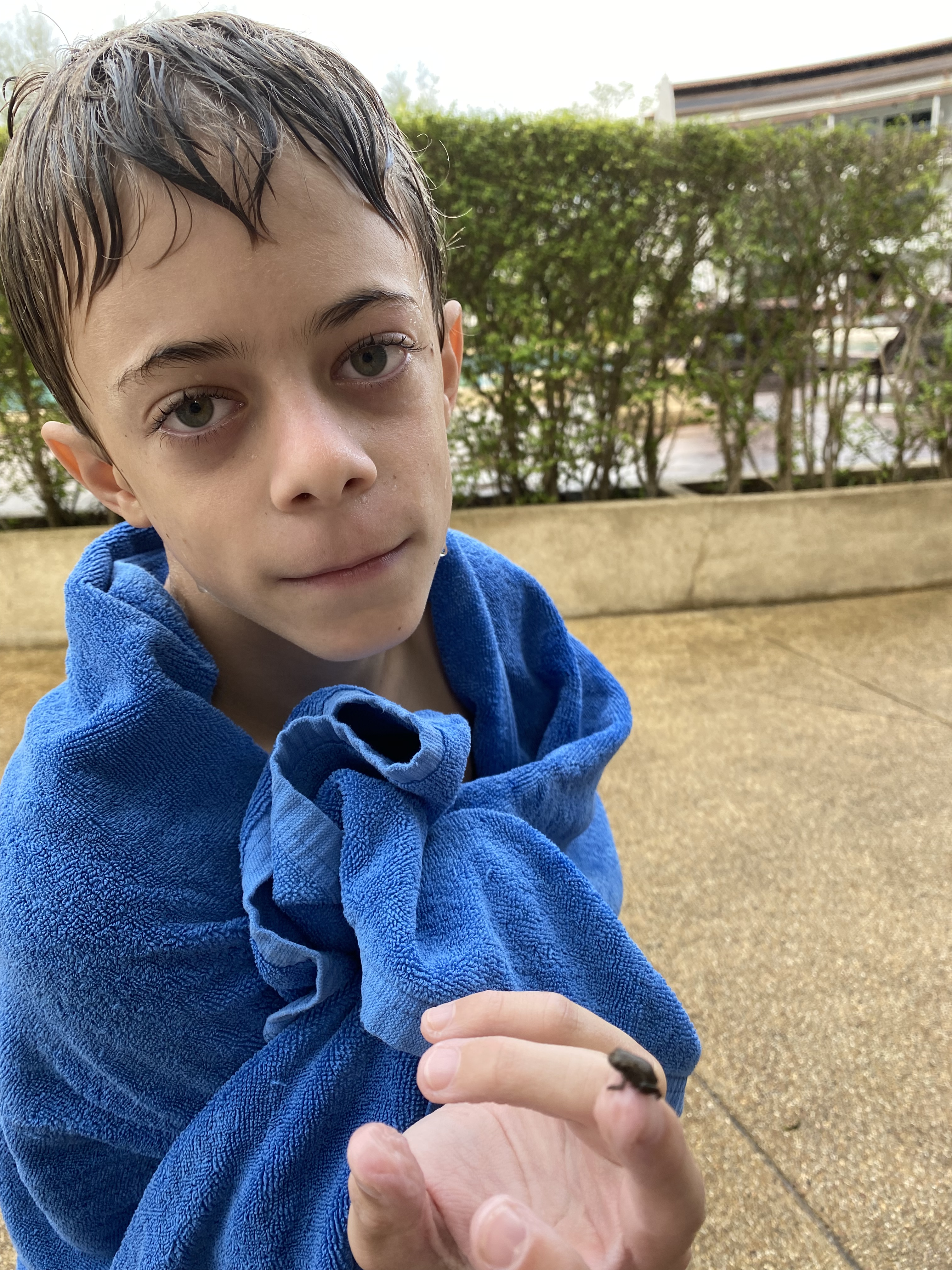יש פה גם מלא צפרדעים קטנטנות שמקפצות ממקום למקום, והילדים ישר פיתחו אליהם חיבה גדולה.. אז אנחנו מאוד נזהרים לא לדרוך עליהן. איך ששלפנו את הילדים מהבריכה הלכנו לבדוק מה שלום החבר הבורמזי שלנו, וגילינו שהוא פתח מסעדה בדיוק כמו שהוא חלם פה על החוף לידנו.. מדהים איך המקום נראה אחרת. (אותו לא פגשנו, כי הוא בדיוק לא היה שם, אבל בטח עוד נפגוש), ואז הלכנו למסעדת הבית האהובה שלנו – הדג המוזהב! הפעם צריך ללכת אליו כמעט קילומטר על החוף, והתאכזבנו מאוד לגלות, שהמצוף, שהילדים כל כך אהבו להתנדנד עליו נפל ביחד עם הענף הענק שהוא היה תלוי עליו.. אבל עדיין היה לנו טעים מאוד ונעים מאוד. הילדים כבר פיתחו שיחות עם הרוכלים פה, שמצידם נתנו להם לשחק בכל מה שהם מוכרים במחירים מופקעים בטירוף גם בלי לקנות אותם, ובאמת הלכנו משם בקושי, כי הבטחנו לילדים עוד שוק לילה היום..
