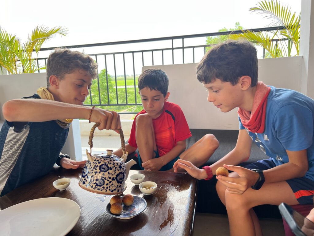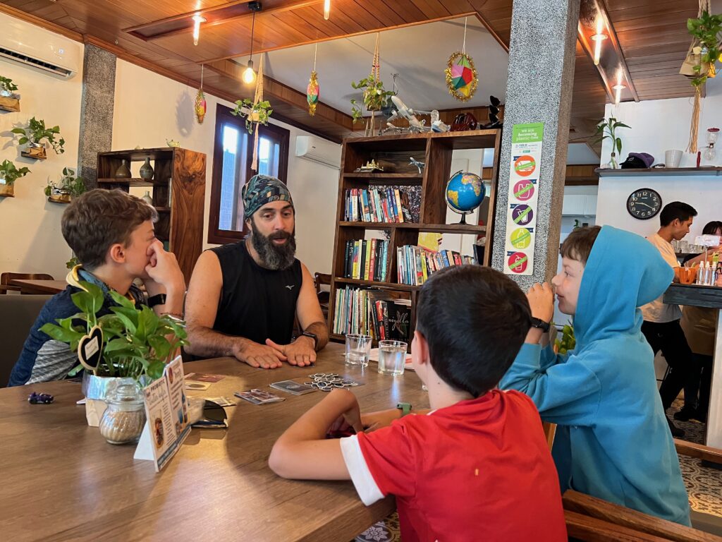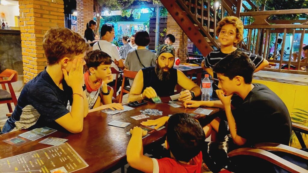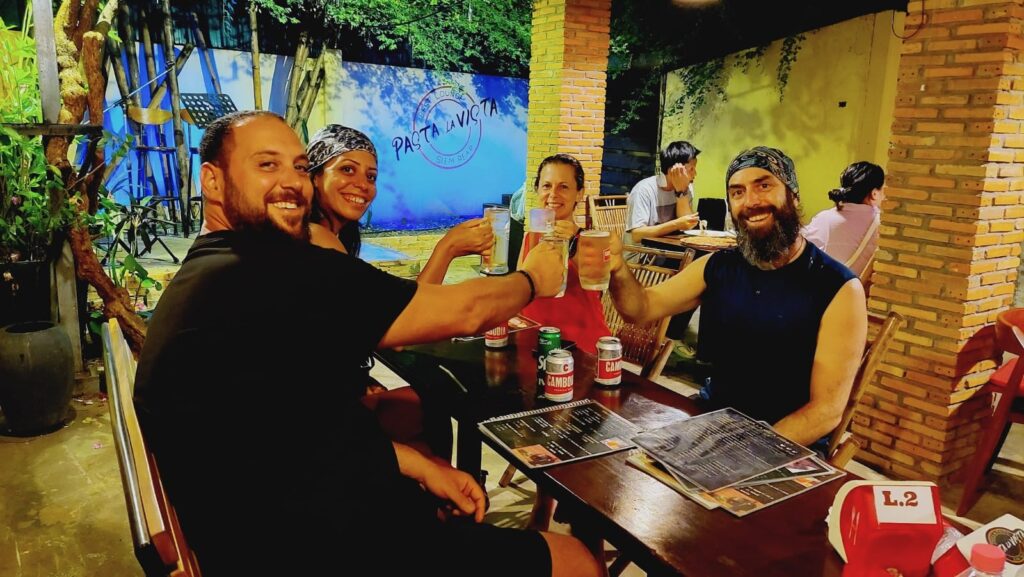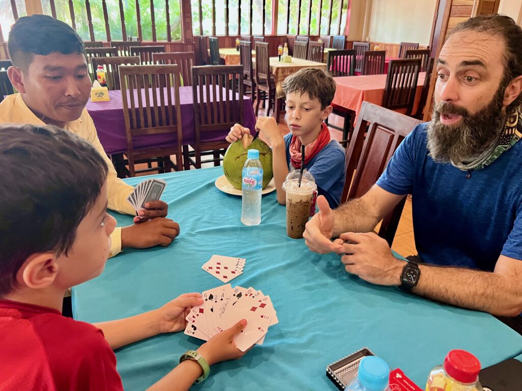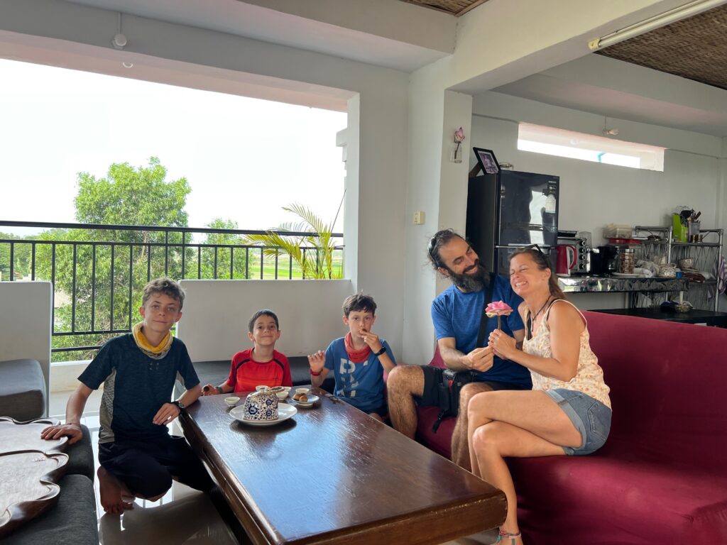 פגשנו משפחה מאוד נחמדה עם שני בנים ובת, והילדים התחברו ממש מהר. הם יצאו למסע שלהם רק לפני חודש, הגיעו לפני יומיים בנסיעת לילה מתאילנד. המשכנו ביחד לארוחת ערב..