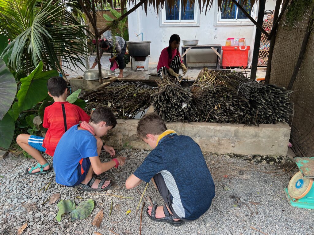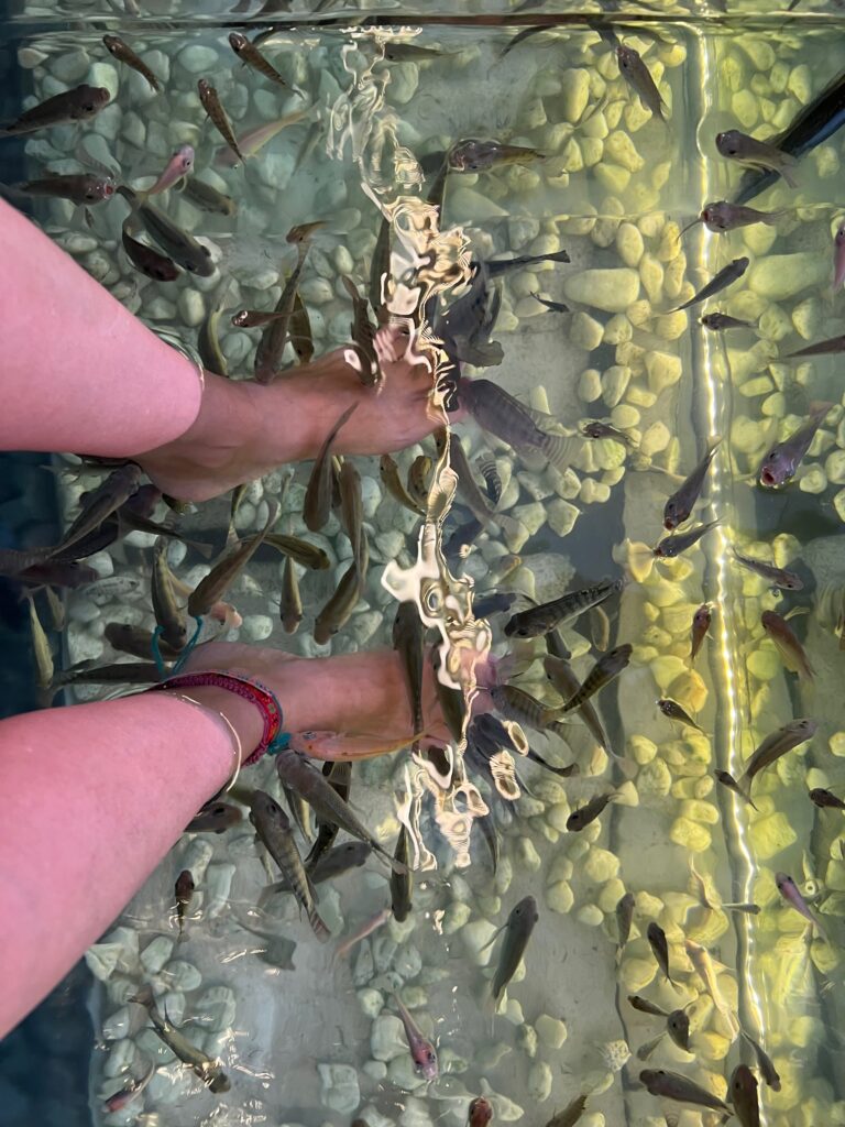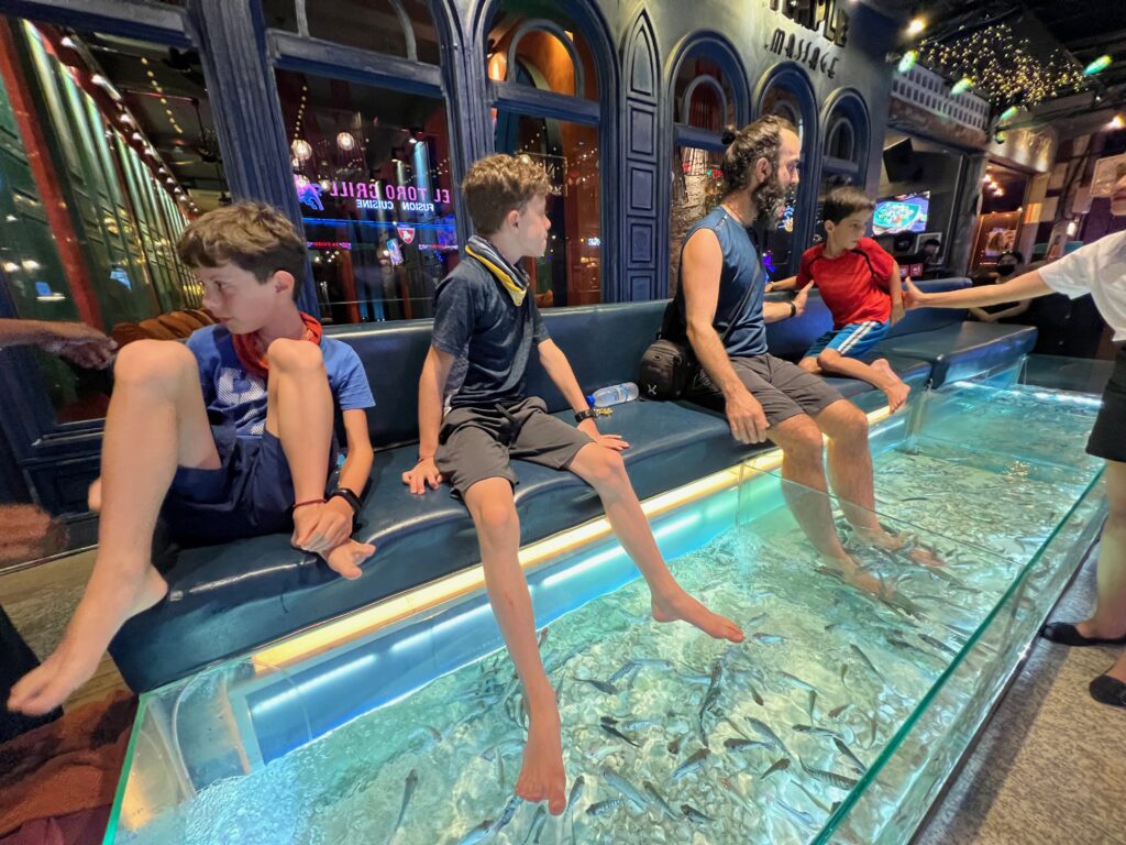 ישבנו במסאג׳ דגים שכזה ונזכרנו שזה ממש כיף (חוץ מעופר, לו לא היה כיף..) והסכלנו על העוברים ושבים ברחוב.. חיפשנו משפחה ישראלית עם שלושה ילדים שהגיע לסיאם ריפ ויצרה איתנו קשר דרך אחת הקבוצות.. זה היה לגמרי בליינד דייט, אז נוצר המצב שאנחנו יושבים עם הרגליים באקווריום והדגים מנשנשים, וכשעוברת משפחה מולנו, אני קוראת לעברה.. ליאב..? לירן…?? אנחנו במקום די קטן, אז בנסיון השני הצליח לי:)