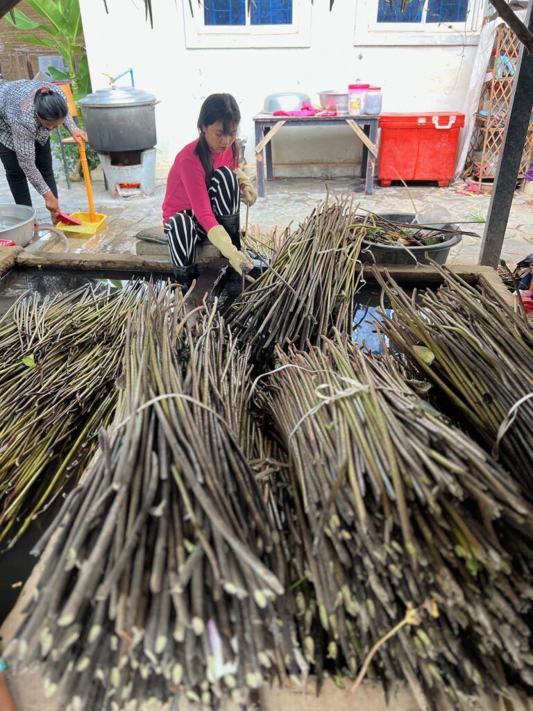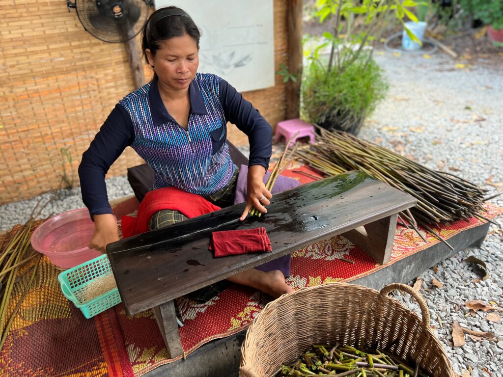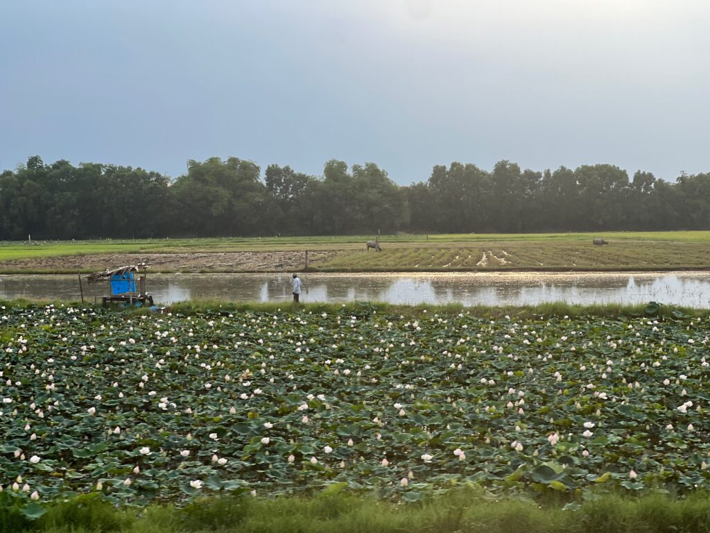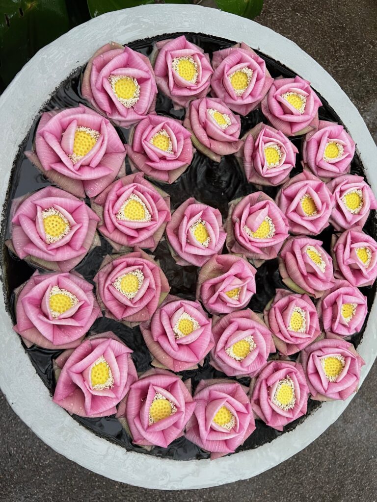 אז חיפשנו לנו טיול נחמד אחר בסביבה לאחר הצהריים וגל מצא לנו חוות לוטוס. בלי ממש להבין מה יש שם, לקחנו רקשה לכיוון, וגילינו מקום מעניין ממש! הראו לנו איך משתמשים בצמח הקדוש הזה לכל כך הרבה צרכים.. הם טווים ממנו בדים.. מסתבר שבגבעול שלו יש סיבים כמו חוטים ארוכים וחזקים וגמישים, שהראו לנו איך מלפפים אותם לחוט ומכינים מהם בדים ומהם צעיפים ובגדים. מכינים מהשאריות של הצמח חומר דמוי עור – ׳עור טבעוני׳, שמכינים ממנו תיקים את הזרעים אוכלים וגם את הפרי את הפרחים מגישים במנחה במקדשים כמובן, ובסוף גם כיבדו אותנו בתה לוטוס ועוגיות.. היה מעניין מאוד ונעים.