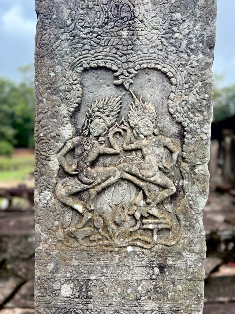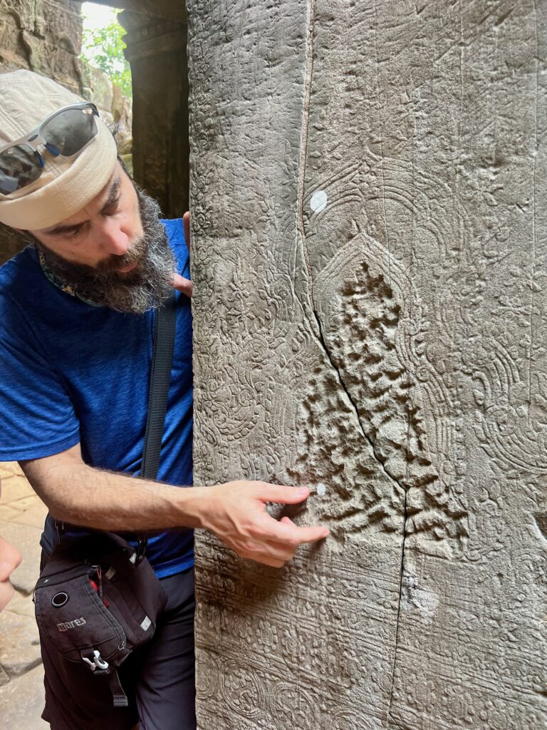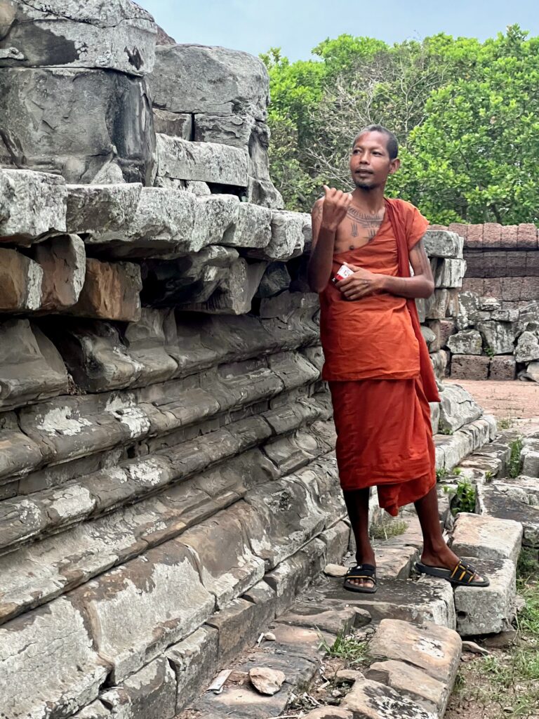 המדריך הסביר לנו על שלושה סוגים של מקדשים שכל מלך בונה – לאלים, לעוצמתו שלו, ולאבותיו מולידיו. השניים הראשונים יבנו בצורת הר – כמו ההר האגדי מרו שעליו שוכנים האלים ההינדים והשלישי שטוח. הראה לנו איך גירדו את כל הבודהות מהקירות כשהמקדשים הפכו מבודהיסטים להינדים. הסביר על סוגי האבנים שהתשמשו בהם לצורך הבניה וגם איך ככל הנראה סחבו אותם לפה. על ארבעת הפנים של הדמויות במקדשים והמשמעות שלהם. איך כבר אז חפרו בורות לאגירת מים בעונה הרטובה, שיהיה מספיק גם לעונה היבשה. ועוד ועוד..