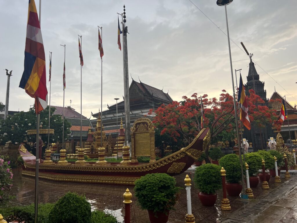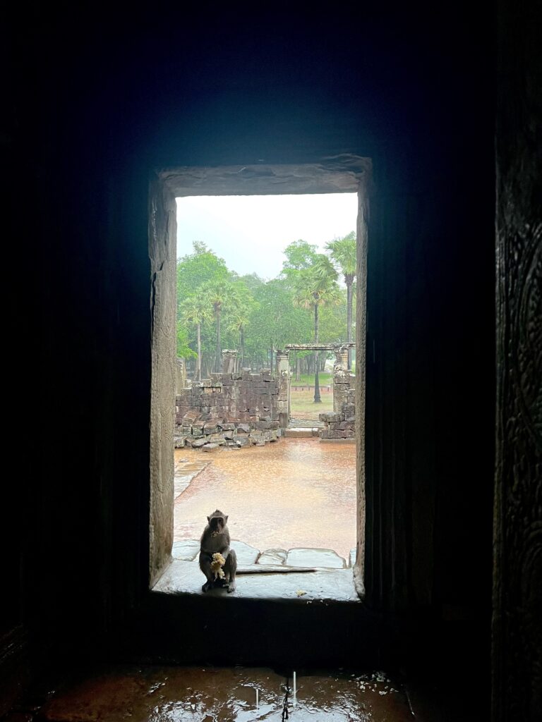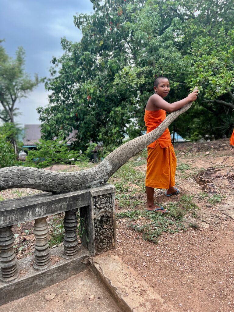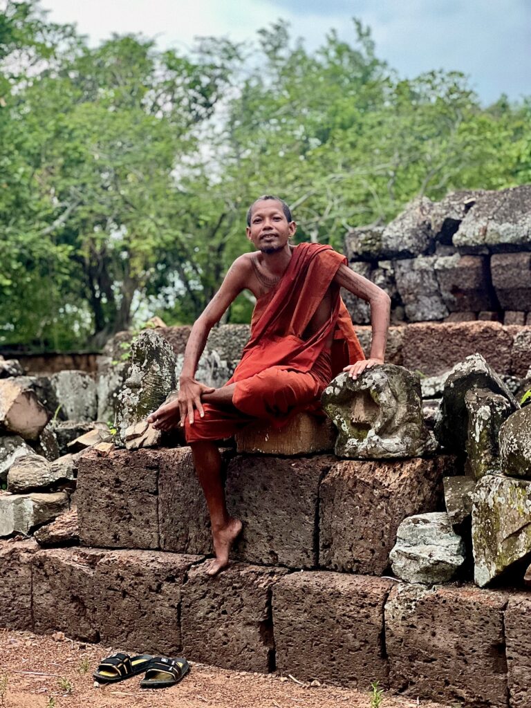 לקחנו רקשה לגבעה שבראשה שוכנים עתיקות של מקדש מהמאה ה-9, אחד העתיקים שנשמרו בסביבה. הריקשה יכולה לעצור רק למרגלות הגבעה, והמקדש – איך לא – נמצא בראשה. טיפסנו למעלה, ואמנם לא היתה שקיעה, אבל היתה אווירה מקסימה וקדושה ונוף יפהפה של נהר המקונג שנשפך לאגם מים מתוקים הכי גדול בדרום מזרח אסיה, שמשקה את כל קמבודיה.