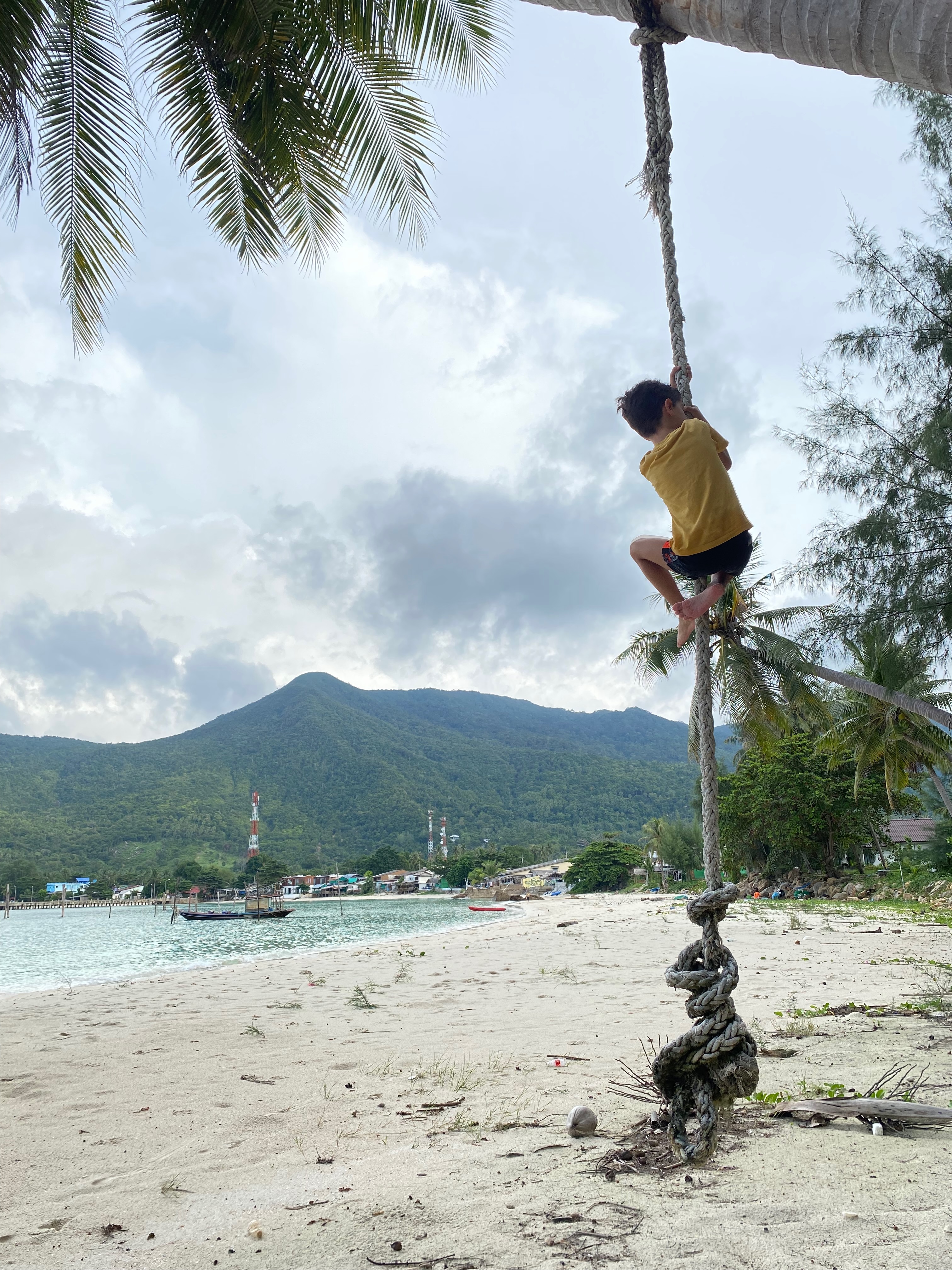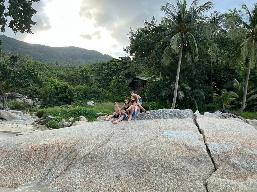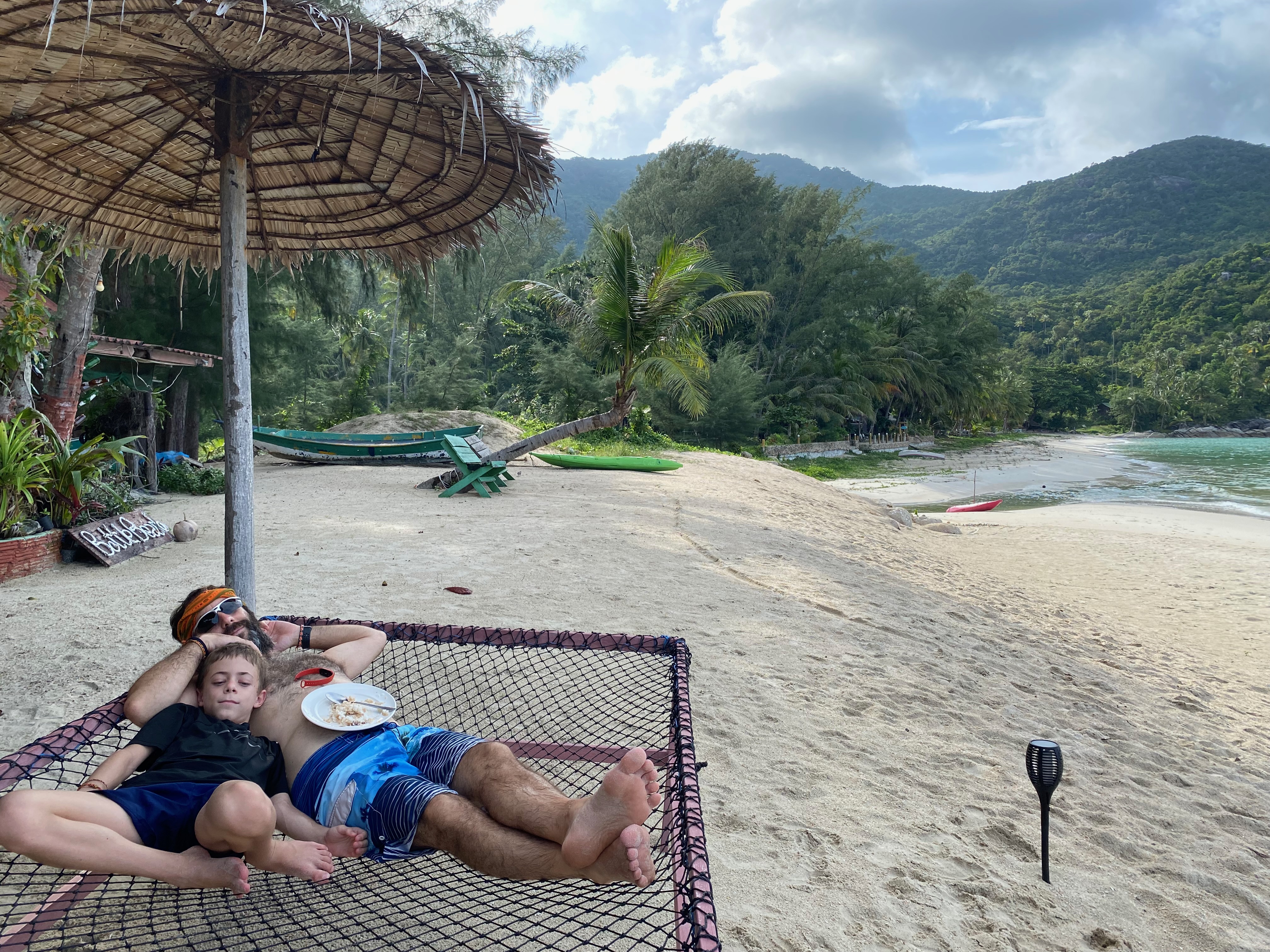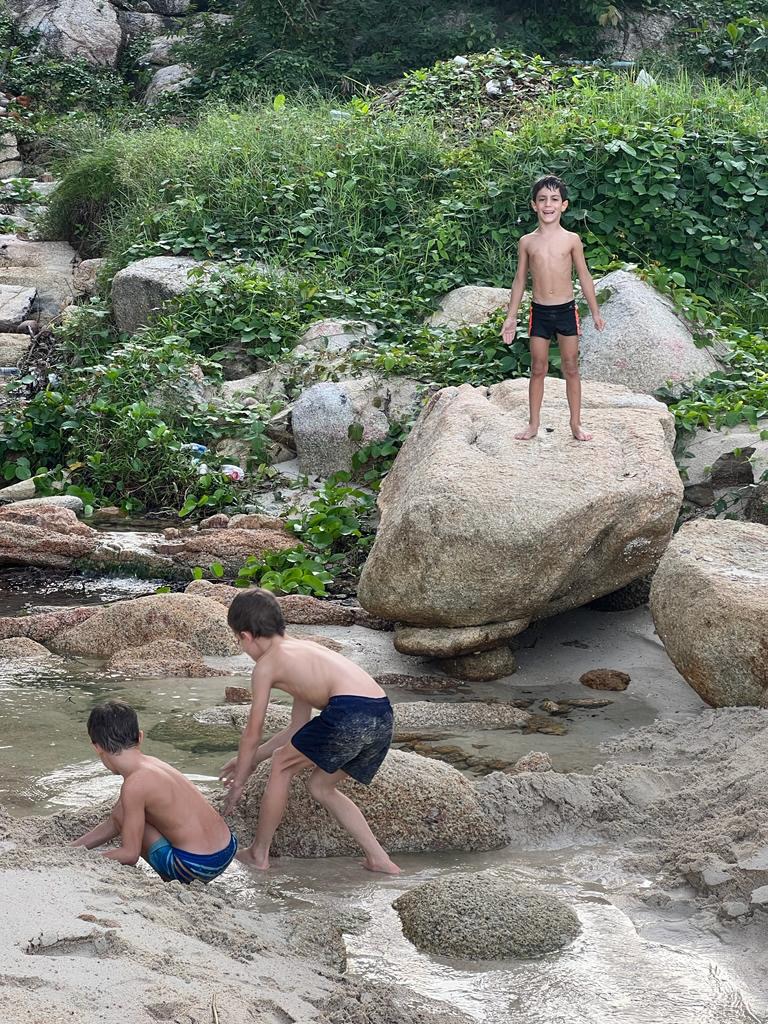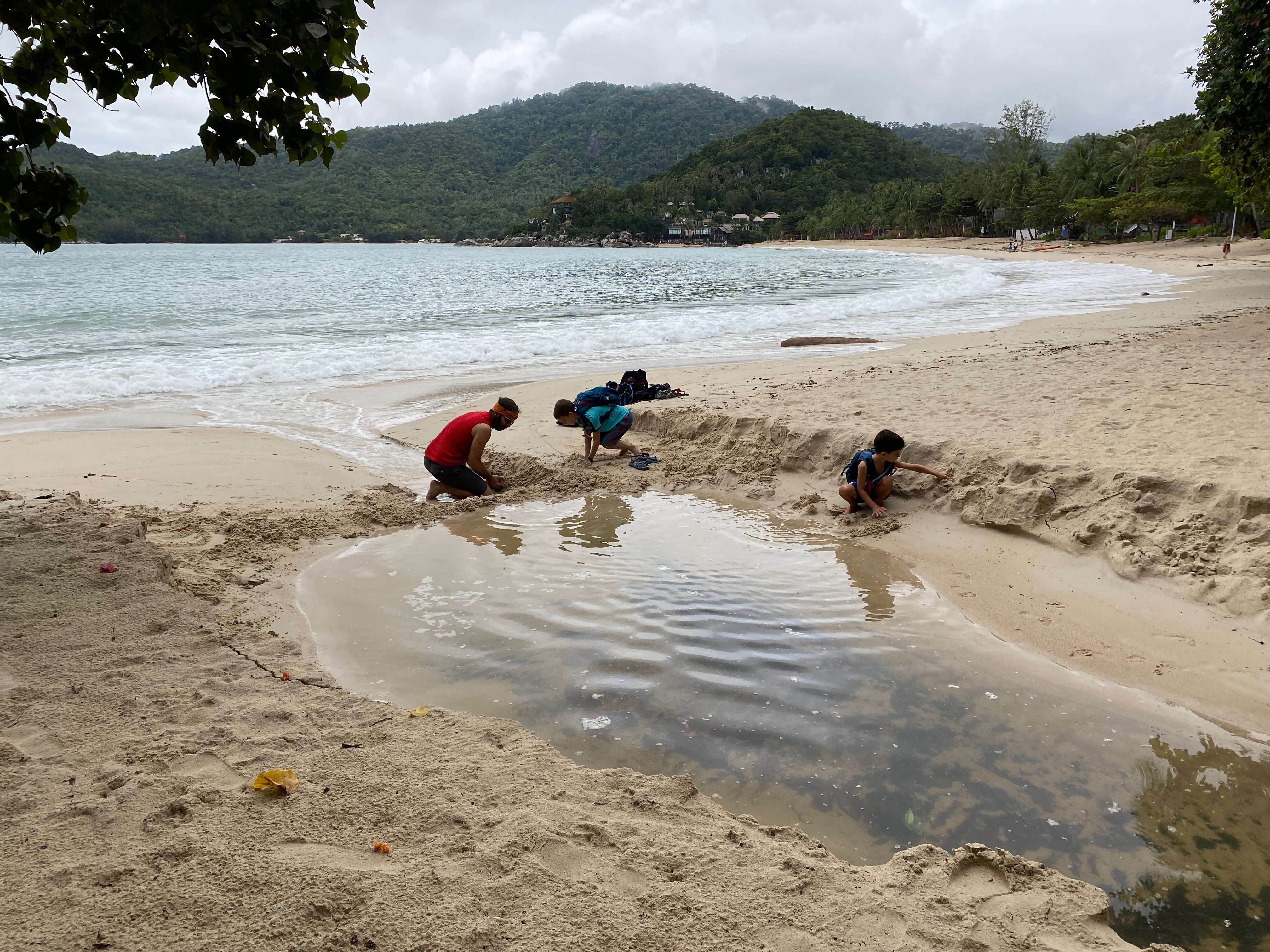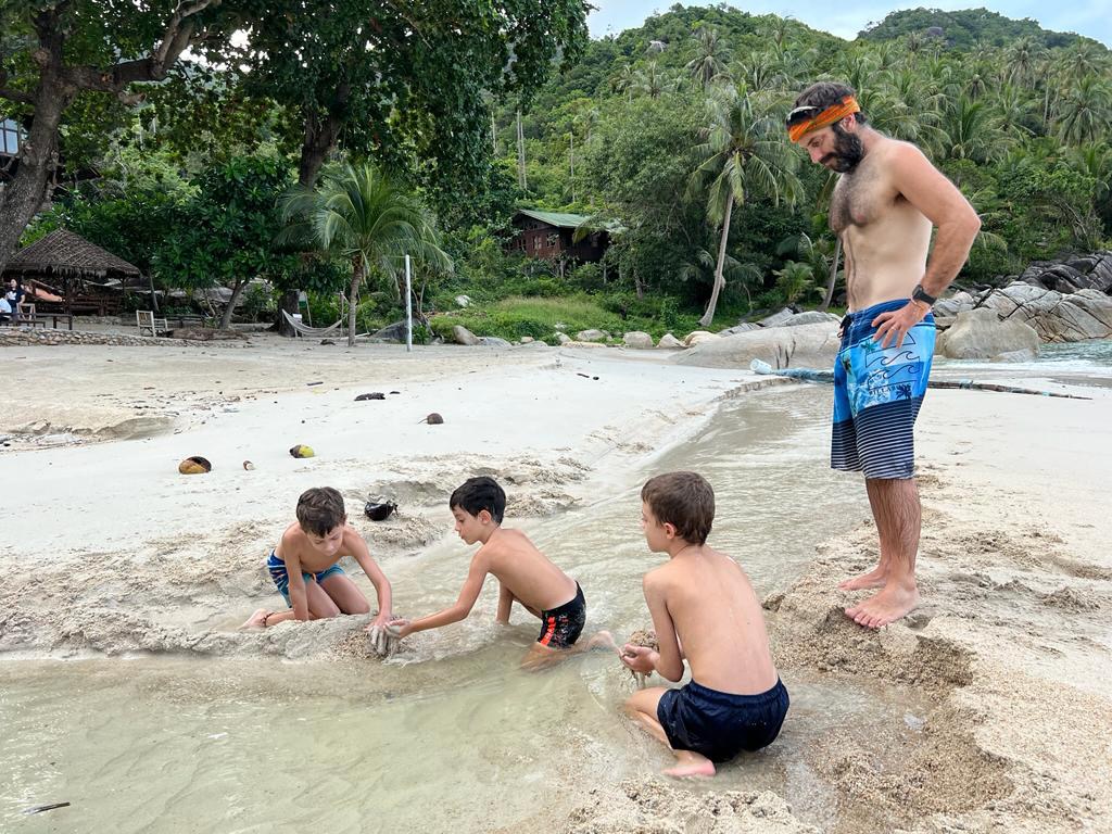 חוץ מזה לפני כמה ימים קצת חקרנו את הצד המזרחי של האי, שעד עכשיו לא ביקרתי בו אף פעם, כי הוא היה די לא נגיש, עכשיו הדרכים אליו סלולות וסבבה, עוברים בדרך על ההרים המדהימים שמקיפים אותנו. מטפסים בין העננים, בתוך הג׳ונגלים, עם הנוף המשגע. הגענו לחוף טונג נאי פאן, שבאופן מפתיע, גם הוא מאוד יפה.. התמקמנו באיזה ריזורט יוקרתי משהו ופגשנו שם לגמרי במקרה משפחה ישראלית שניסינו כבר כמה פעמים להיפגש איתה ושתינו איתם קוקטילים בזמן שהילדים בנו סכר.. באיזה שלב הבן של המשפחה השניה רצה להצטרף לבוני הסכרים שלנו אבל חזר בדמעות אחרי שכלבים משוטטים איימו עליו וכמעט תקפו.. אז הבנו שאולי הילדים בונים את הסכר טיפה רחוק מדי מאיתנו, וגל הלך לקרוא להם (ולשמור עליהם בדרך חזרה).. המצב של הכלבים בתאילנד השתפר פלאים לאורך השנים שיצא לי לבקר פה, אם פעם הם היו נראים מסכנים ומוזנחים, כיום יש כבר המון כלבי מחמד ולכולם יש זנב!! (מה שבכלל לא היה לפני כמה שנים) אבל עדיין ויש שאומרים בעיקר אחרי הקורונה שבה היו פחות אנשים באי, יש לא מעט כלבים משוטטים שהם פראיים ומאיימים וגם נושכים, אז צריך להזהר..