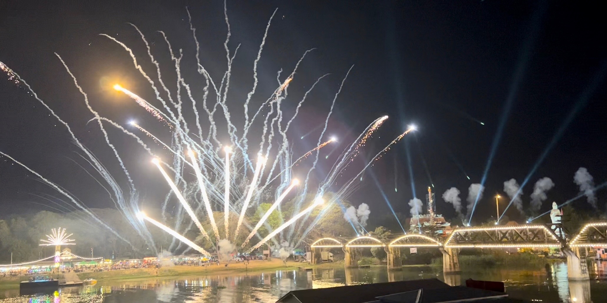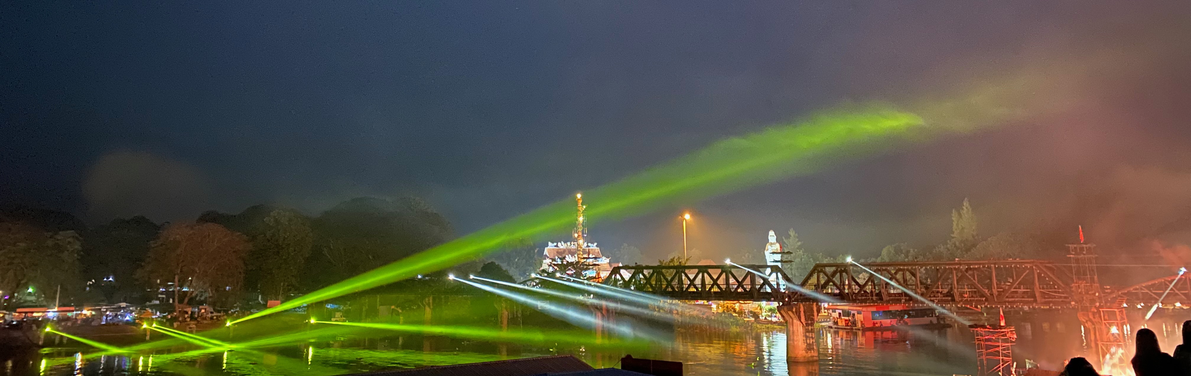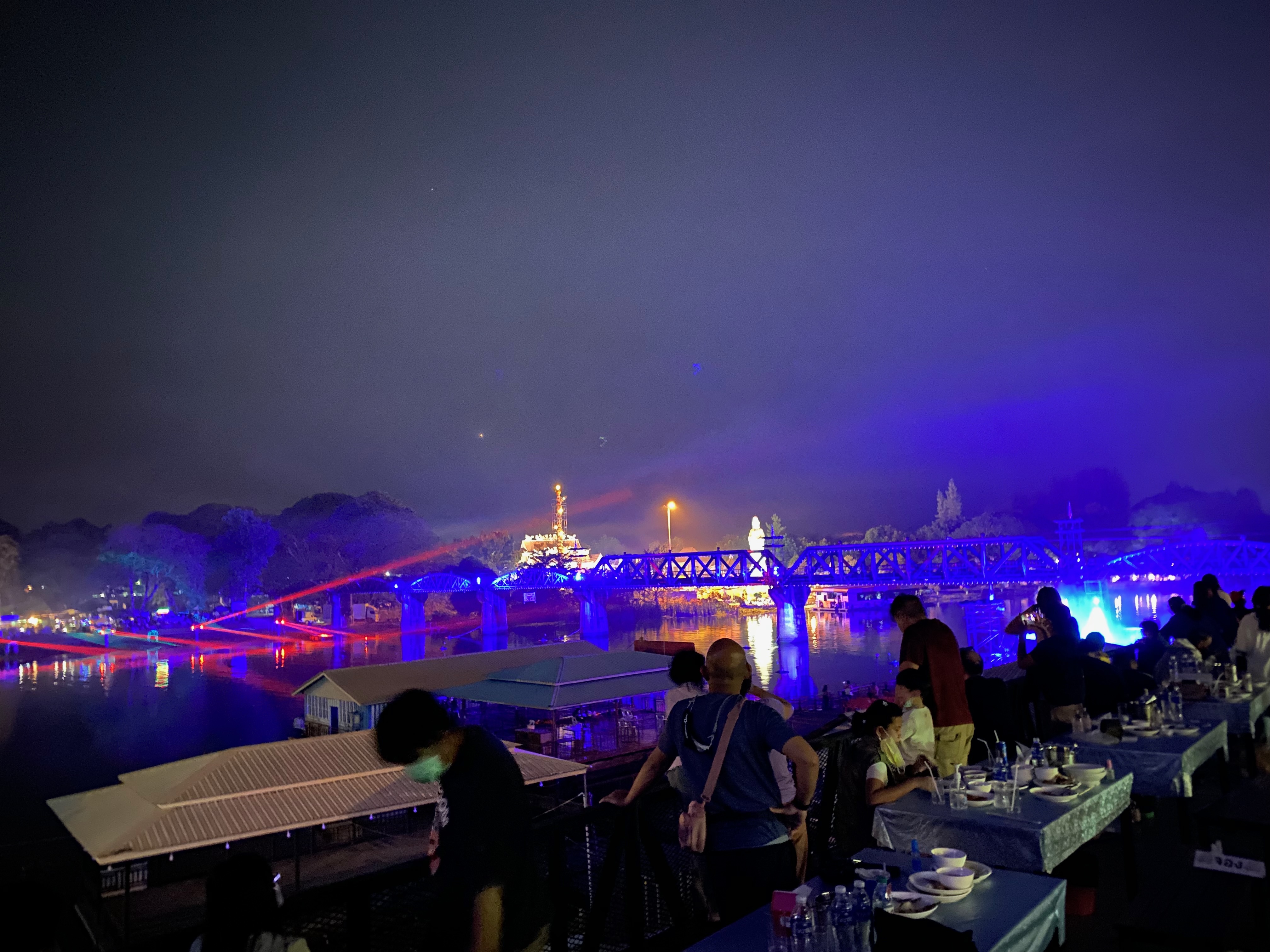 כשהגענו לאזור הפסטיבל הבנו שכרטיסים למופע כבר אין, אבל אפשר לצפות במסכי הענק שמקרינים עליהם. אנחנו בחרנו ללכת למסעדה שצפתה בדיוק על הגשר והזיקוקים, והגענו בדיוק כשהם התחילו. והיה די מלהיב ואחכ גם כבר די משעמם. ושמחנו שאנחנו לא בתוך המופע, כי הוא בתאילנדית ולא היינו מבינים, והילדים לא היו מבינים והיה יותר מביך לצאת משם לפני הסוף. בכל מקרה הילדים למדו קצת היסטוריה, מותאמת לגילם כמובן.