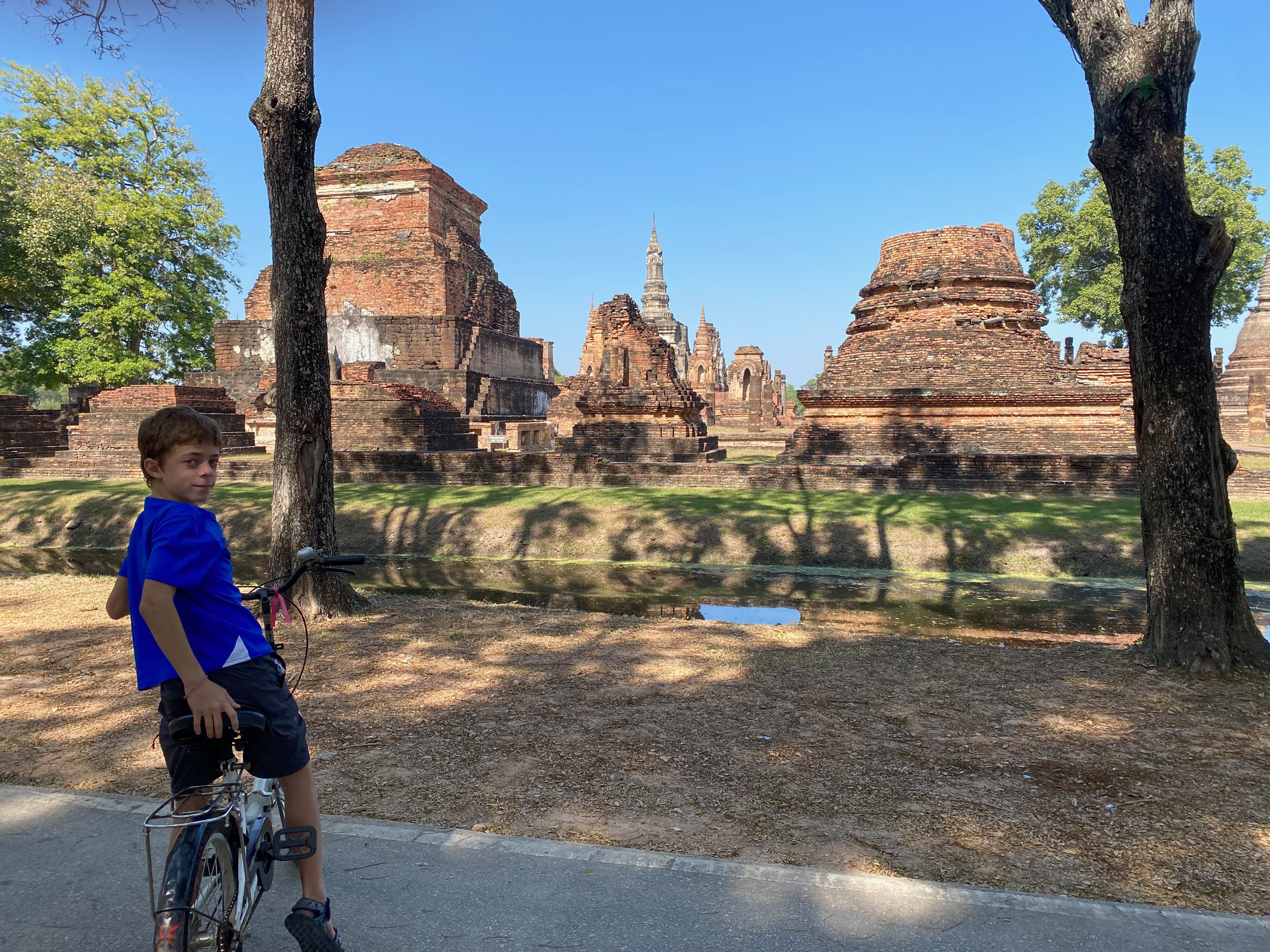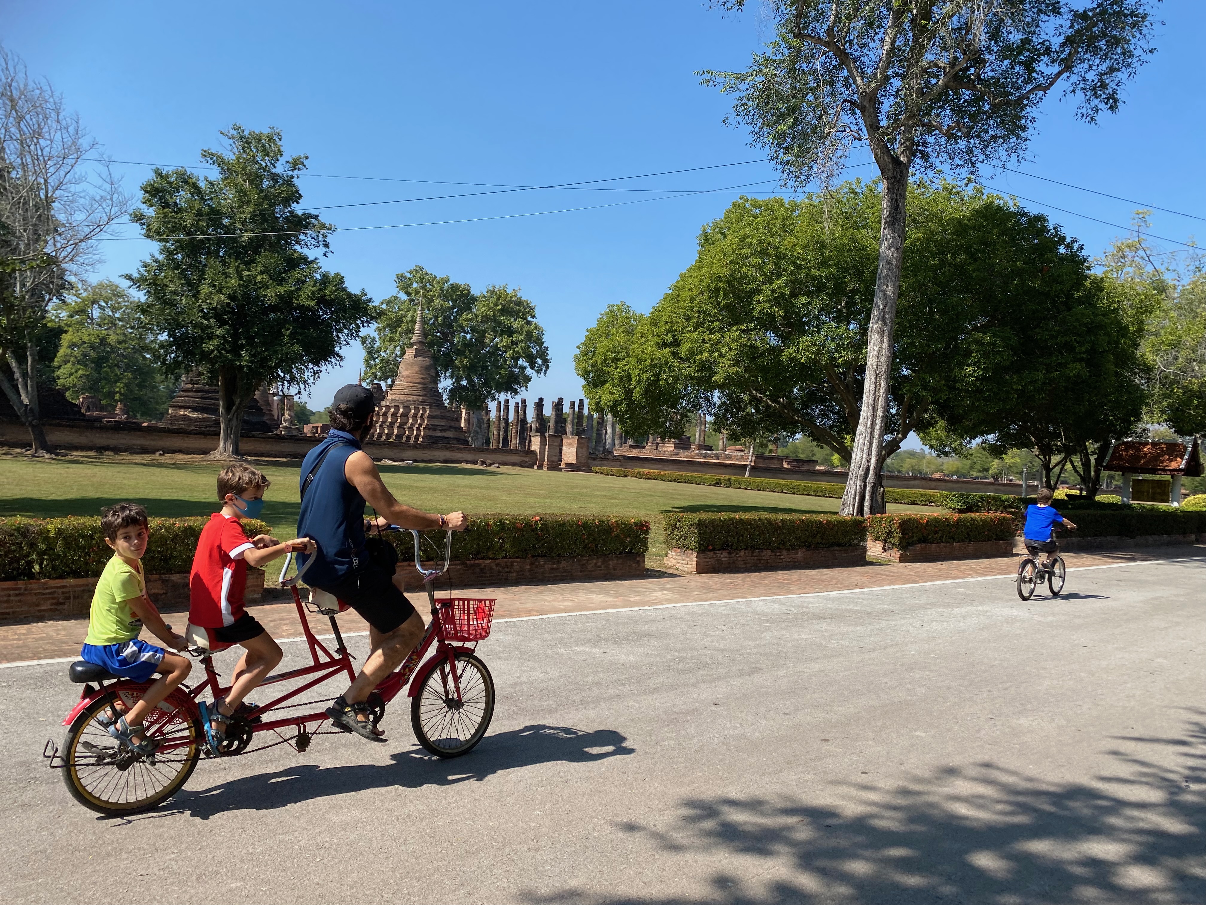 היות והגענו עד סוקותאי, החלטנו בכל זאת להשאר פה 2 לילות ולספוג את הקנס על האיחור בחידוש הויזה ולראות את העתיקות פה ורק אז להמשיך לצ׳אנג מאי למחרת. אבל עייפות החומר ניכרת בכל, הילדים לא הכי זרמו והכל הלך עם קושי ומועקה. עשינו טיול אופניים קצר בעתיקות, ממש יפה שם, עופר שבדיוק כששאלתי אותו יומיים קודם מה הוא הכי היה רוצה לעשות בטיול – זכה להגשים בדיוק את מה שהוא ביקש ולנסוע עם אבא באופניים של 2. אבל אז עידו נפל עם האופניים שלו, קיבל את הכידון בחזה, עם סימן יפה למזכרת. ואנחנו ויתרנו על המשך הטיול, החזרנו את האופניים והלכנו לאכול צהריים במסעדה מתוקה ממש מחוץ לפארק העתיקות. עידו השתפר במהרה כמו הספורטאי התותח שהוא, והאנרגיות התחדשו.