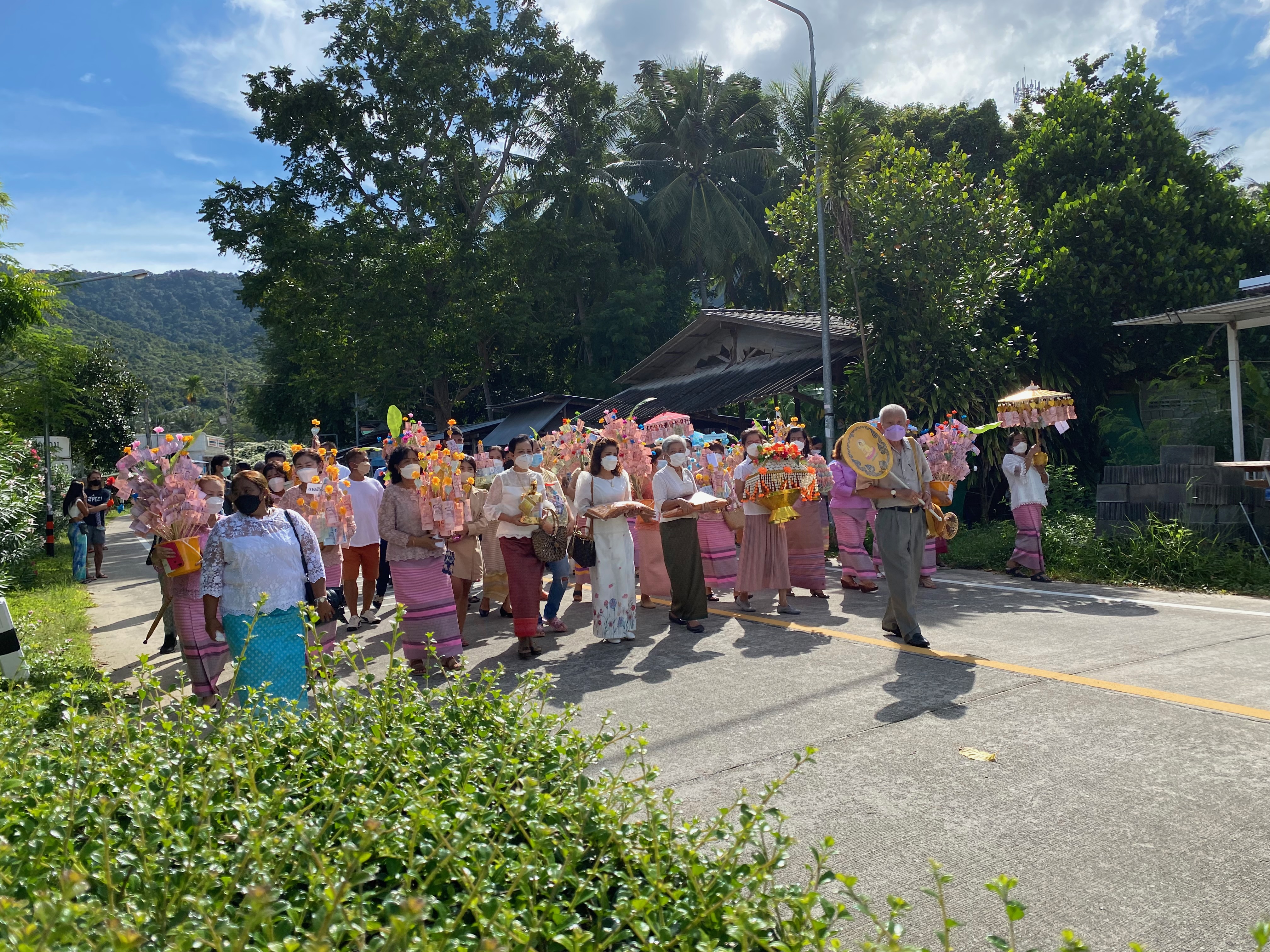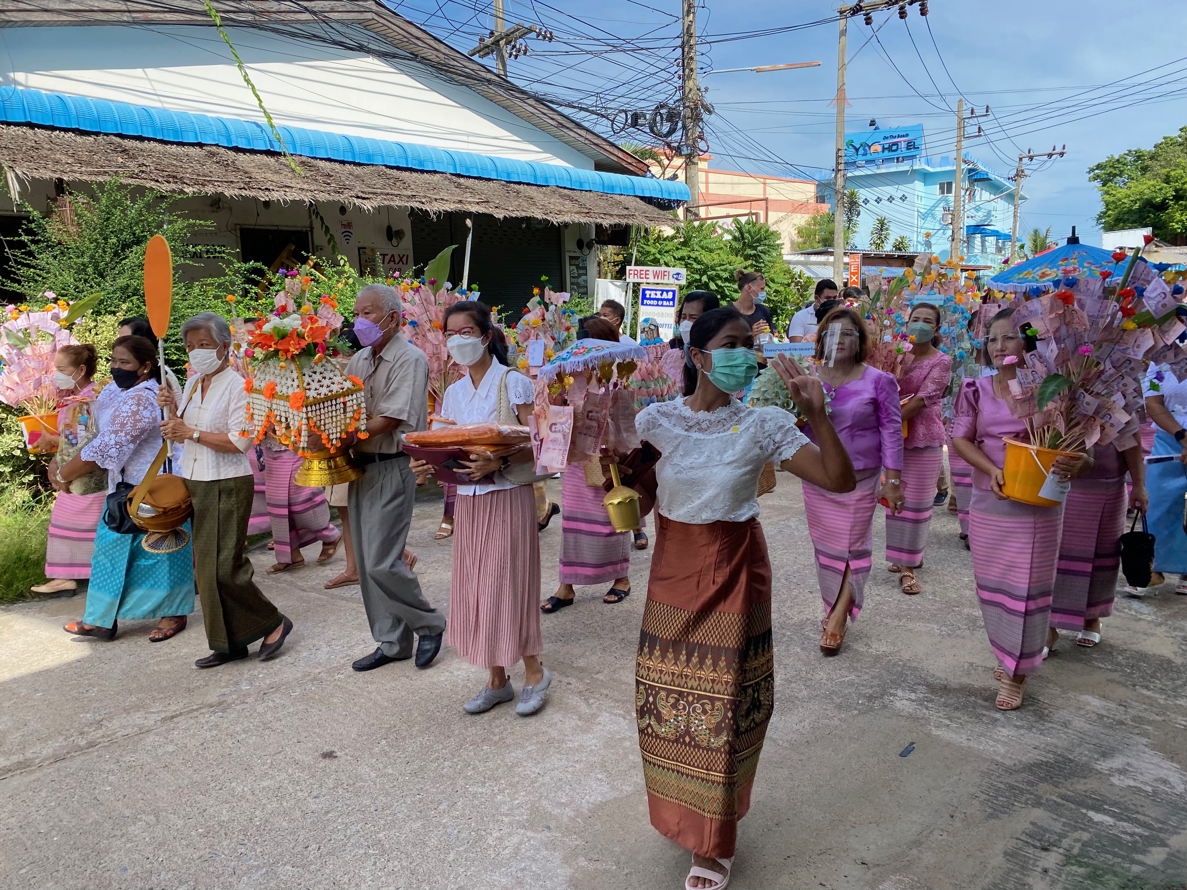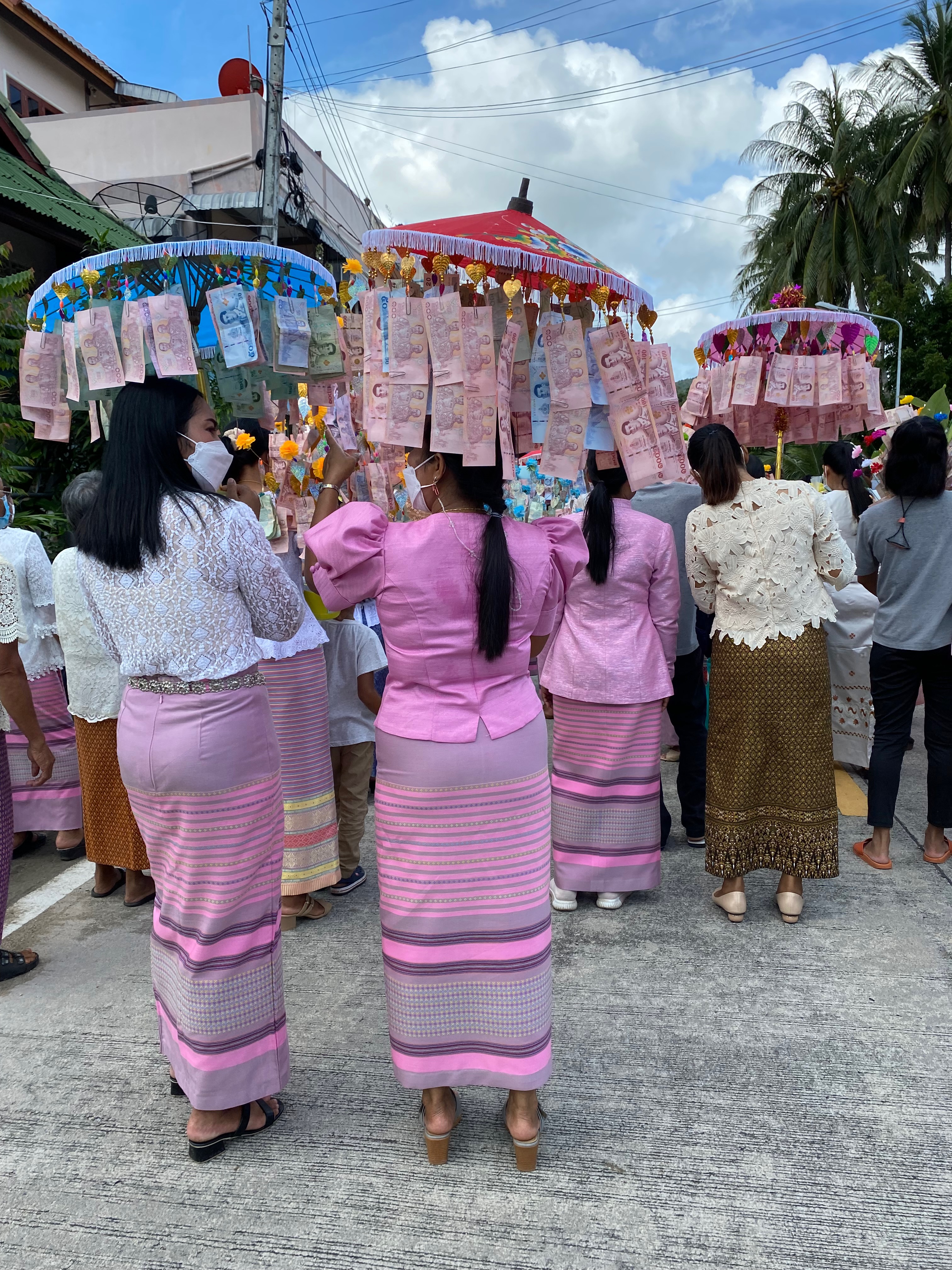 וגיליתי שמחוץ למלון שלנו ממש, מתחילה תהלוכה. בנות לבושות יפה מתקדמות תוך ריקוד, גברים מתופפים ועוד נשים הולכות עם סוג של כדים בתוכם פסלי עצים קטנים שעליהם שטרות של כסף. חזרתי מהר לחדר וצירפתי אלי את שני הקטנים, בזמן שגל העיר את עידו והם הצטרפו בהמשך.. מסתבר שהיום הוא יום המקדש פה, ועצי הכסף הם תרומות למקדש. התהלוכה התקדמה בריקודים למקדש שם המשיכה לרקוד, והיה מקסים.