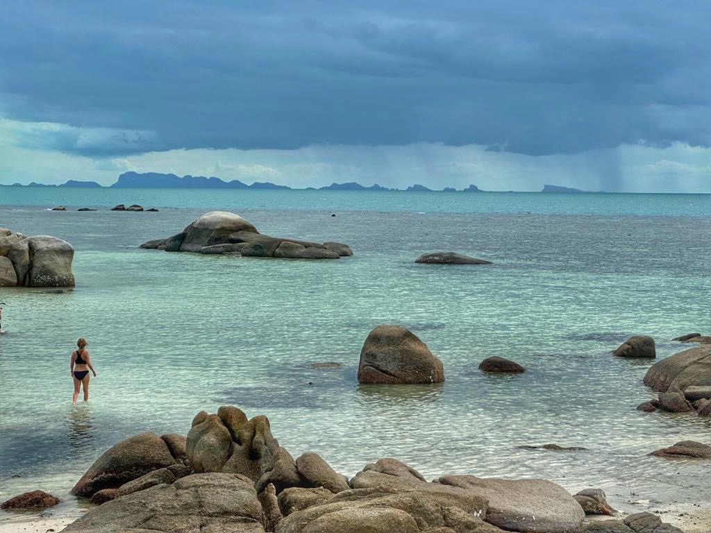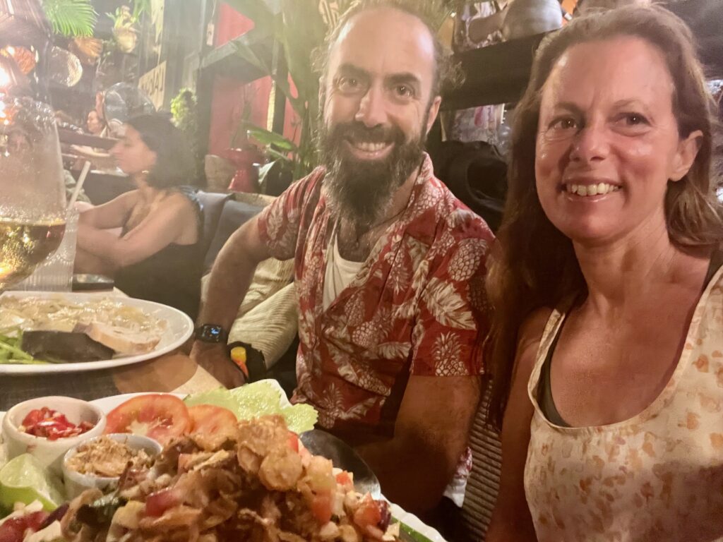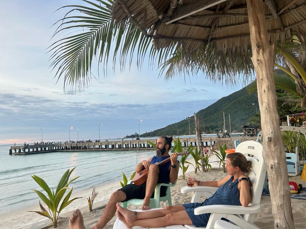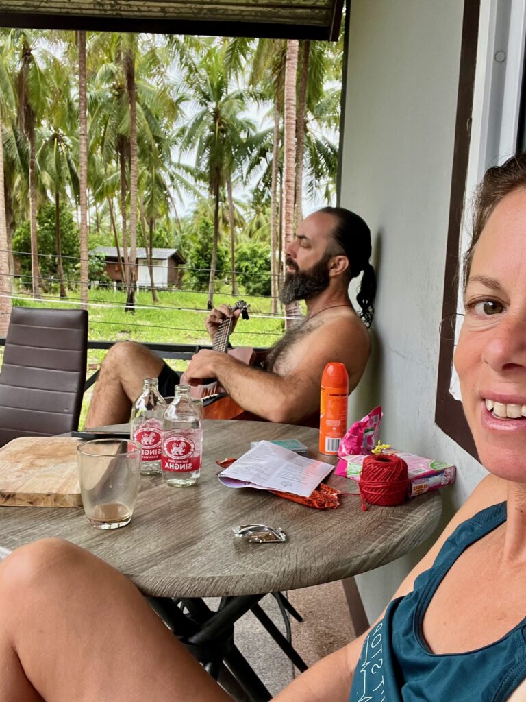 מה עוד הספקנו? חגגנו יום נישואים, ביום של סופה מטורפת.. כזו שכל האי מדבר עליה אחר כך.. של עצים שנופלים, וגגות שעפים, יצאנו על הטוסטוס למסעדה שהיתה סגורה, כי לא היה חשמל בכפר שלה, בגלל הסופה.. ולעוד אחת אחרת שגם בה לא היה חשמל, עד שהגענו בסוף במקרה למסעדה גאורגית שבכלל לא ידענו שקיימת בטונג סאלה, ה׳עיר הגדולה׳, והיה בדיוק איך שהיה צריך להיות. ומשם המשכנו למעגל שירה מקסים ומיוחד שמעביר צבי, ישראלי, שגר פה ועשה מעגלי שירה מקסימים ושאחכ גל המשיך איתו לשיעורים פרטיים בשירה ונגינה, שהובילו אותו לעמוד על הבמה בסימפל באר ולנגן ולשיר בכיף שלו עם החבר׳ה הכי מוכשרים באי.. מדהים!